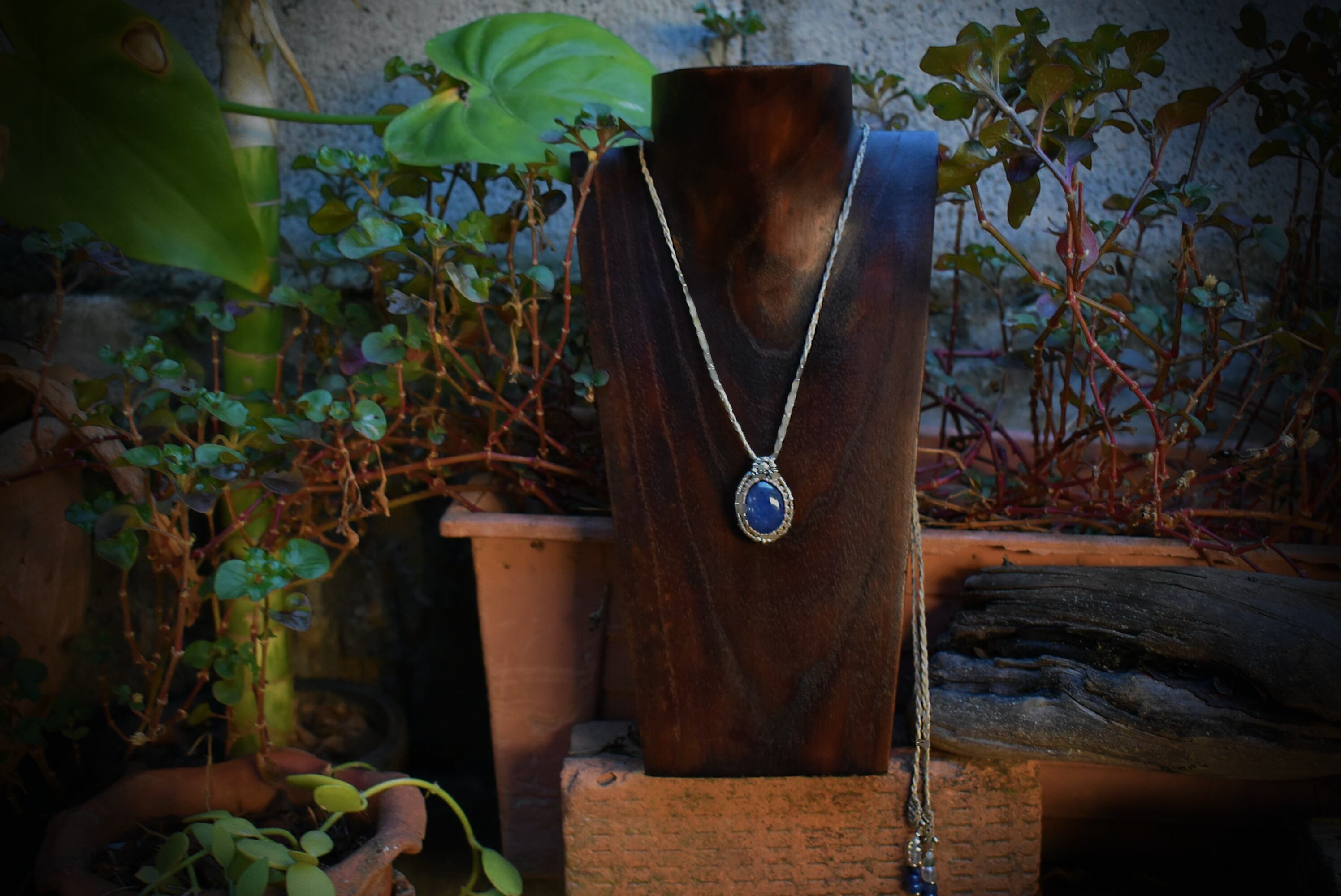 主張あるブルーのルースにカレンシルバー92.5ビーズを使用して、どのようなシーンでも身につけていただけるペンダントを目指して仕上げました。