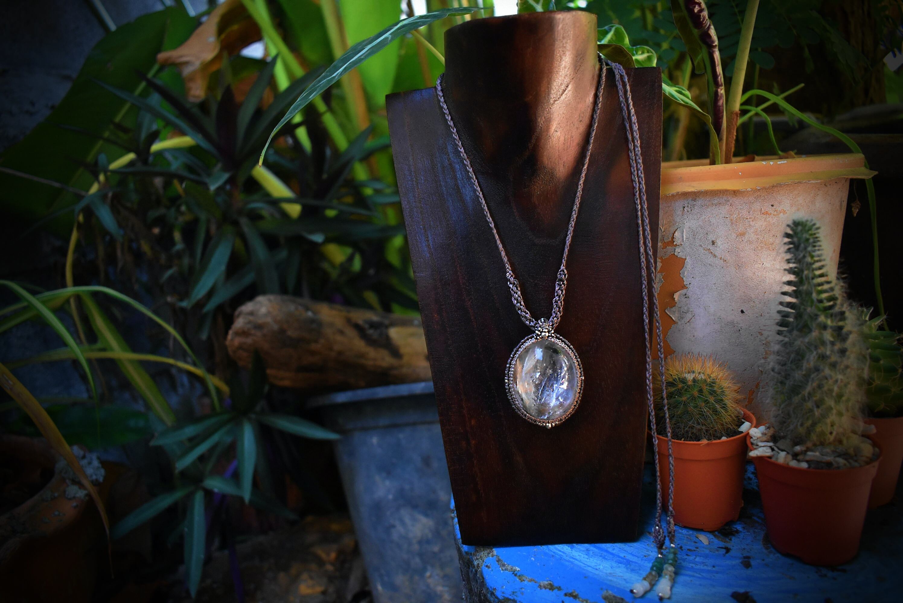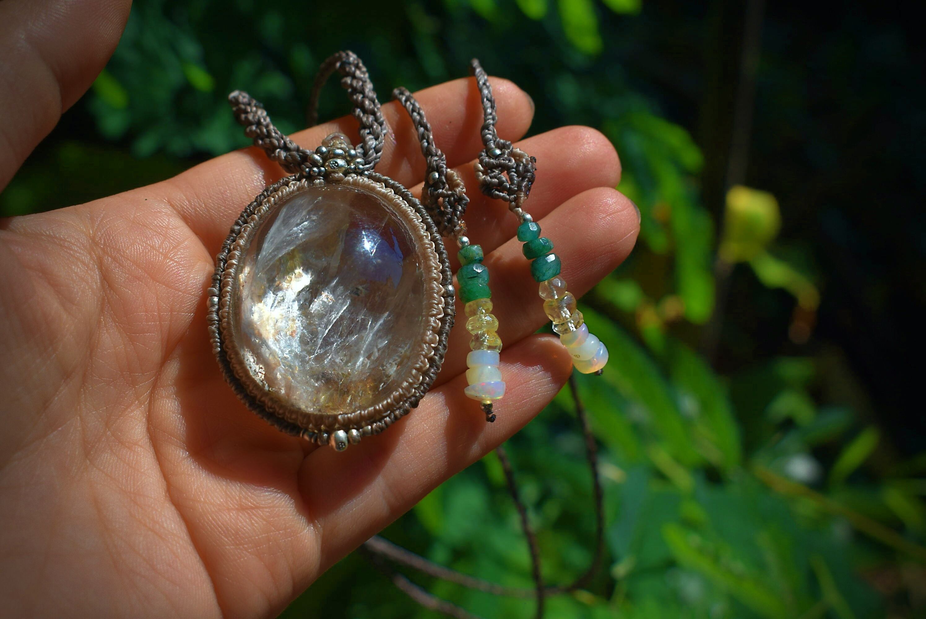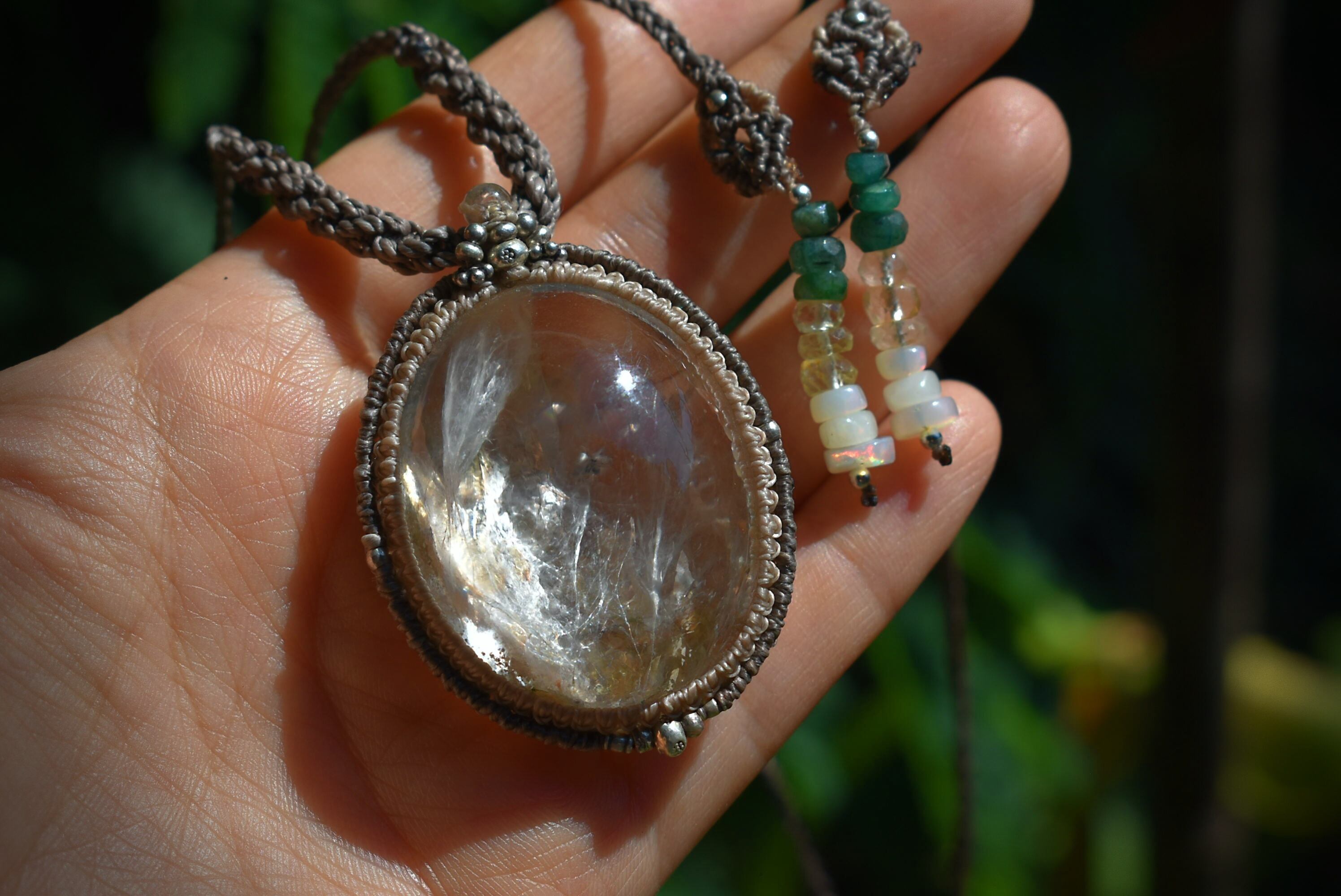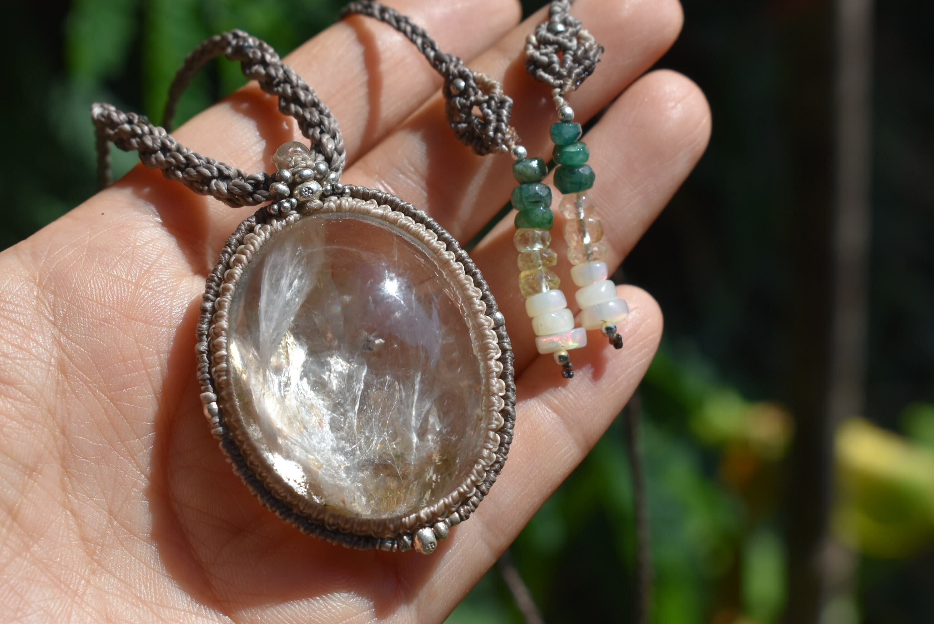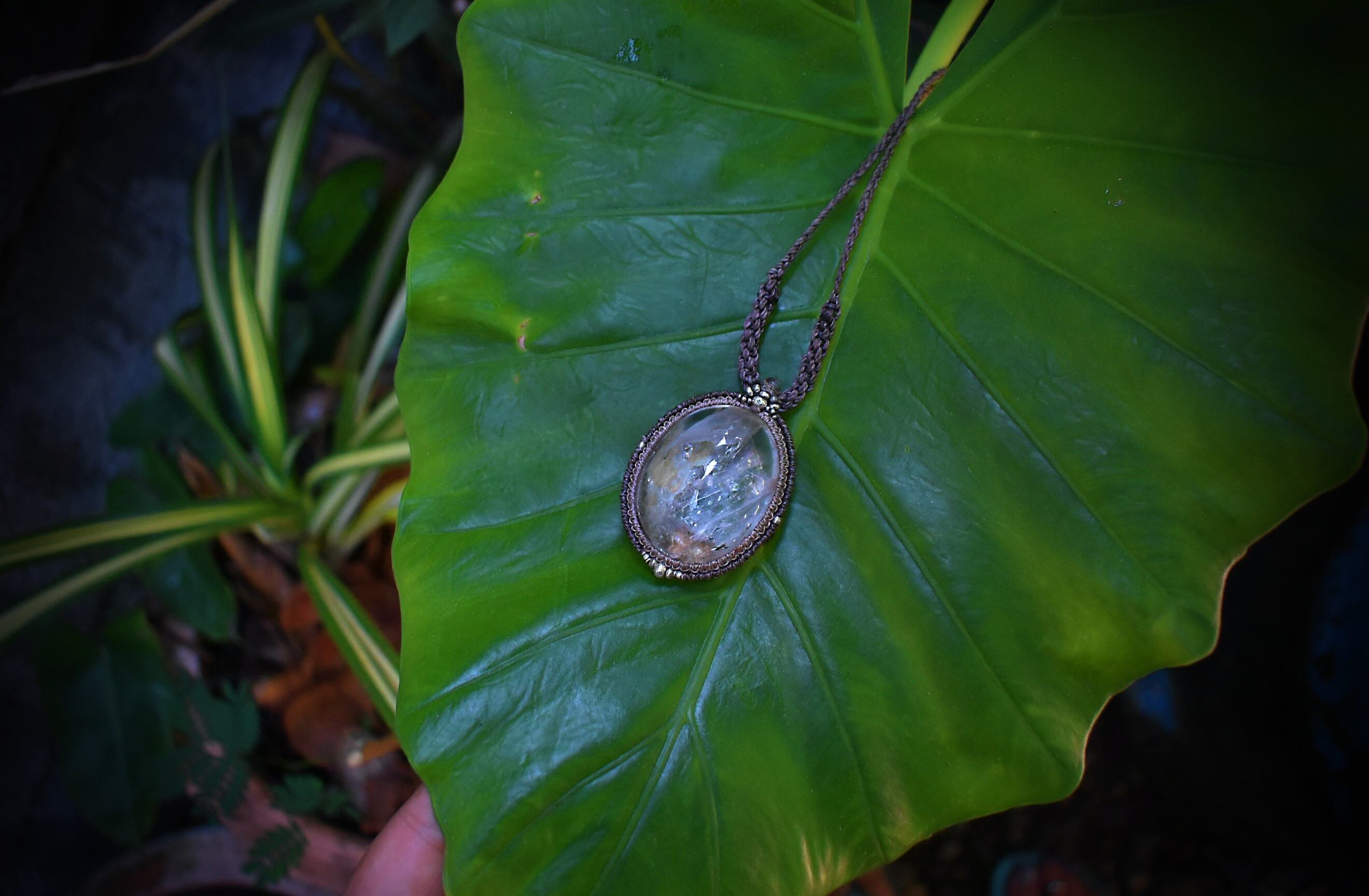 虹入り★深い水晶の雪化粧★ホワイトガーデンクォーツ マクラメシンプルペンダント hgam001