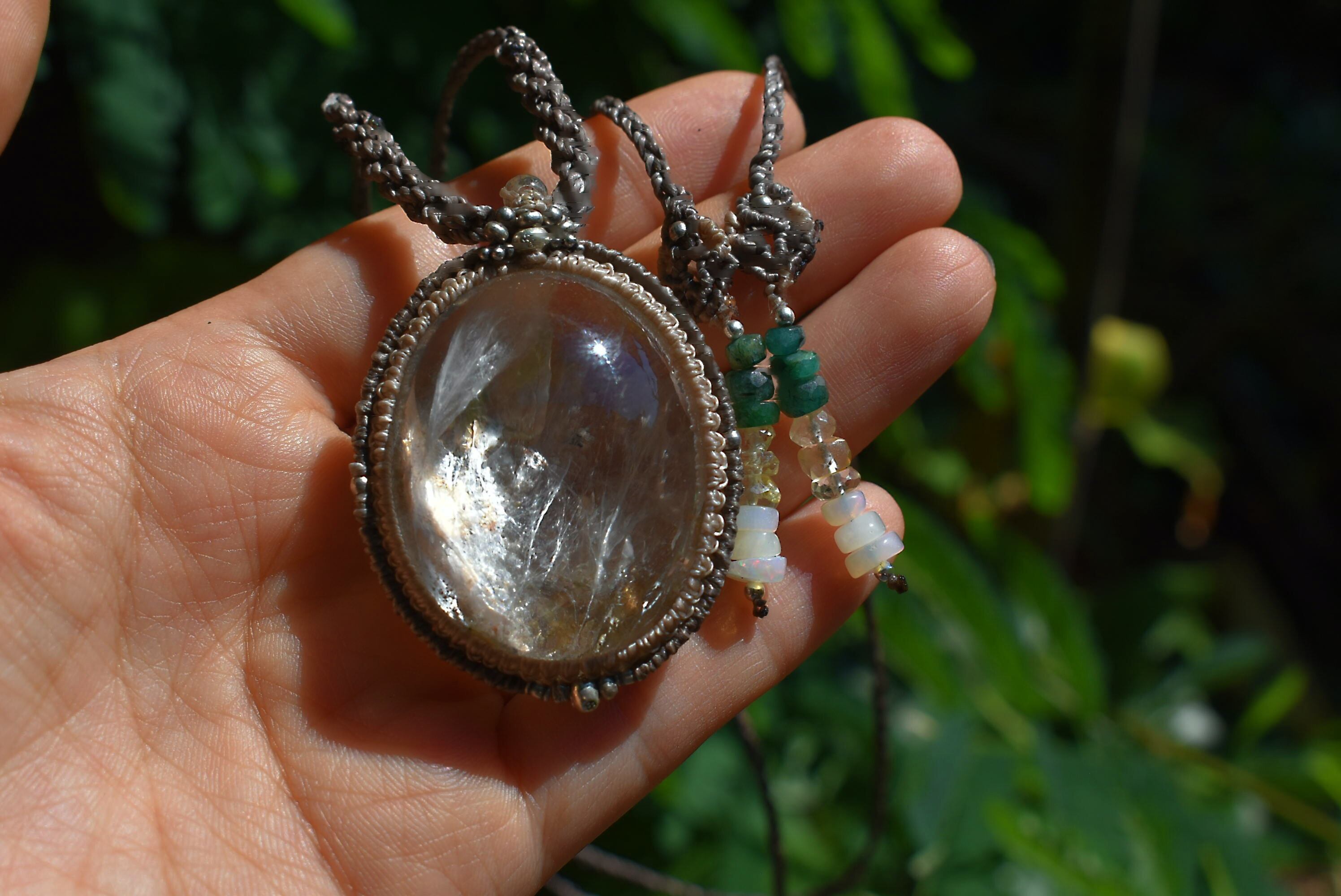 このたびのガーデンクォーツの世界は白い蜘蛛の巣の中にほんのり虹インクルージョンが入り込んでいるクォーツインクォーツとも見てとれる内包物が美しい透明度の高いホワイトガーデンクォーツです。ボリュームあるサイズ感と美しく磨き上げられた研磨が品質の良さを感じさせてくれる特別なもの。