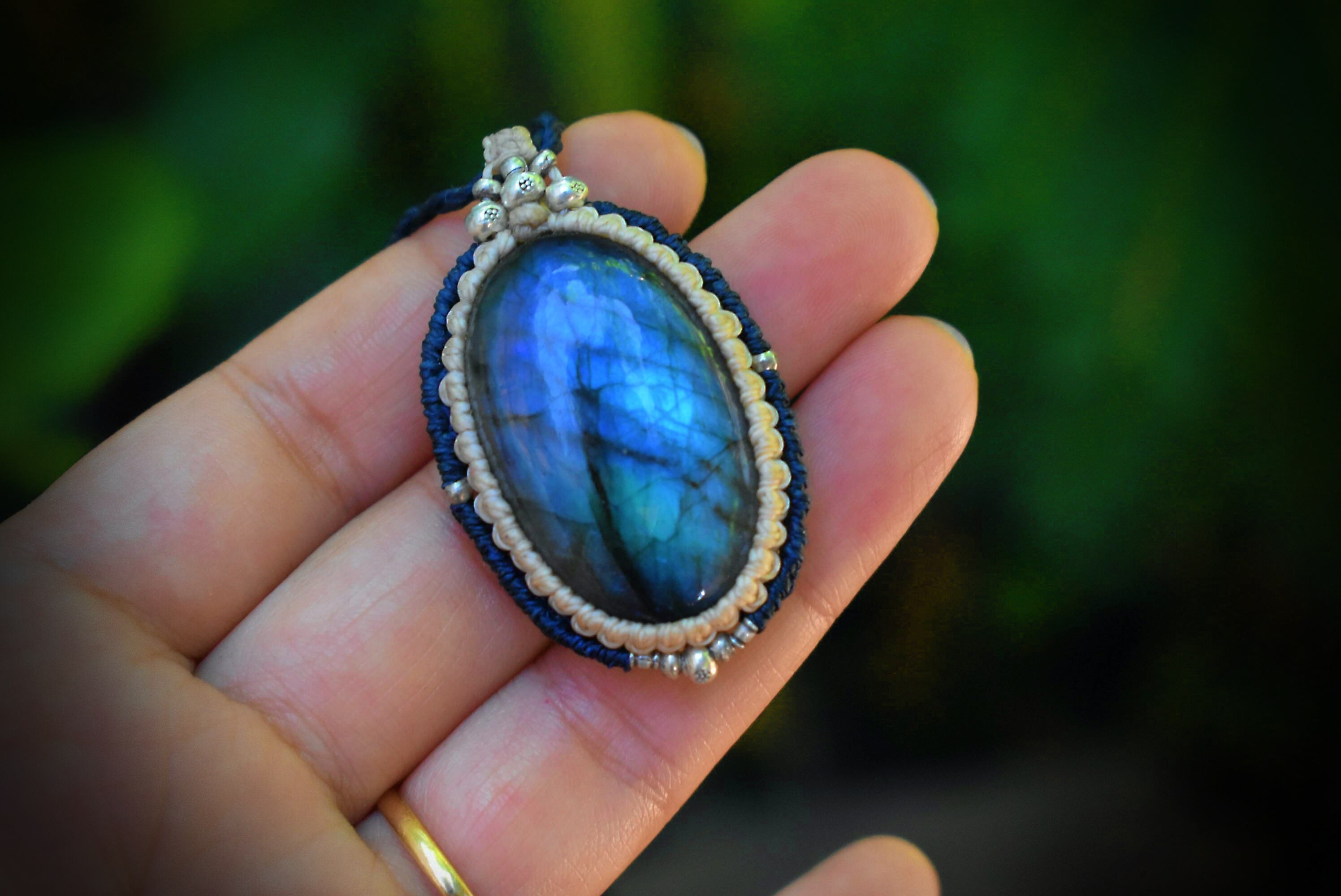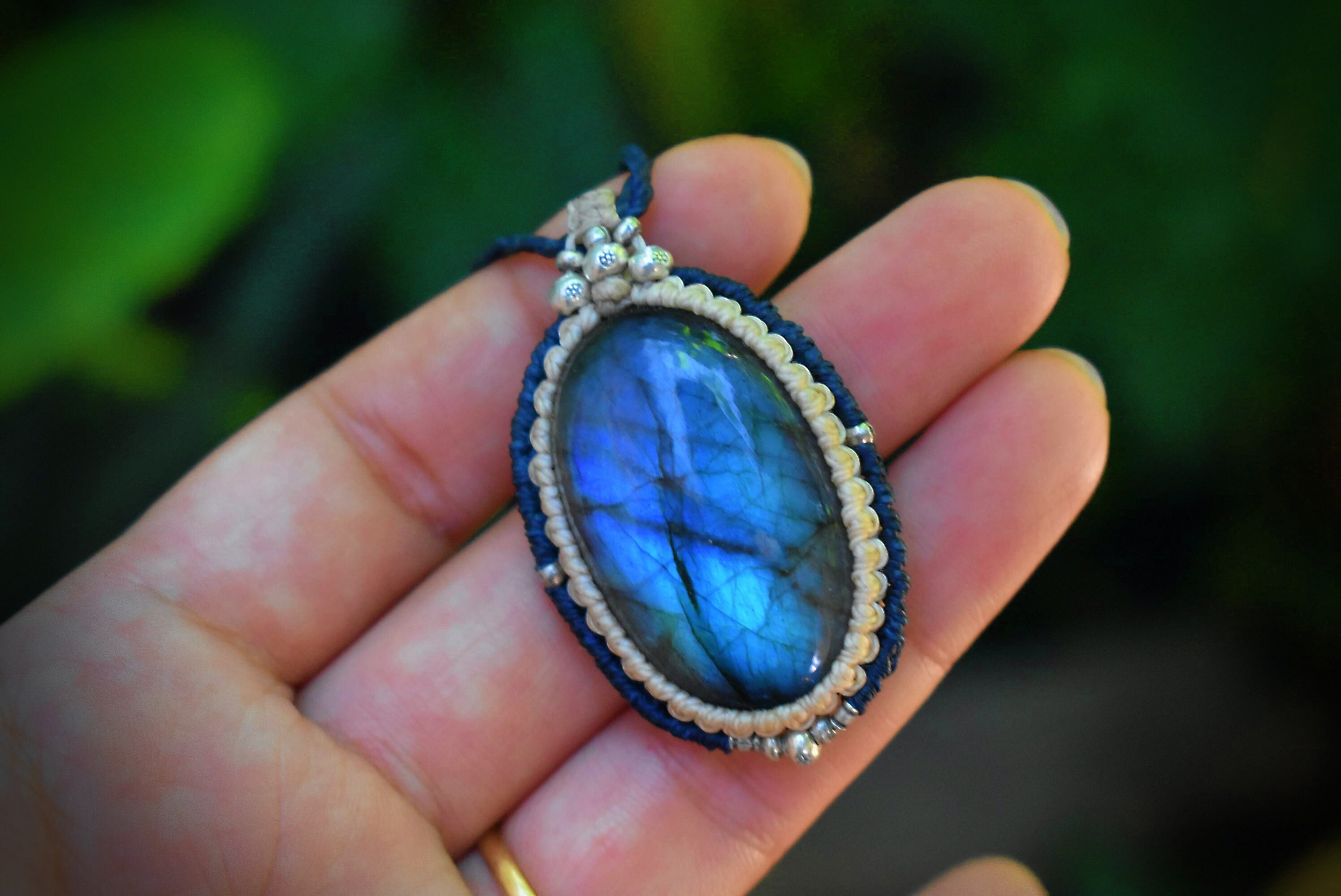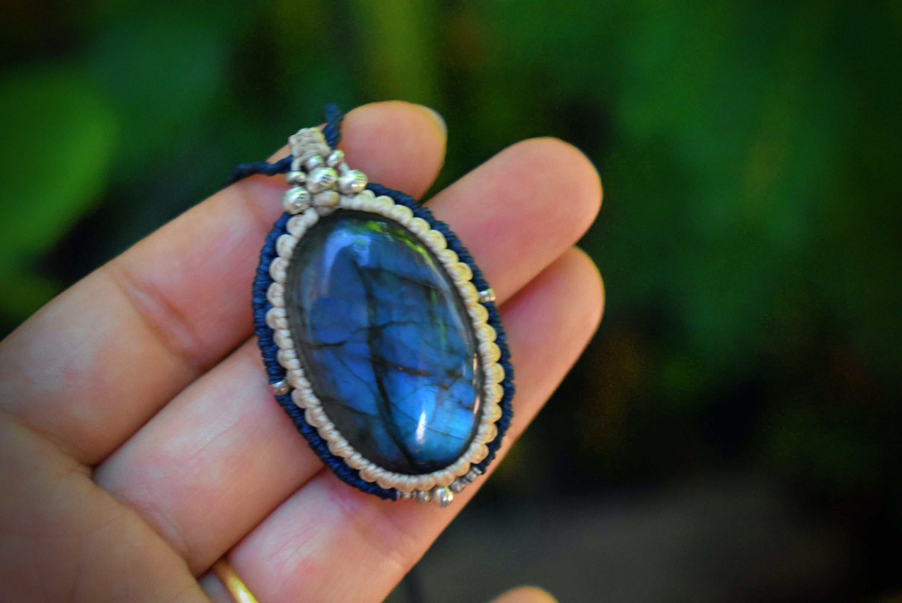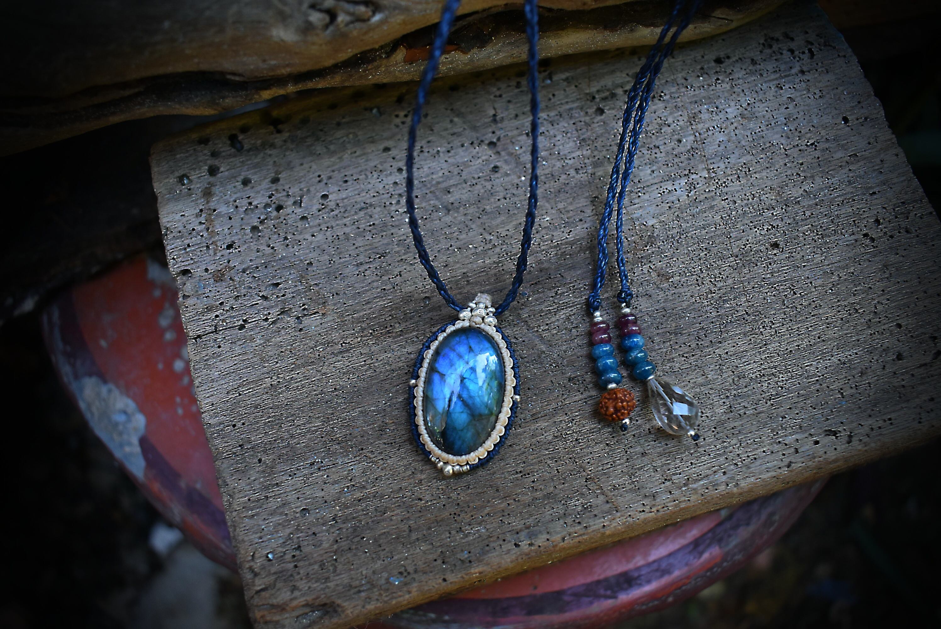 蒼い輝き★ブルーラブラドライト シンプルマクラメペンダントlabm001