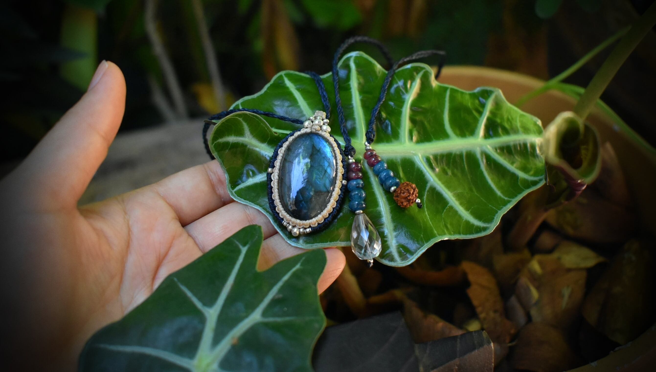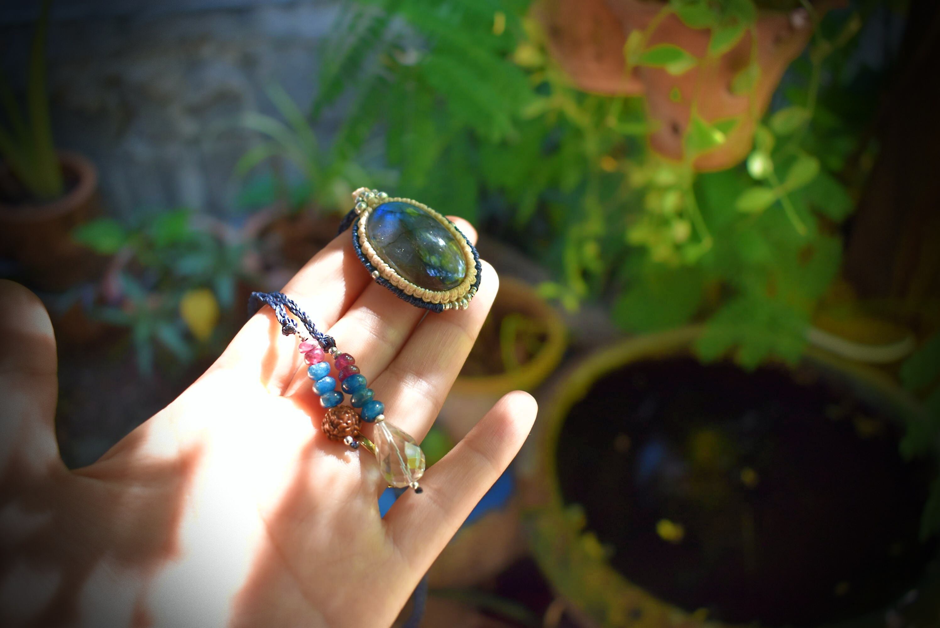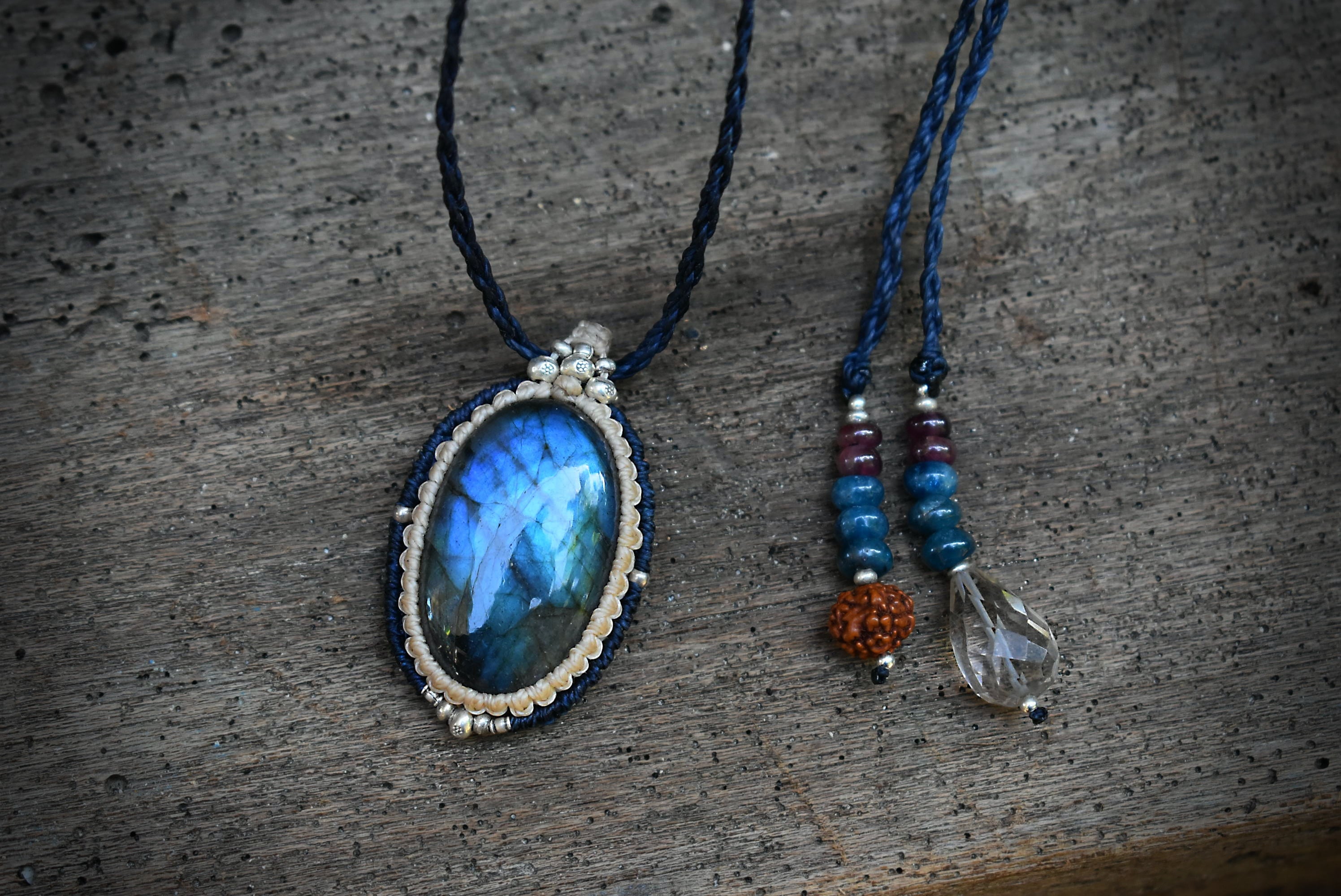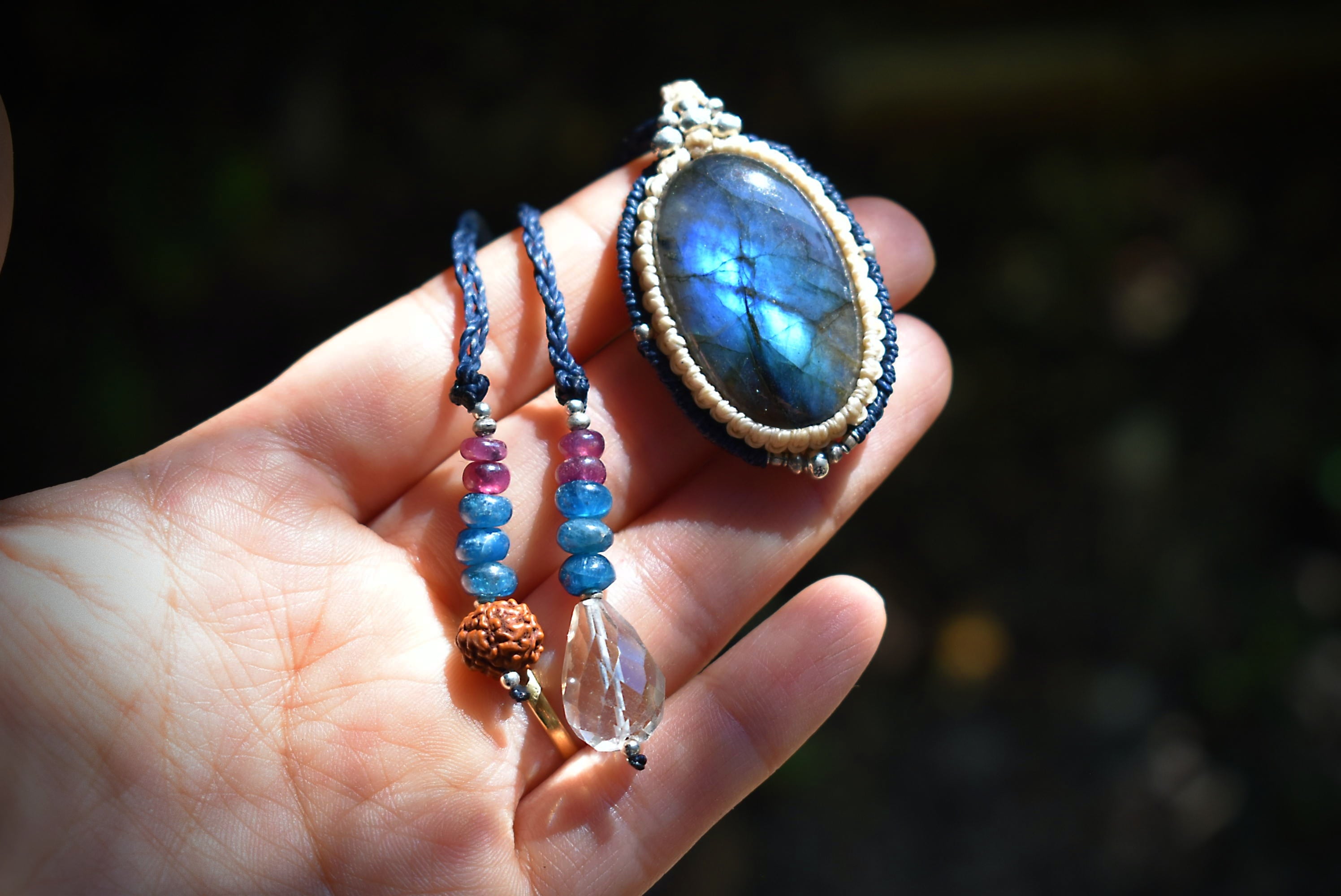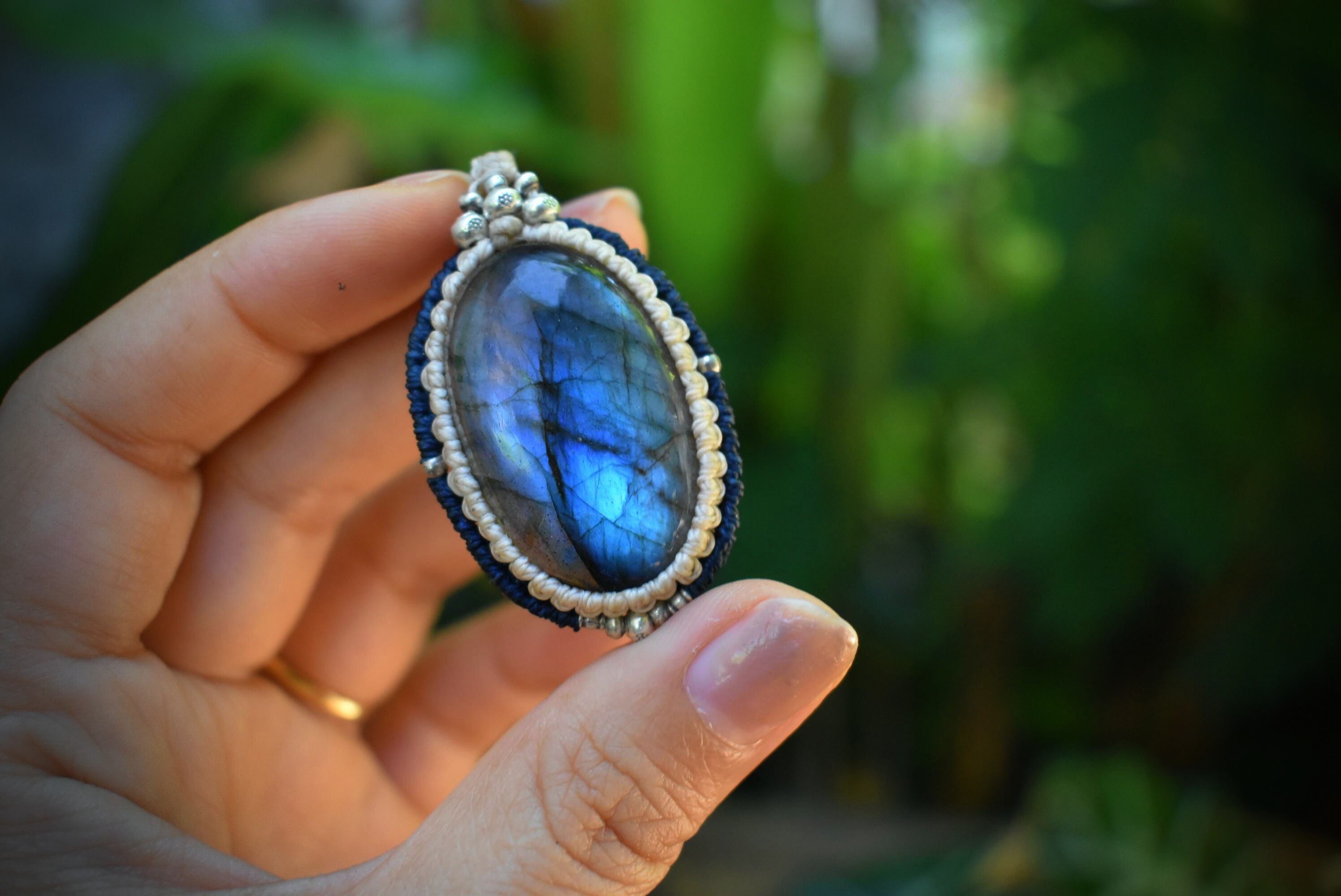 蒼い輝き★ブルーラブラドライト シンプルマクラメペンダントlabm001