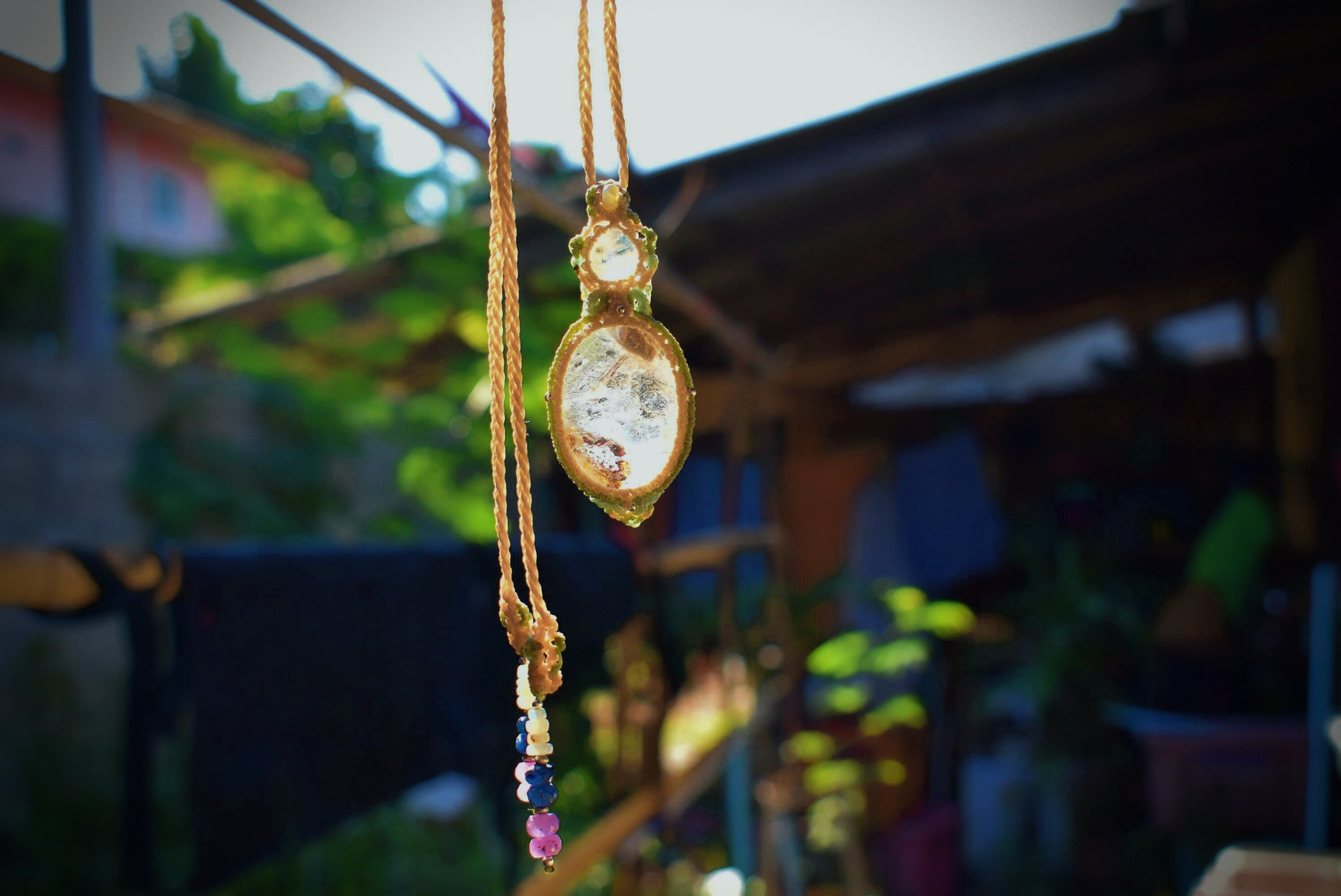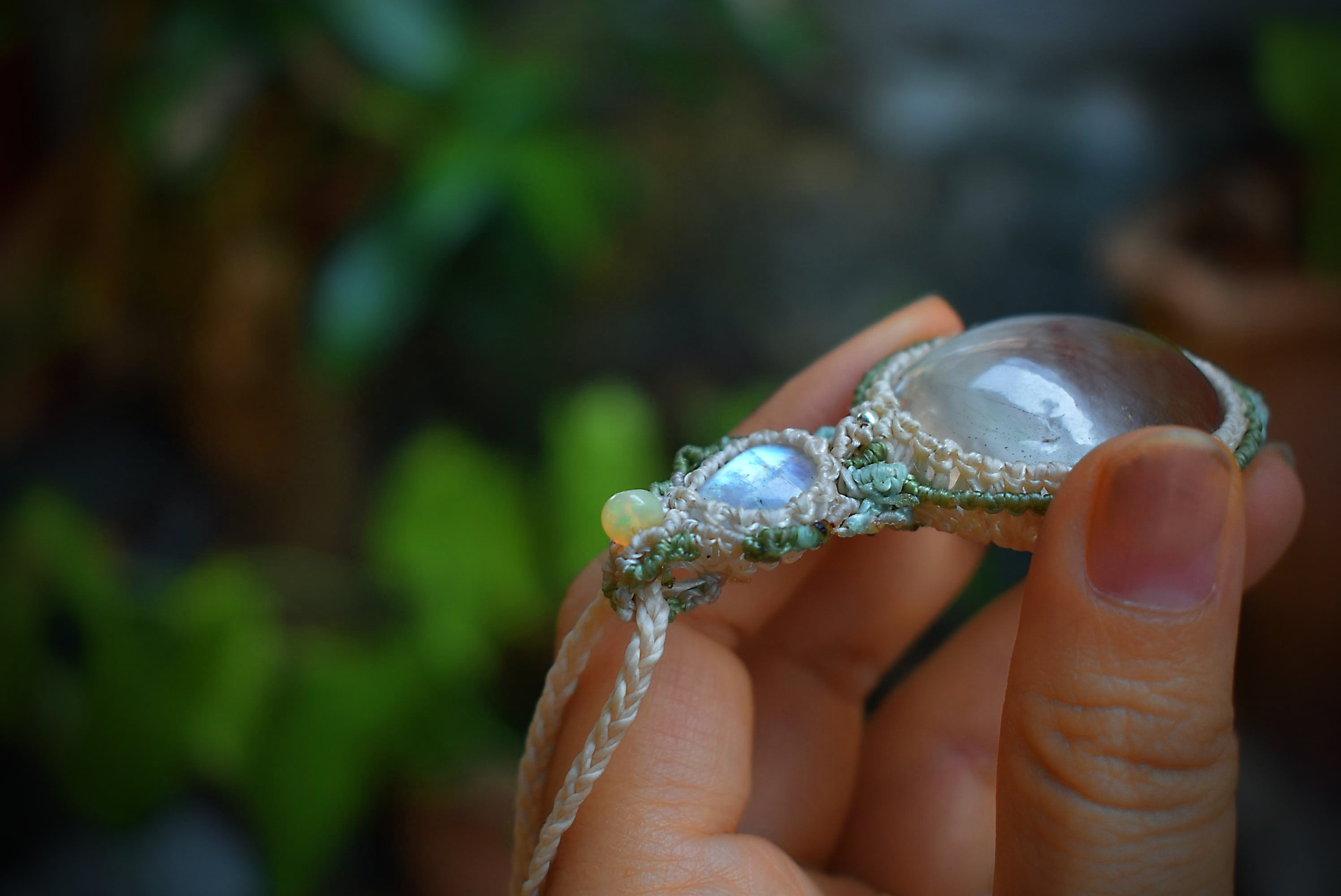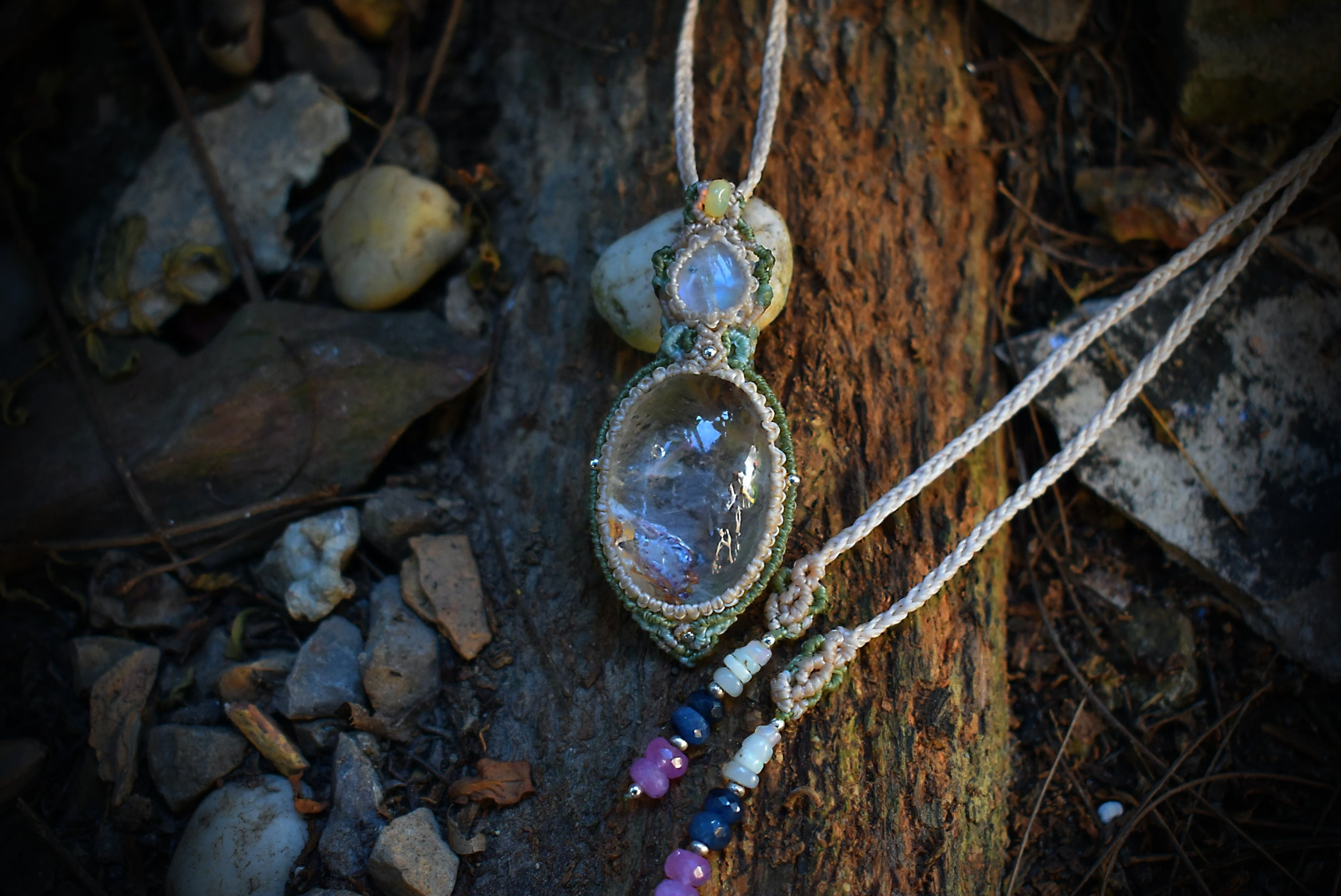 ブルーカラーの中にほんのり川の流れのように入り込んだレインボームーンストーン(ホワイトラブラドライト)、そしてクォーツインとも見てとることができる、透明感とボリュームある水晶の中の内包物が個性的なピンクガーデンクォーツ。艶のある透明感と水晶の中を泳ぐように見てとれる内包物がまさに不思議で美しい..2つの奇跡をひとつに、マクラメ編み装飾にてペンダントに仕上げました。トップには遊色を楽しむことができるオパールビーズで全体を柔らかい春色の雰囲気に仕上げました。