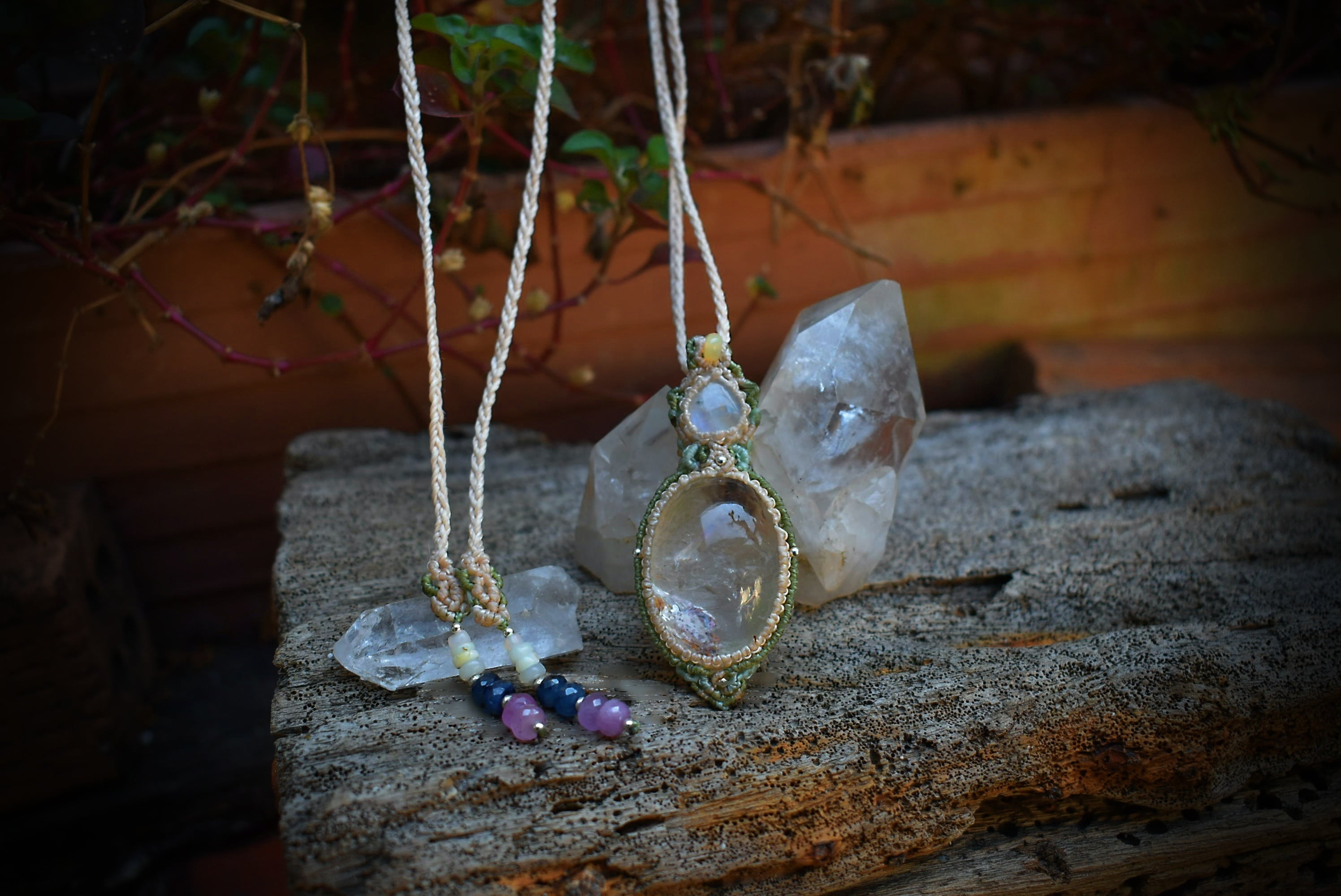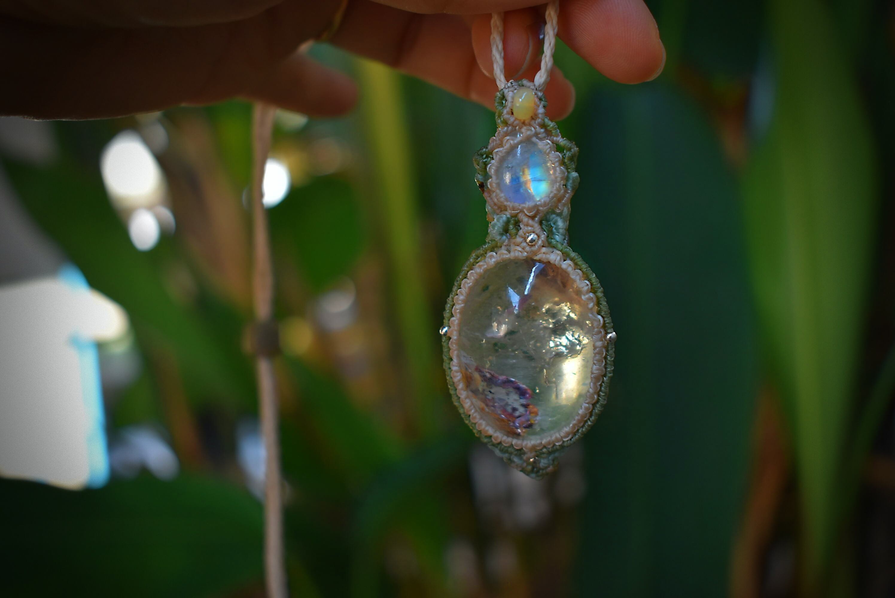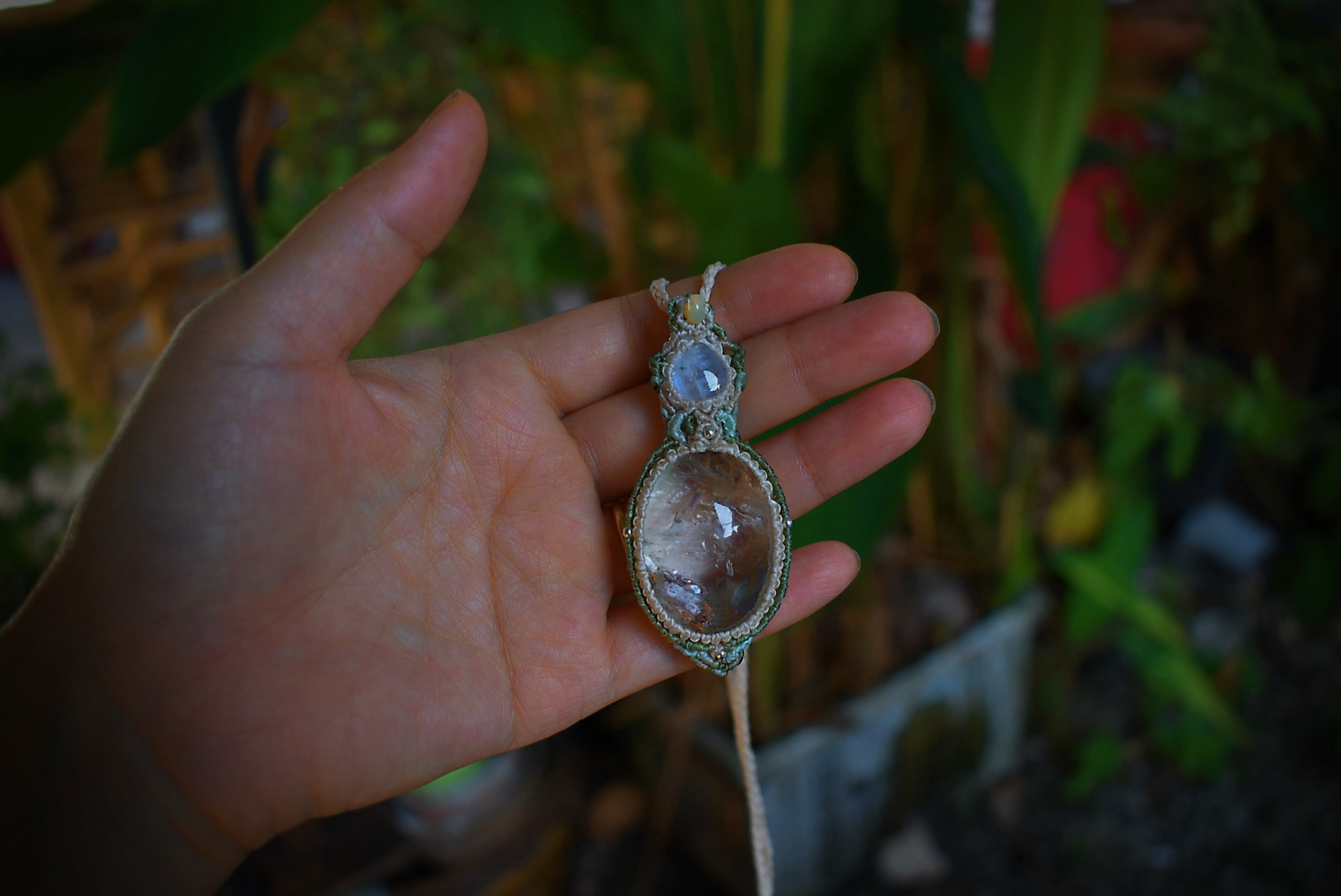 月と水晶★レインボームーンストーン +ピンクガーデンクォーツ マクラメペンダントmg001