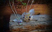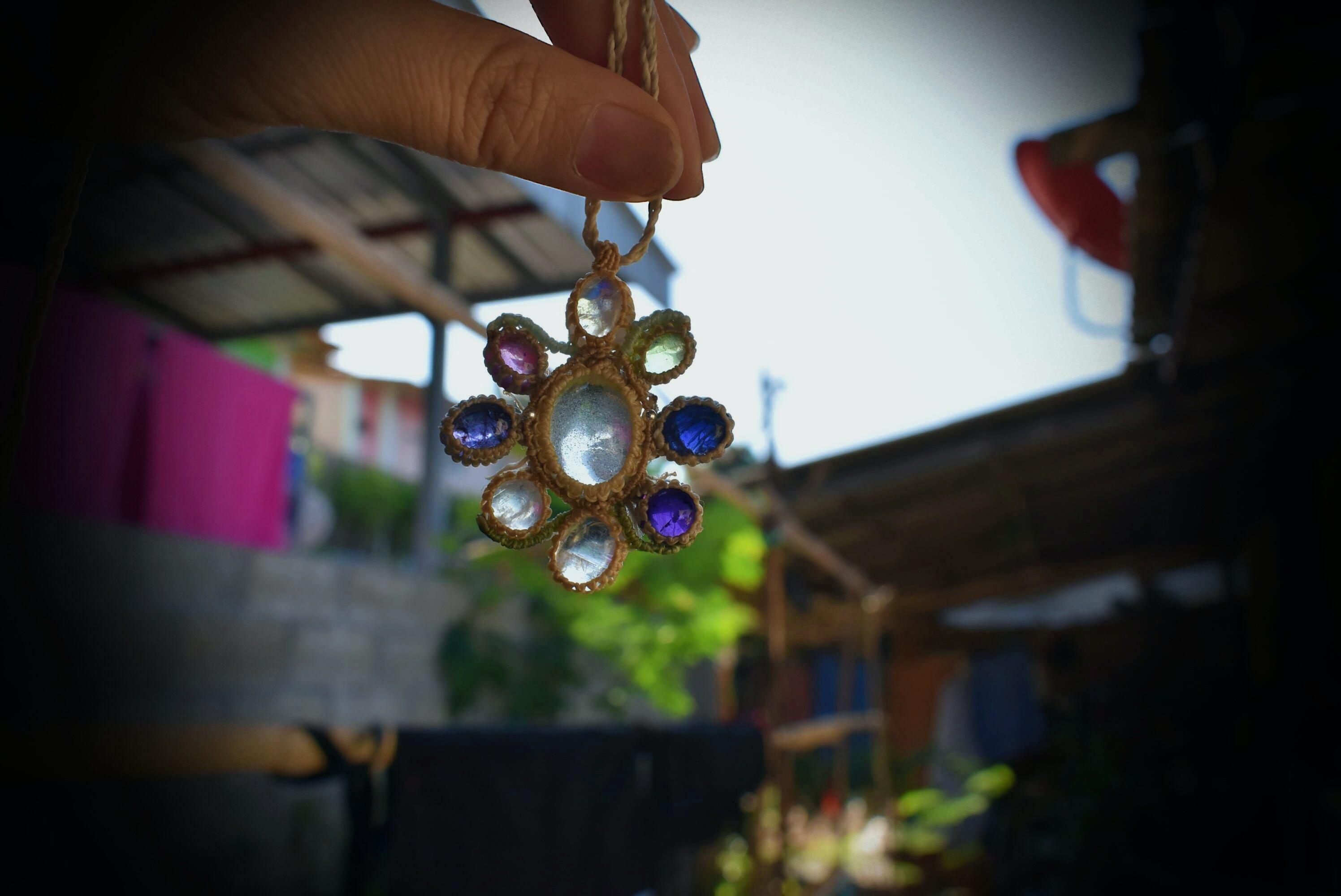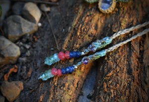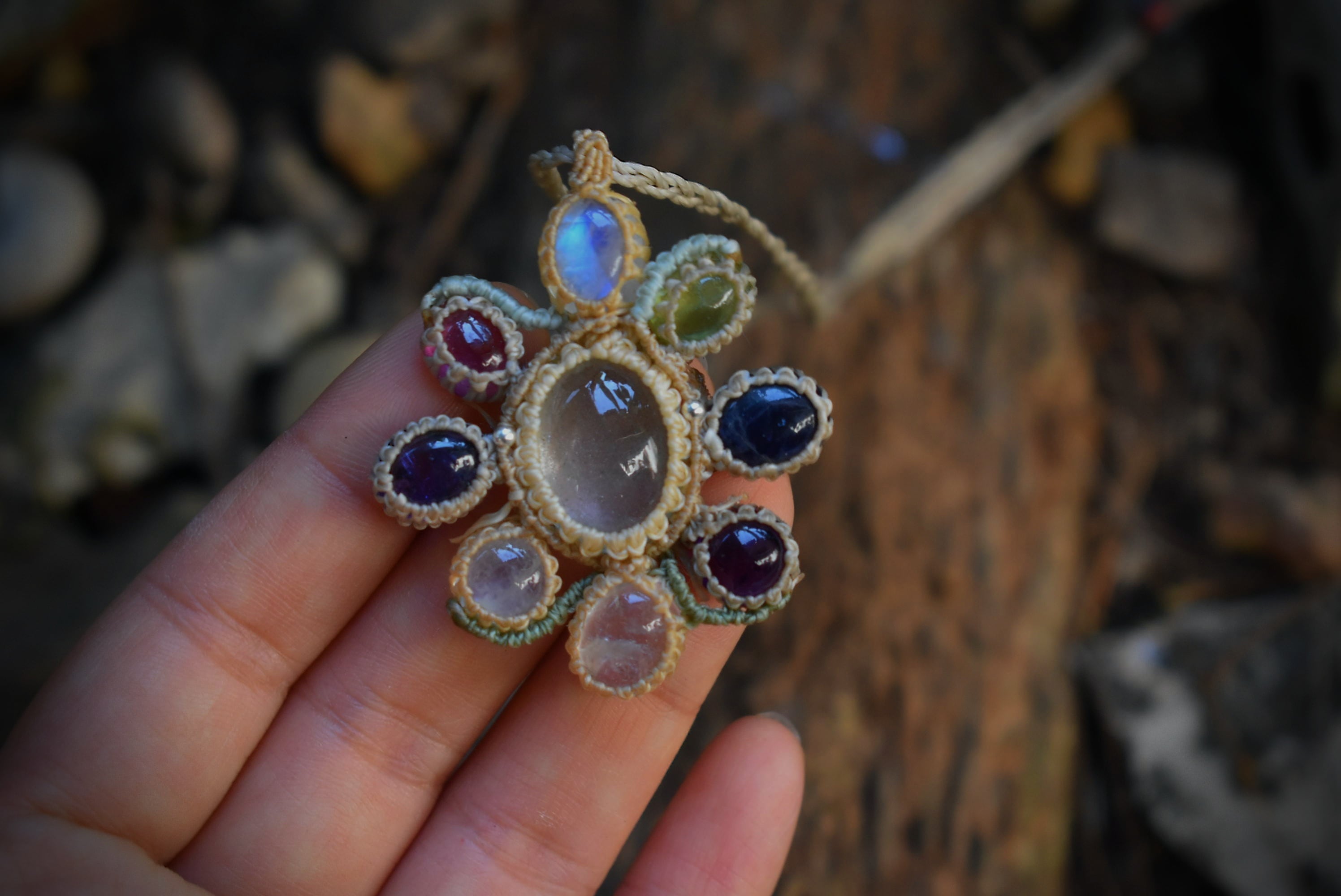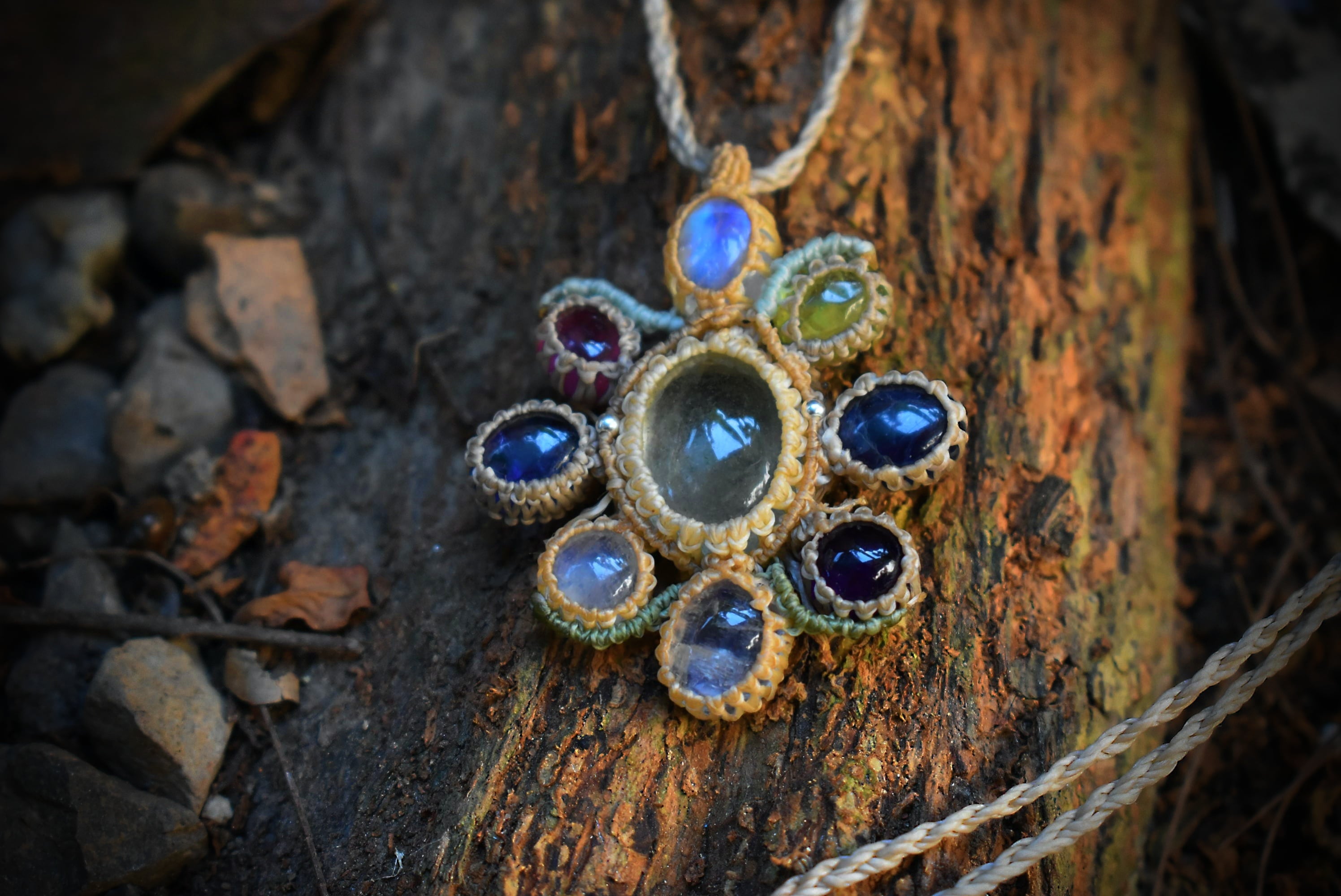 このたび、品質の良い特別な輝きを持つ天然石ばかりを組み合わせた小粒ペンダントをお花のようにあしらい、仕上げました。0.25mmという細いロウビキ糸を使用することにより仕上げた繊細なもの。細かく結びひとつにした天然石の組み合わせを見ていただけると嬉しいです。