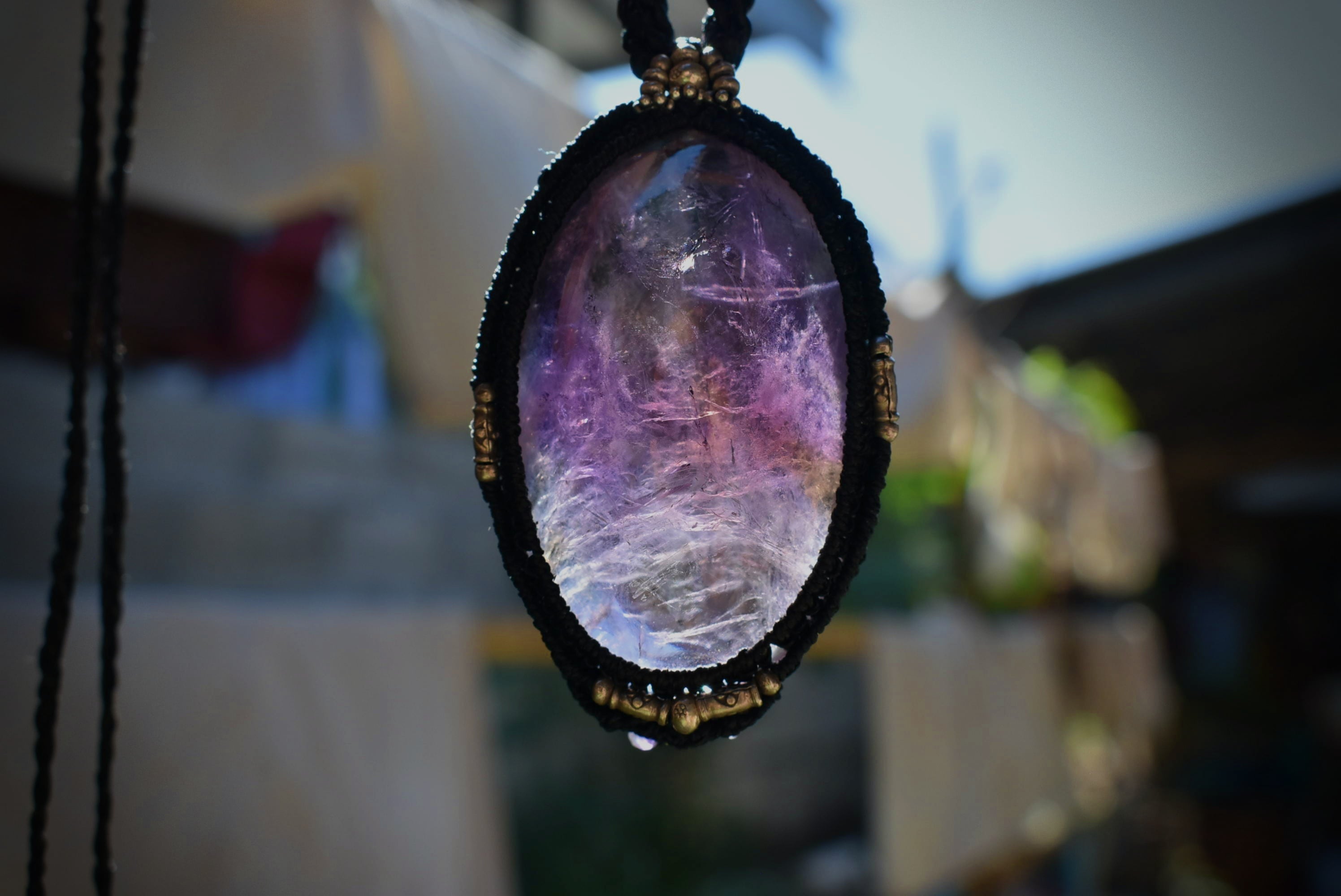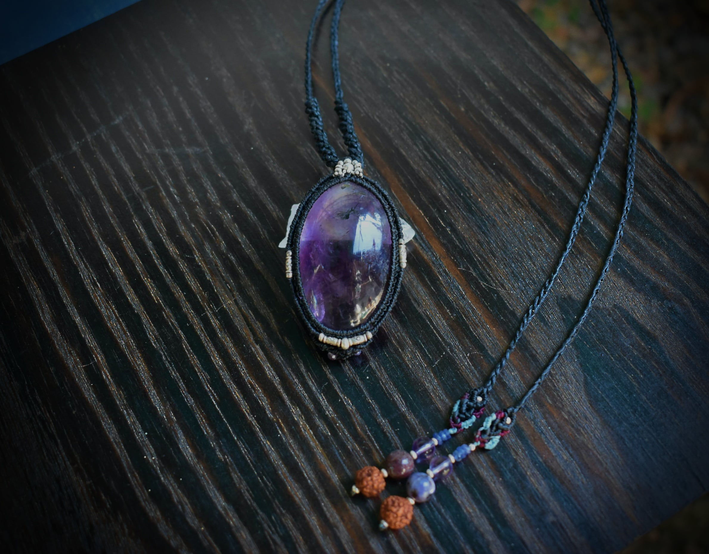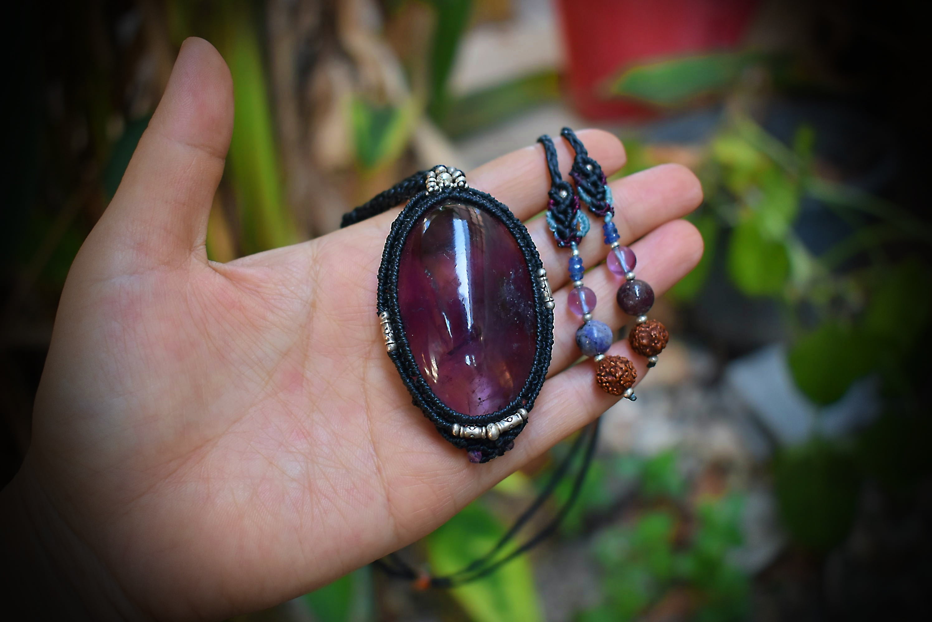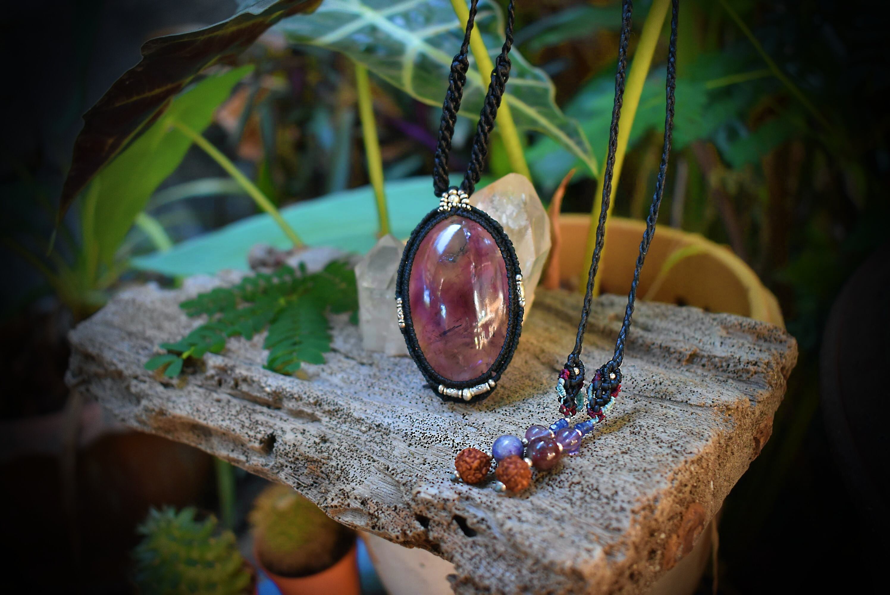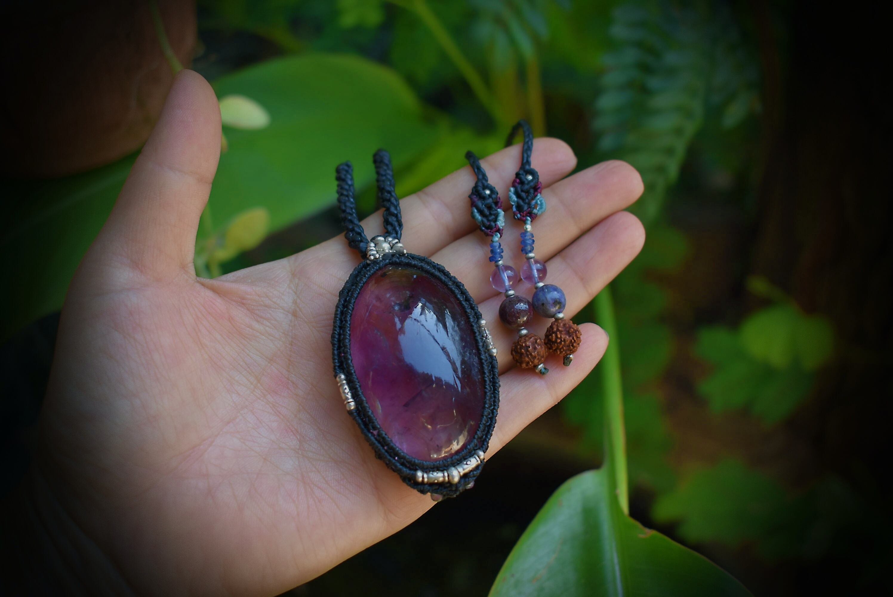 このたびの大粒アメジストの中にはシラーと共に美しいインクルージョンを見ることができる美しいもの。大きな粒はパワフルであり、水晶特有の浮遊物を見ることができます。大きなアメジストを市場ではなかなか見ることはできません。アメジストの世界観もグラデーションを持っており、丁寧に研磨が施されたルースをマクラメ編みペンダントに仕上げました。
