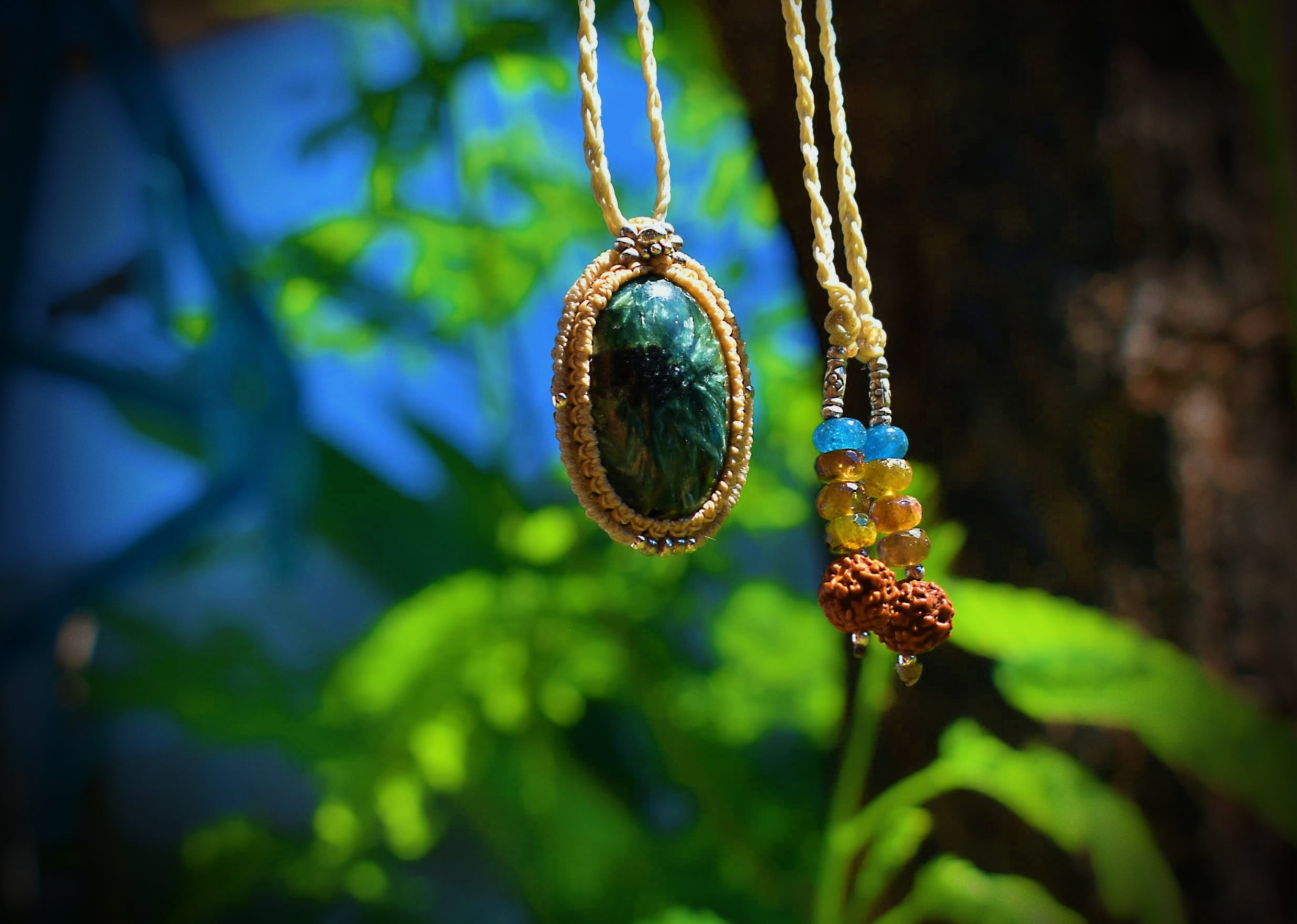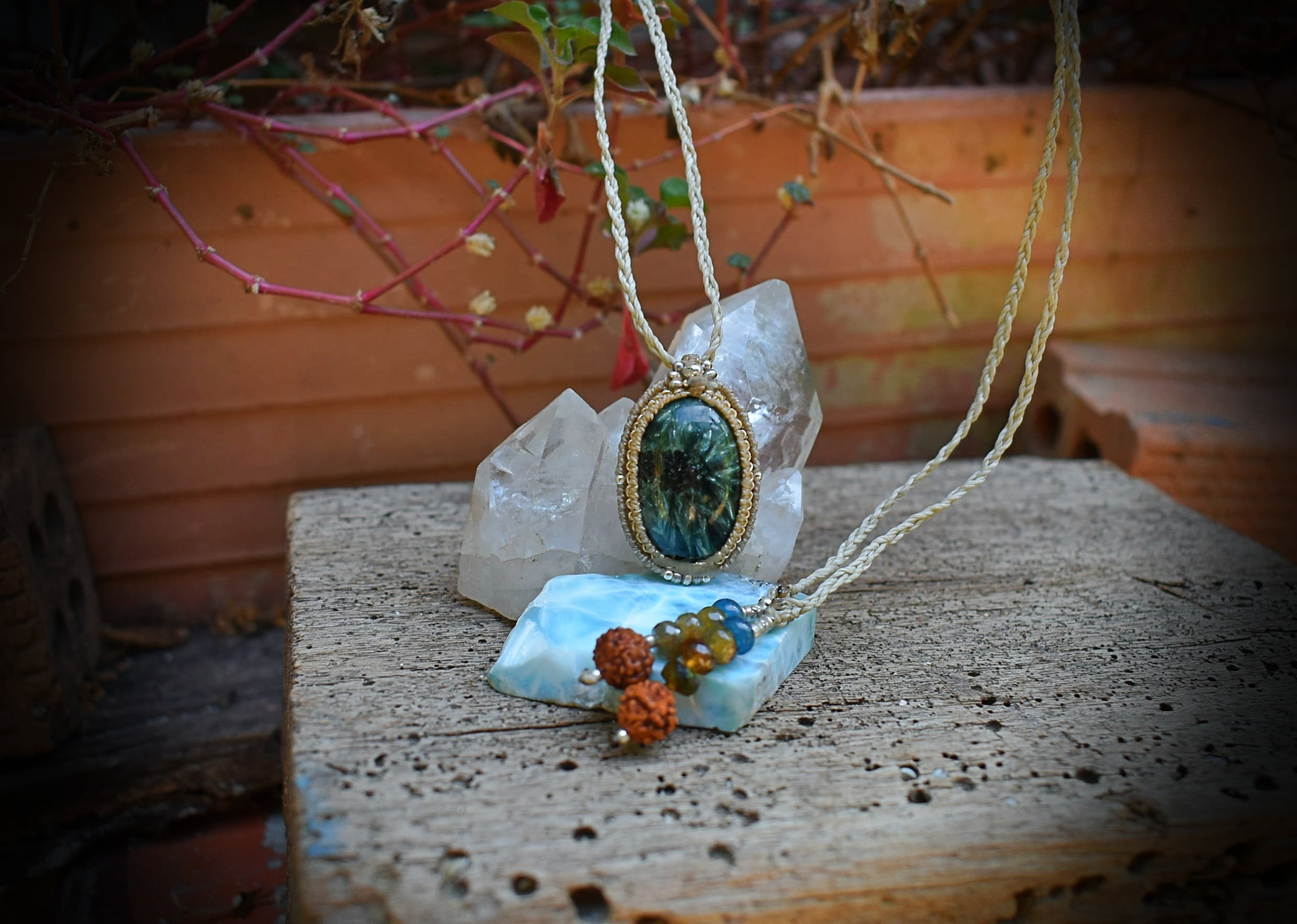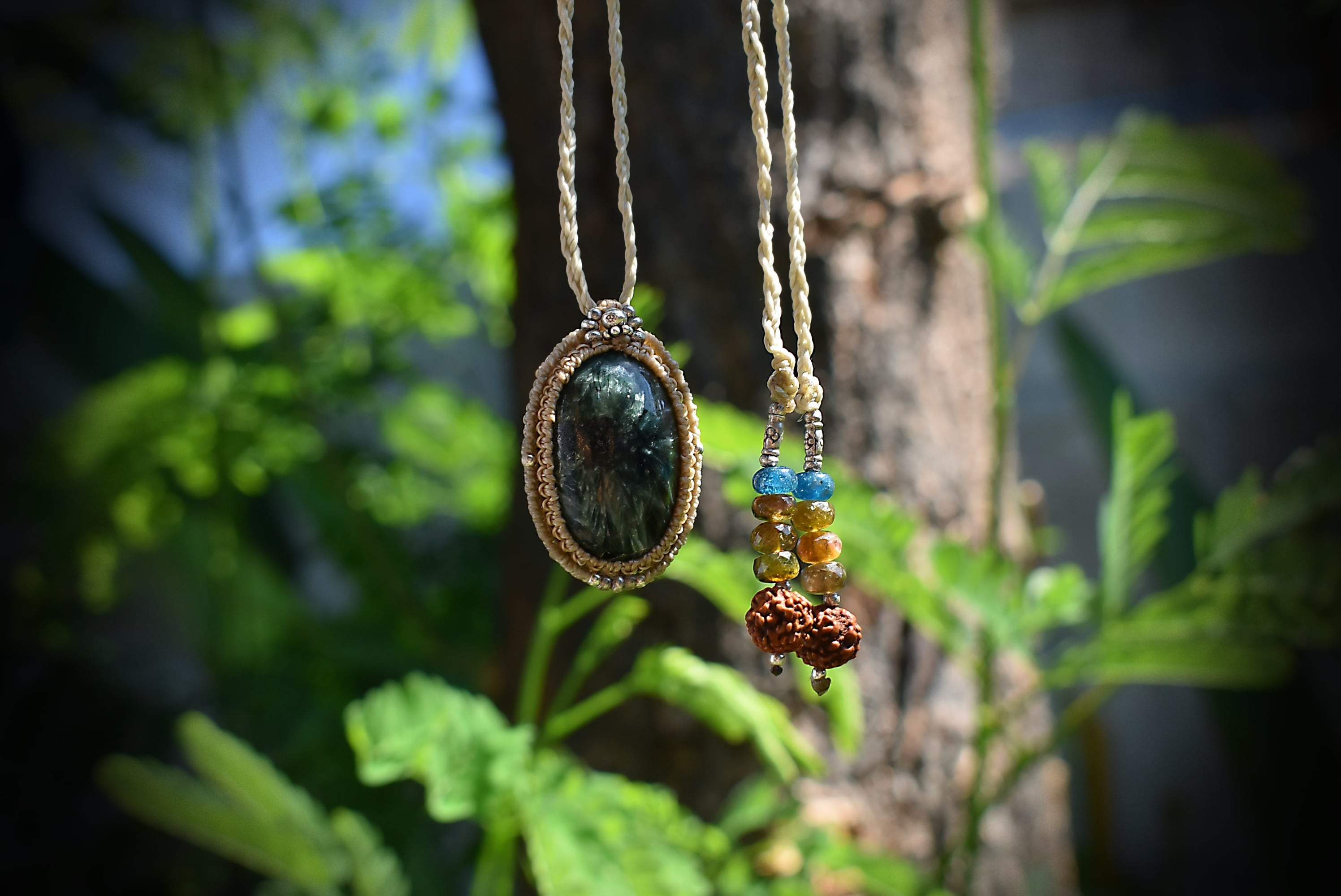深い深い深緑の世界を物語るような天然石セフィナイトをマクラメ編み装飾にてペンダントに仕上げました。ぷっくりと研磨されたルースを囲みカレンシルバー92.5ビーズをアクセントにあしらったもの。