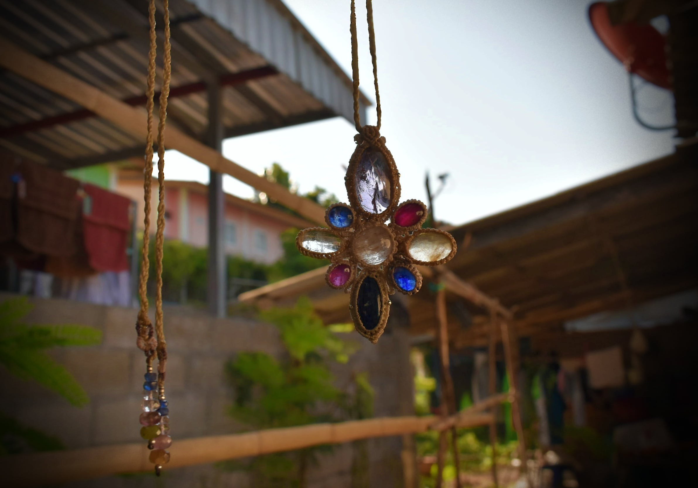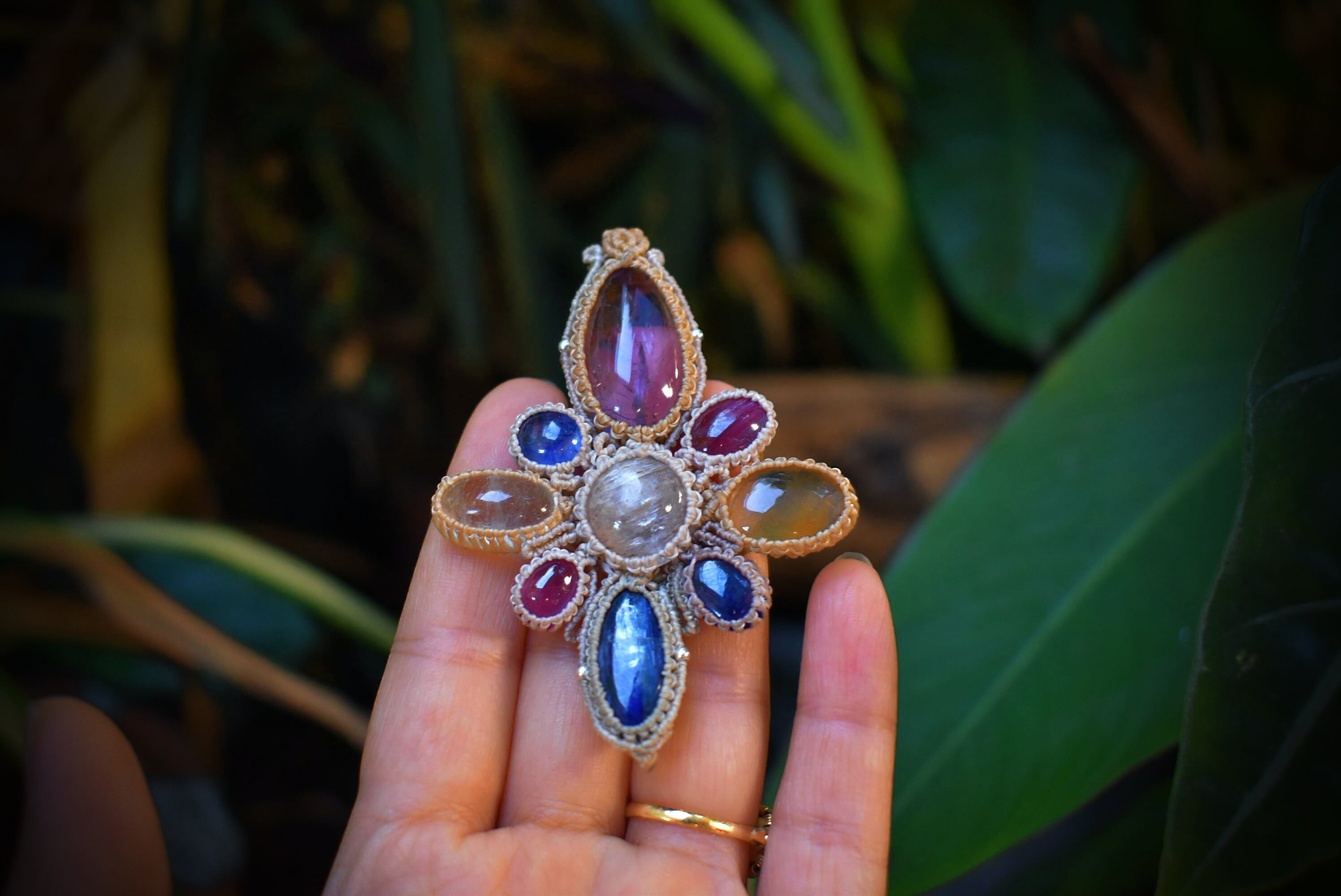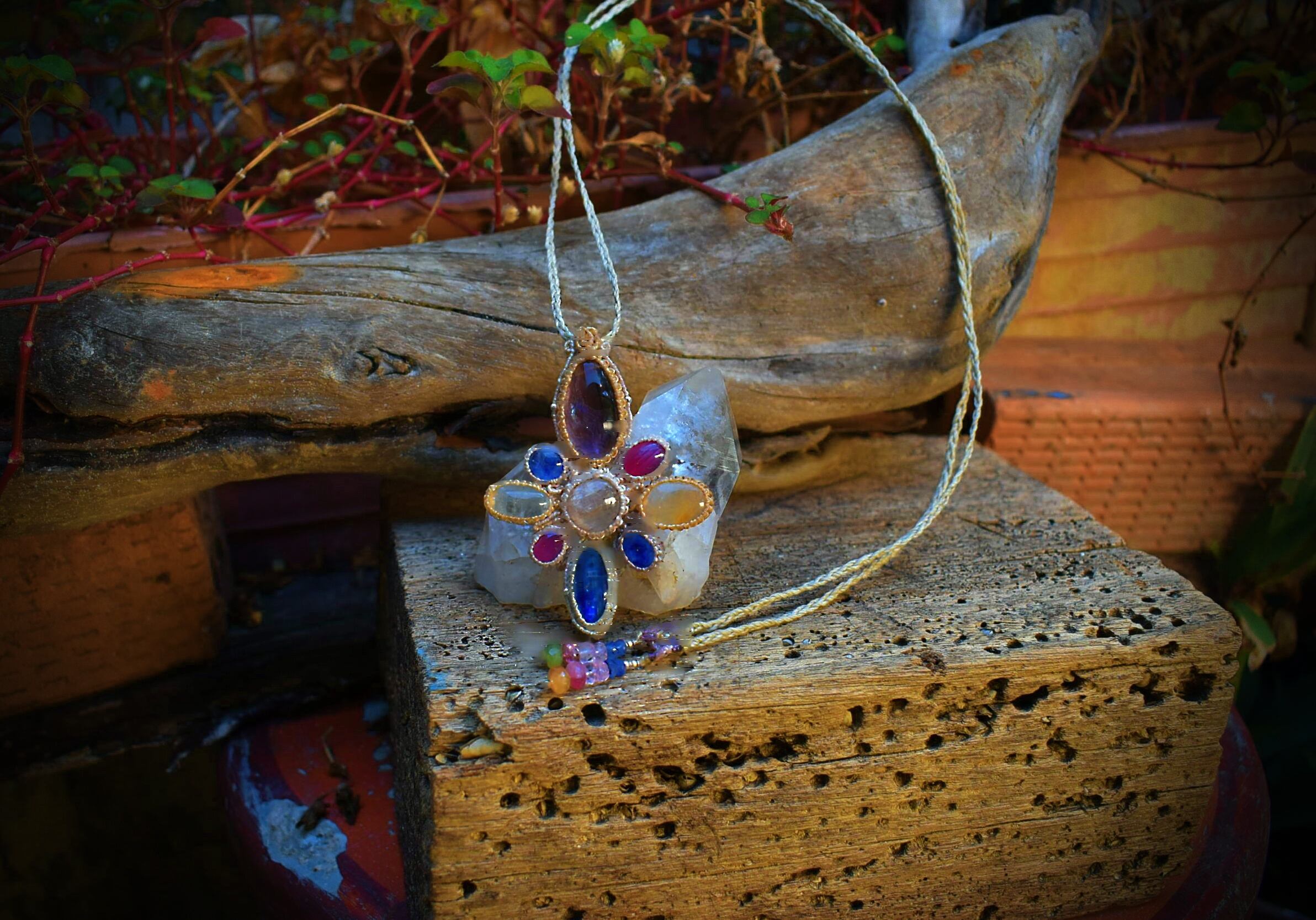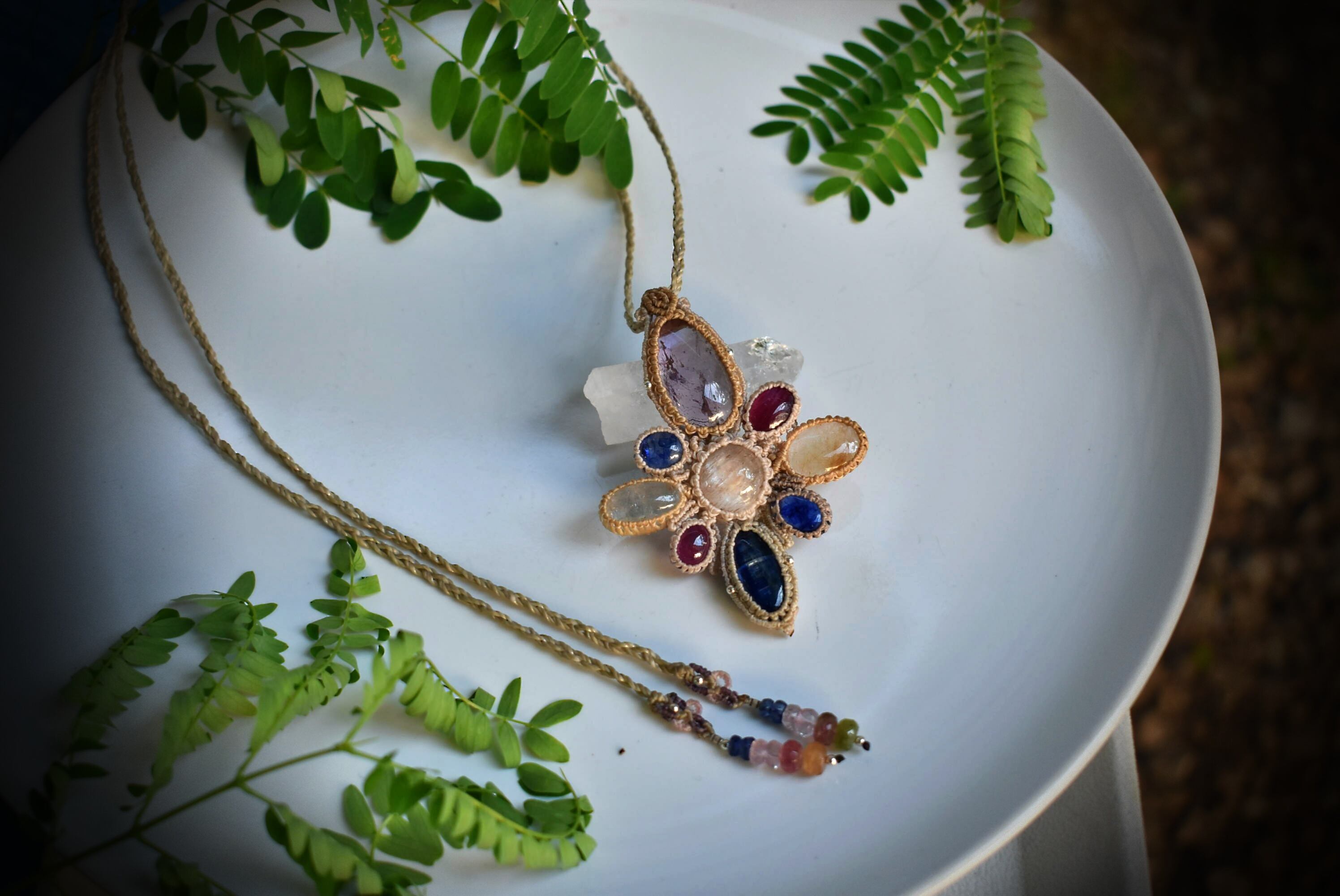 手掛けてきたデザインに見合う天然石がやっと追いついた..というそんな想いをたくさん詰め込んだフラワーモチーフのマクラメペンダントになります。
