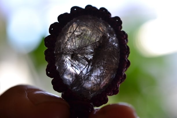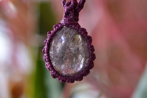 この度はクラシック感を出したいと考え、レッドパープルカラーの蝋引き糸を使用し、シンプルにマクラメ編みをしてペンダントに仕上げました。