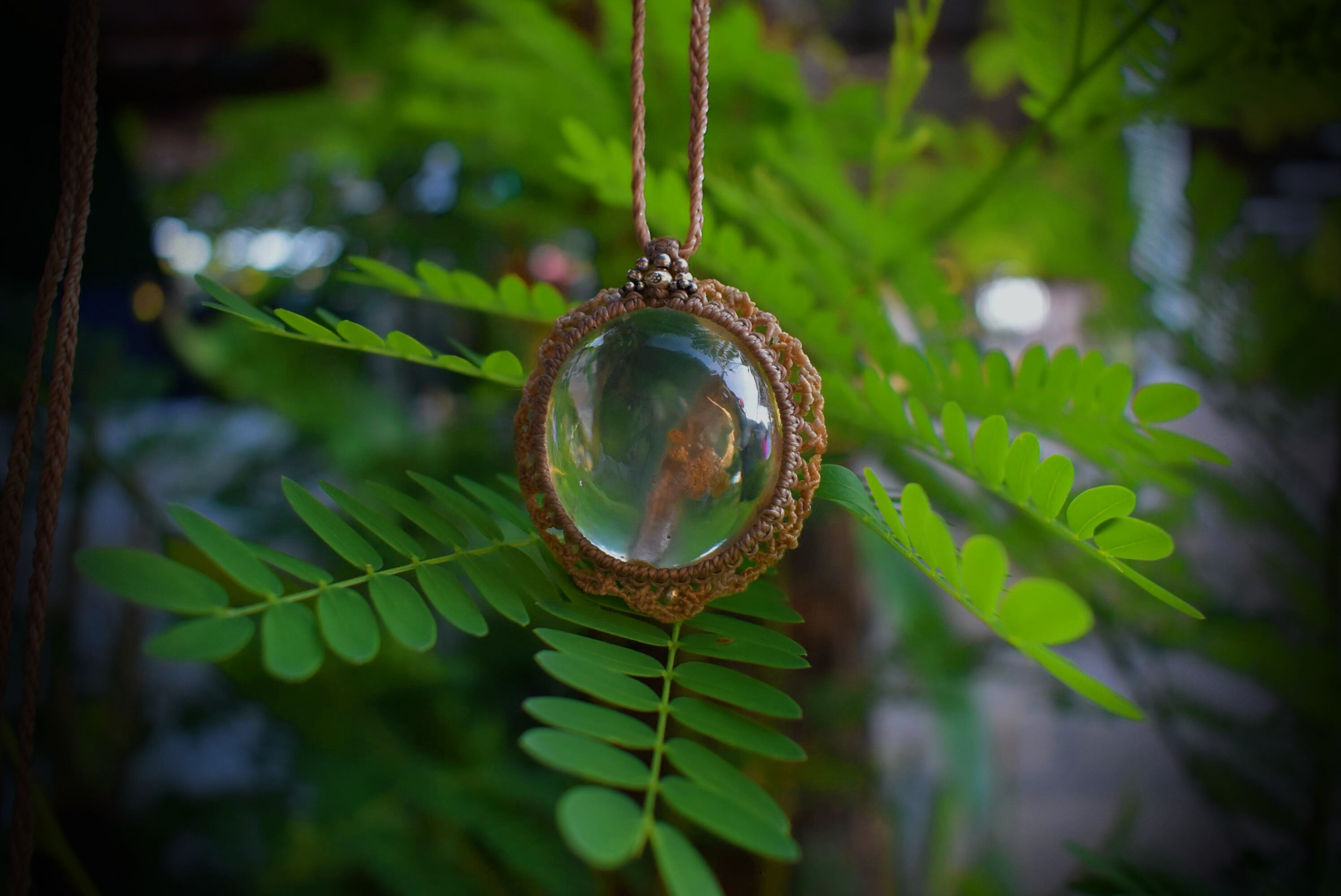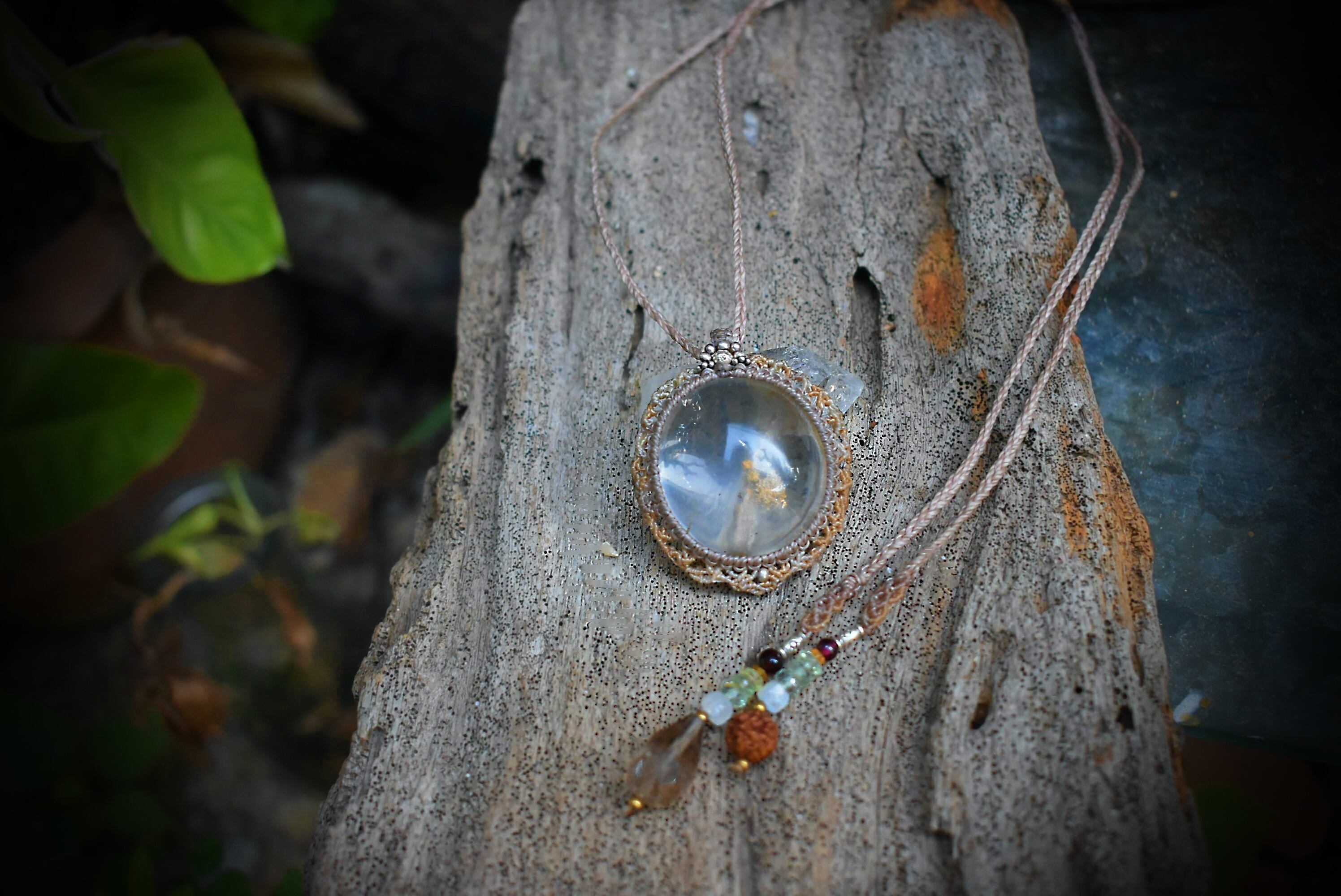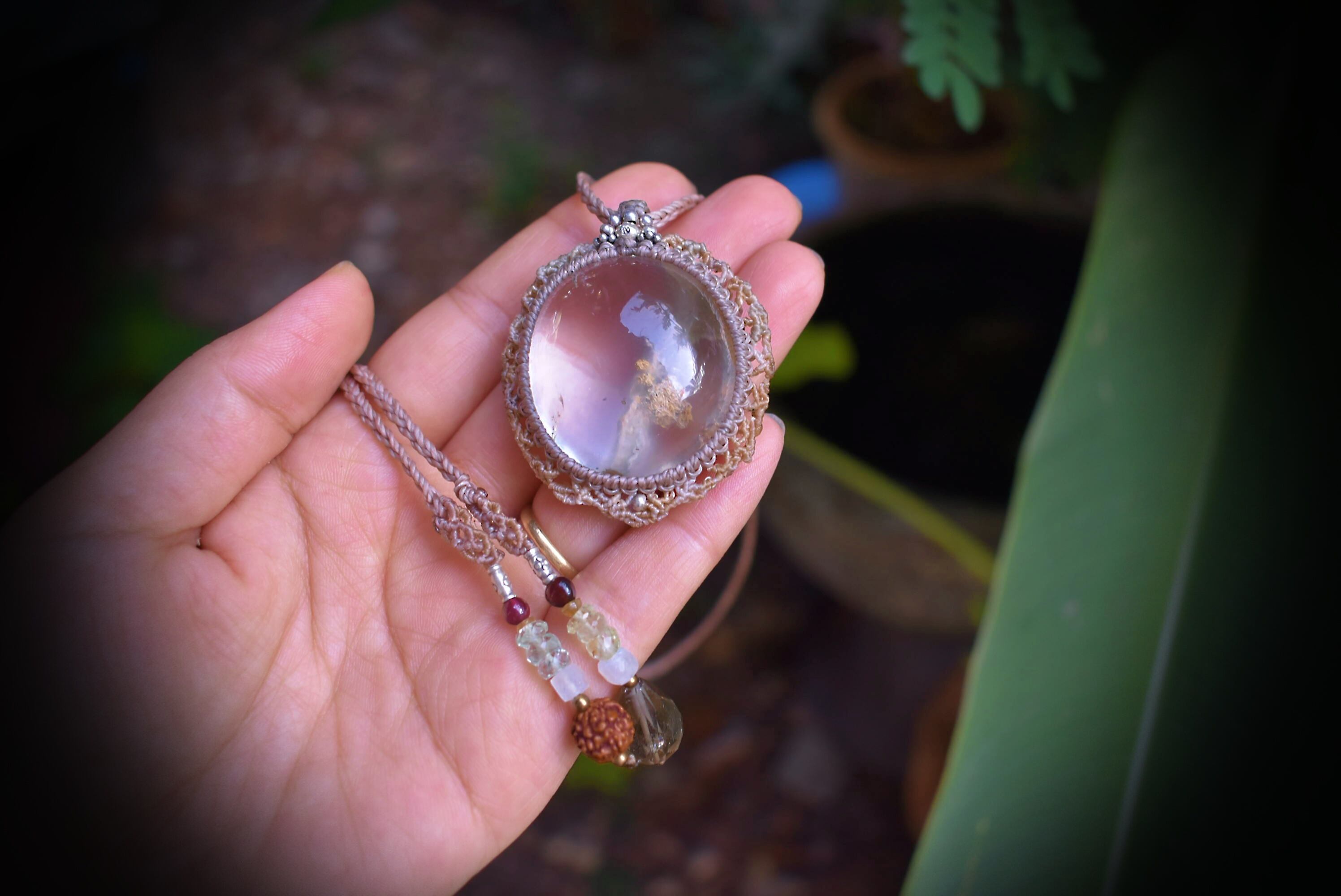 何とも柔らかい色味が水晶全体を包んでいる個性的な内包物が特徴的なガーデンクォーツ。この水晶の中の色味から見てとることのできる色味を意識して使用したマクラメ紐と大きなぷっくり水晶を際立たせようと石の周りを装飾しました。