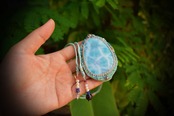 このたびのラリマーは独特でお見事なシャトヤンシーと光に透かした時の透け感が素晴らしい特大ラリマー。ブルーミントカラーという柔らかい色味。