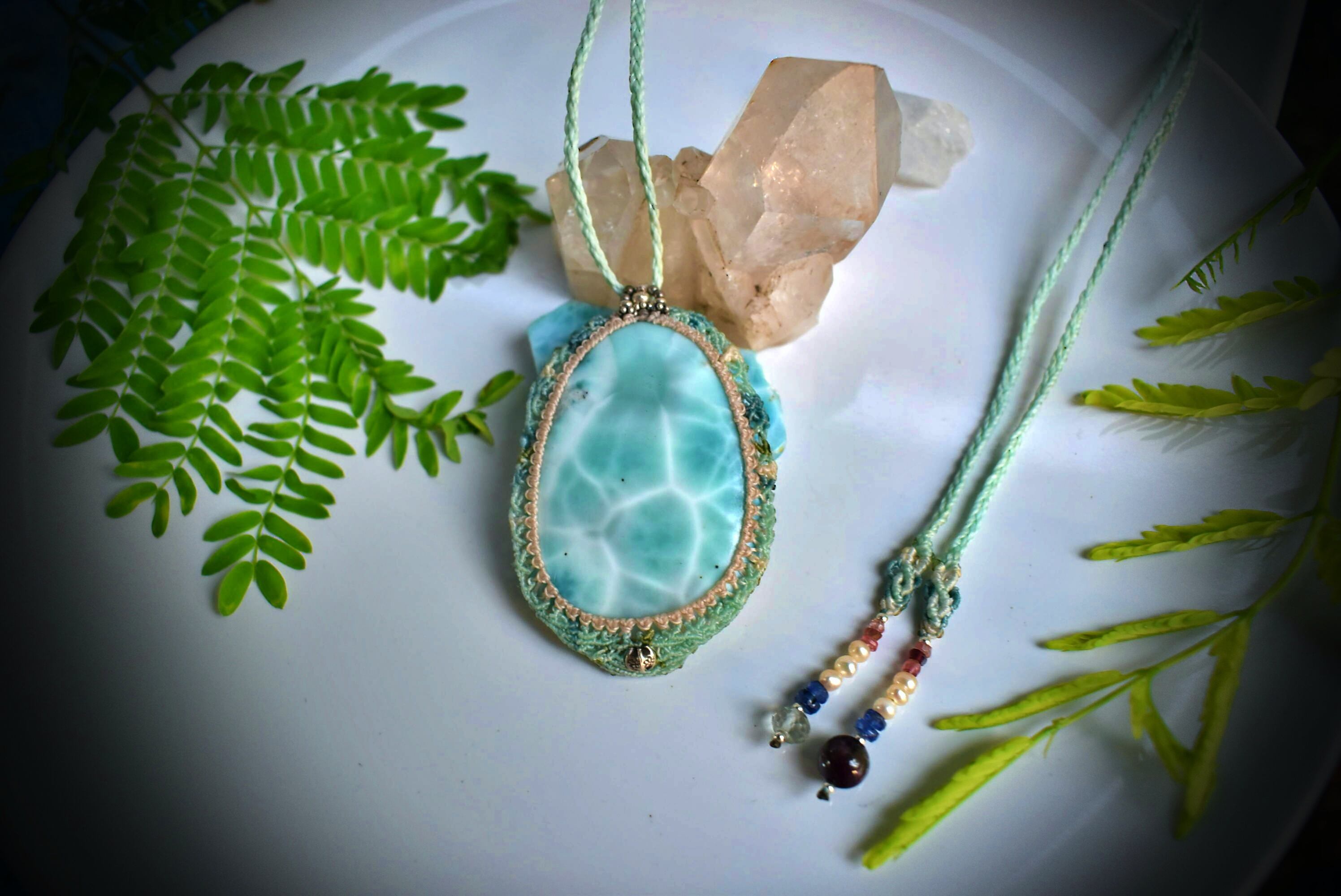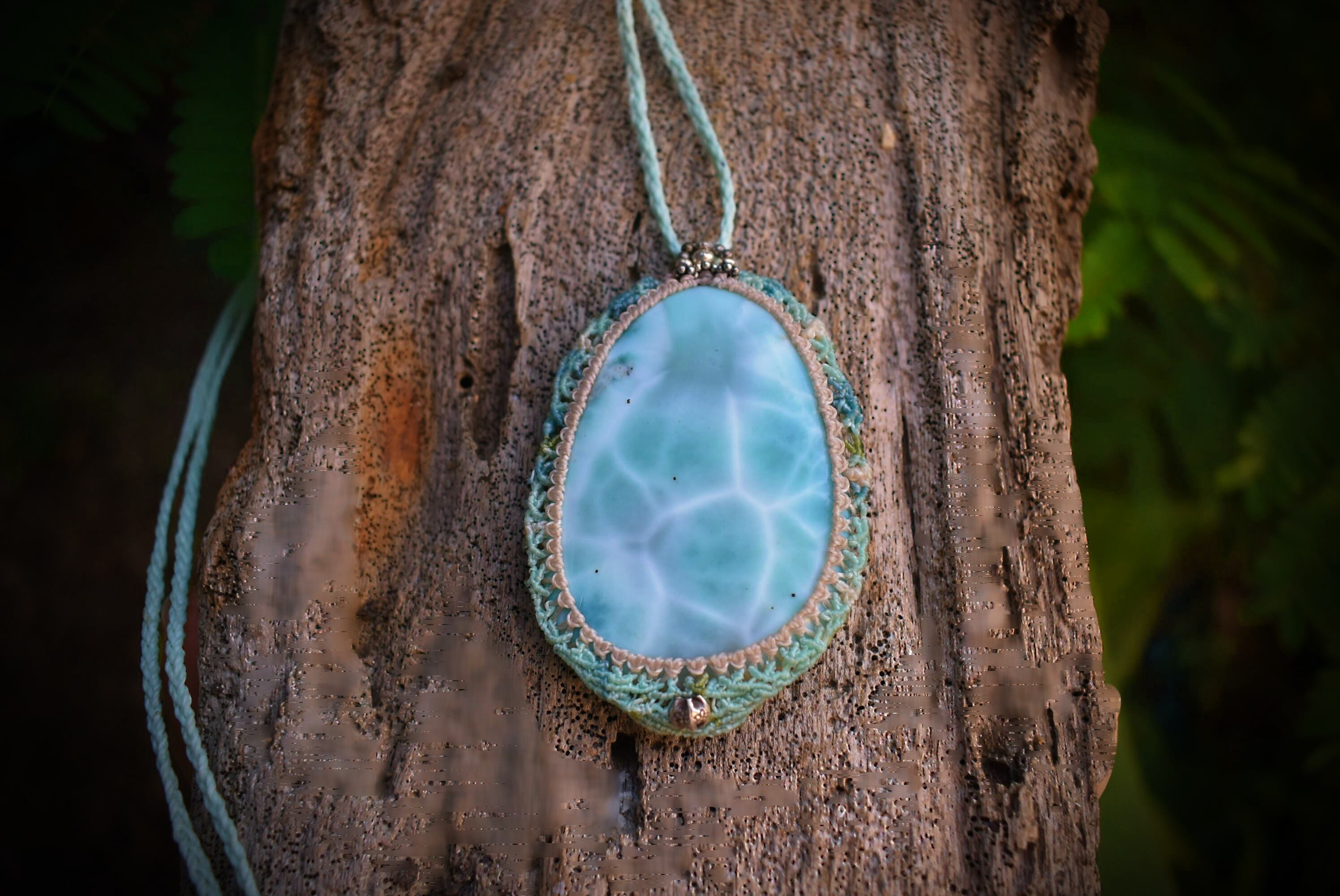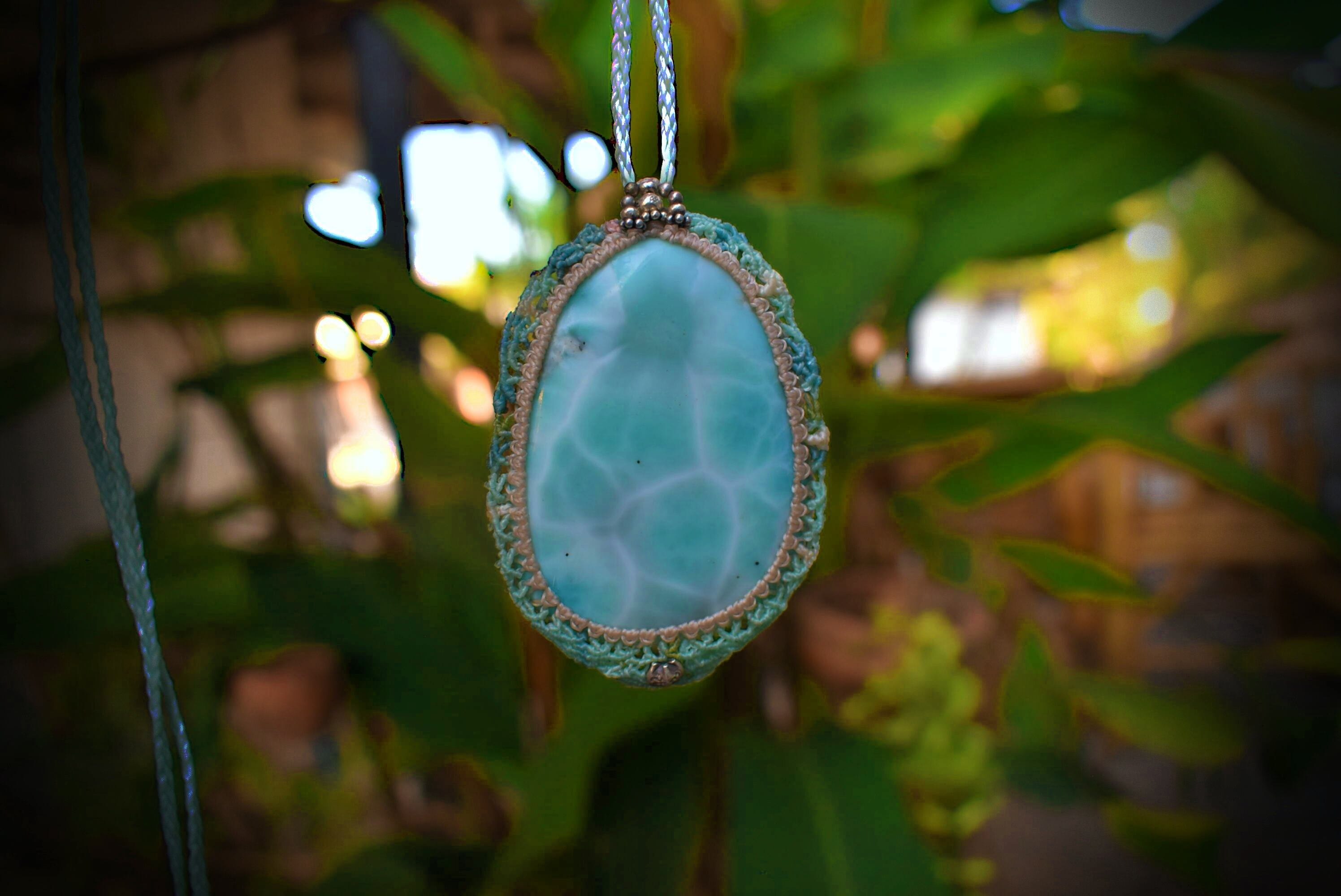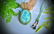 海をイメージさせてくれる美しいたっぷりなラリマーの世界をマクラメ編み装飾を施してペンダントに仕上げました。
