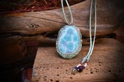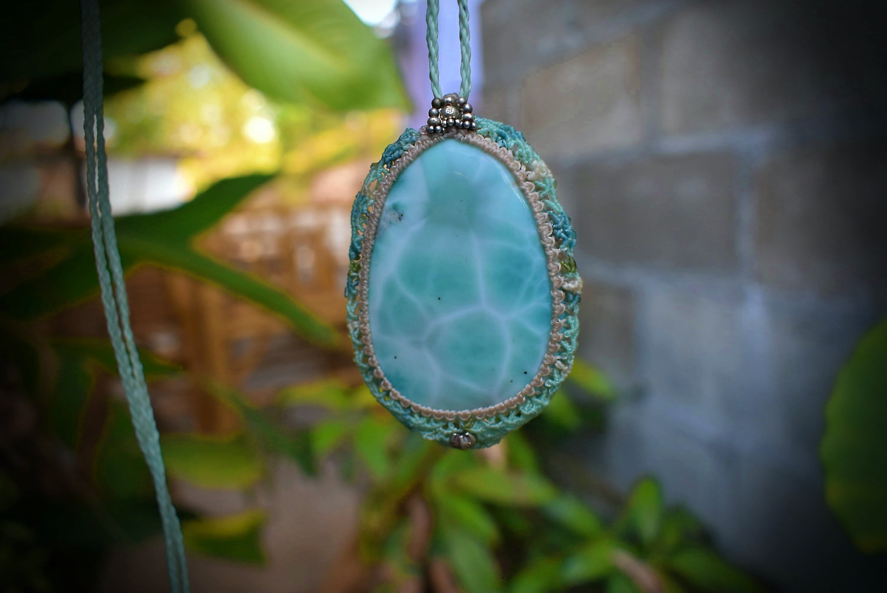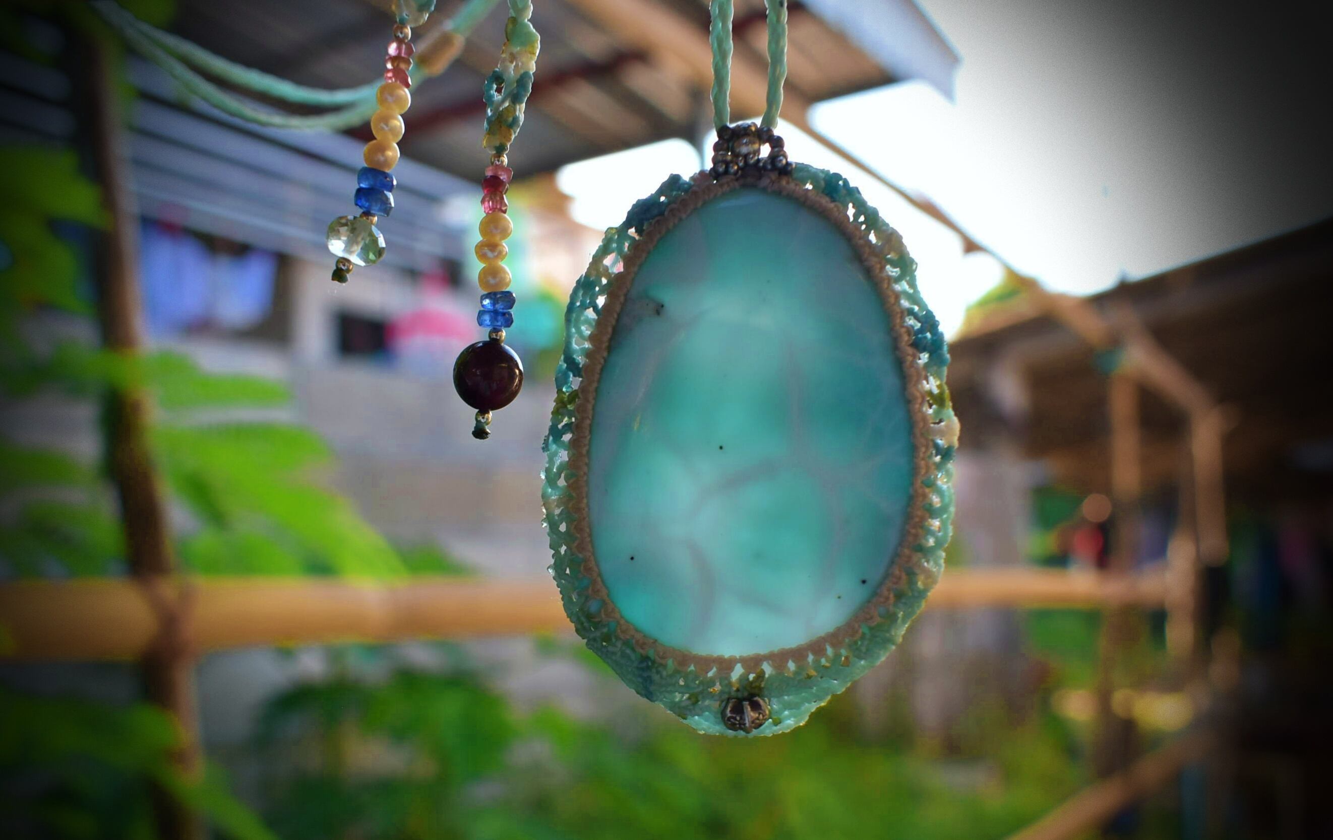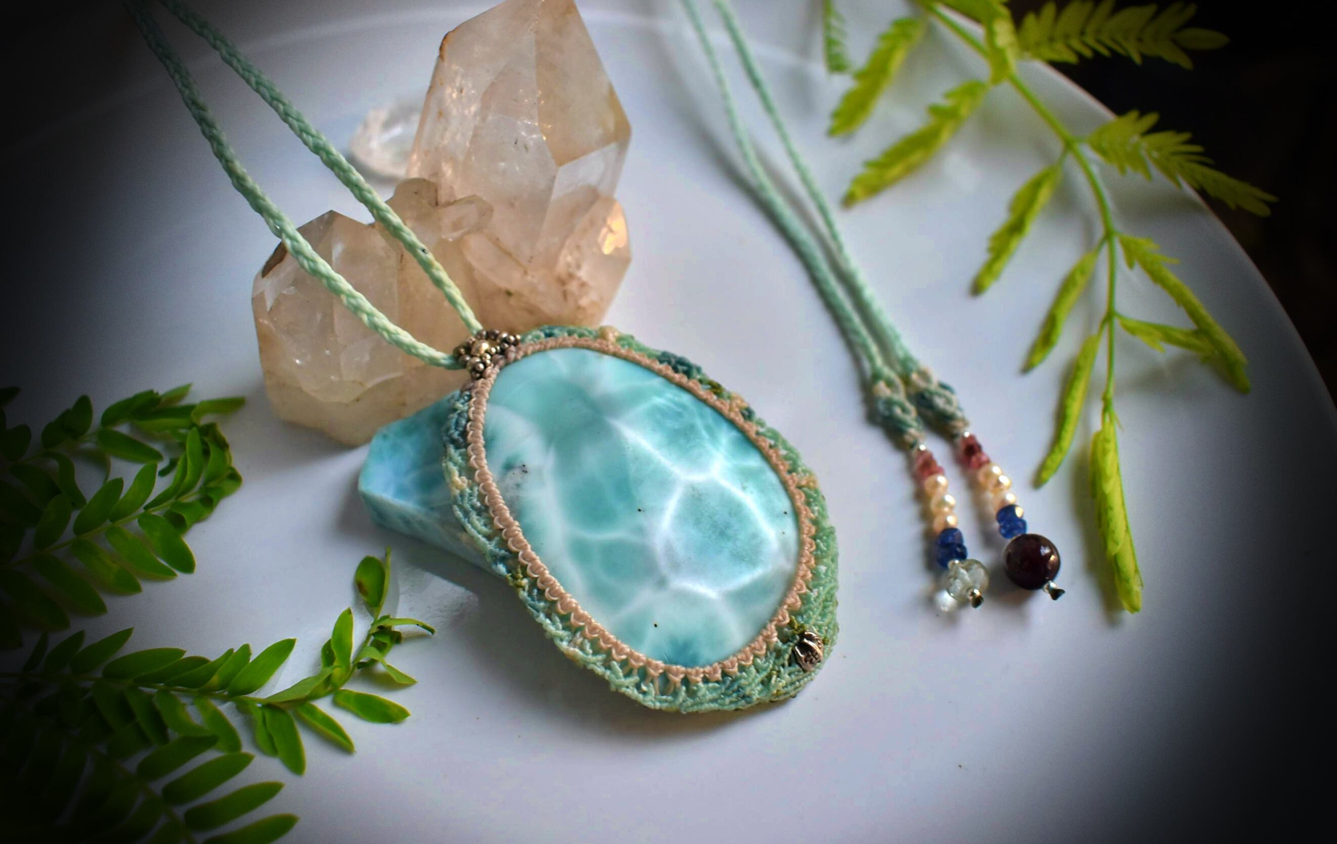 海をイメージさせてくれる美しいたっぷりなラリマーの世界をマクラメ編み装飾を施してペンダントに仕上げました。