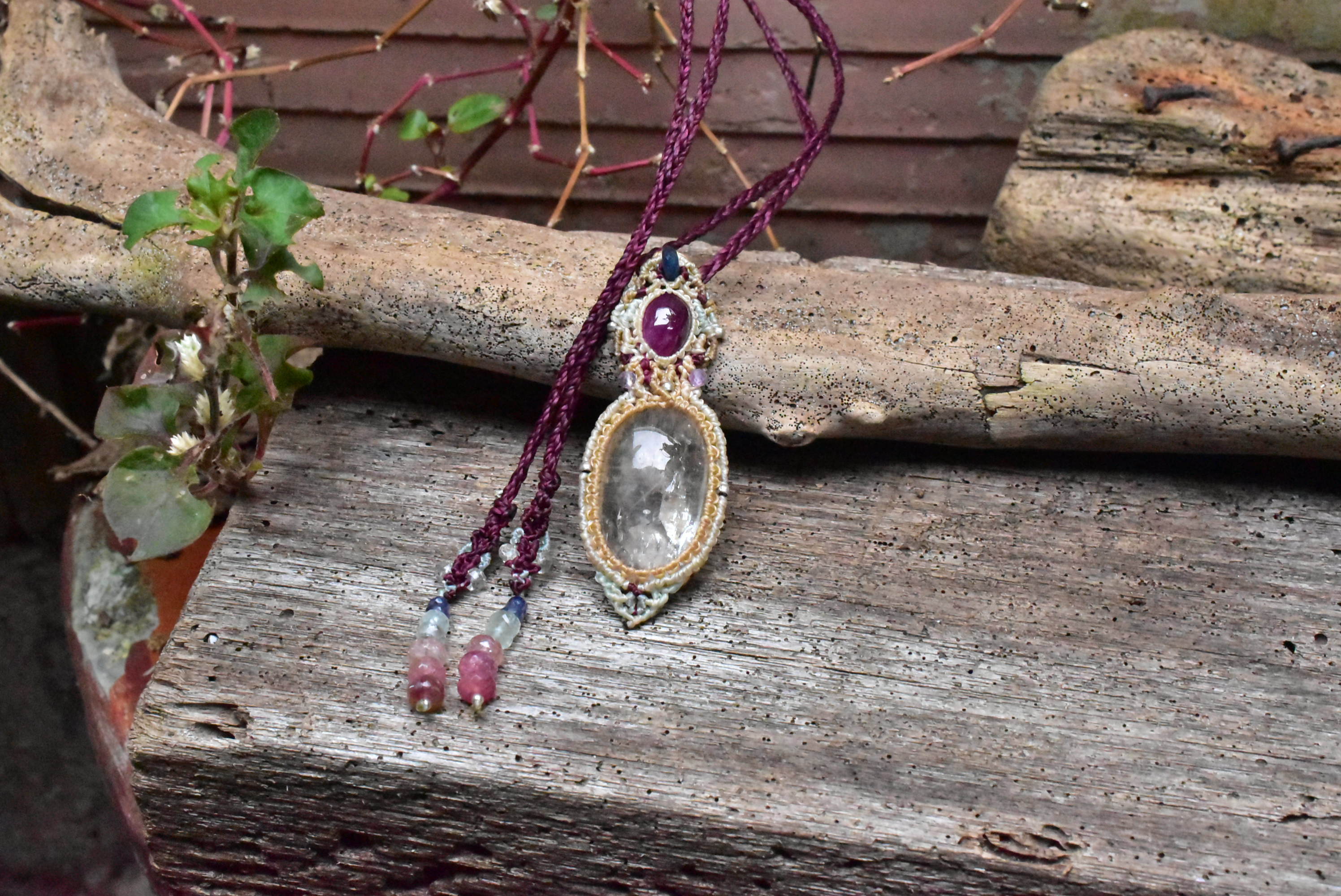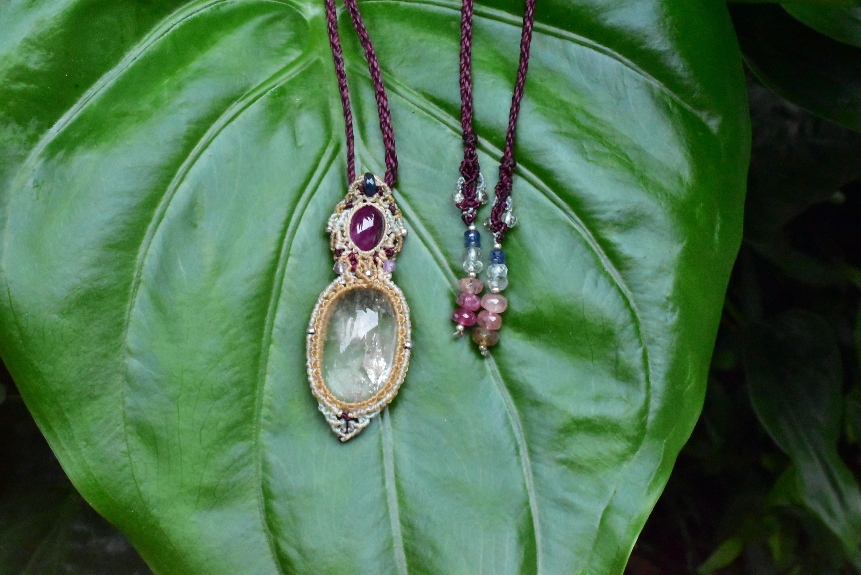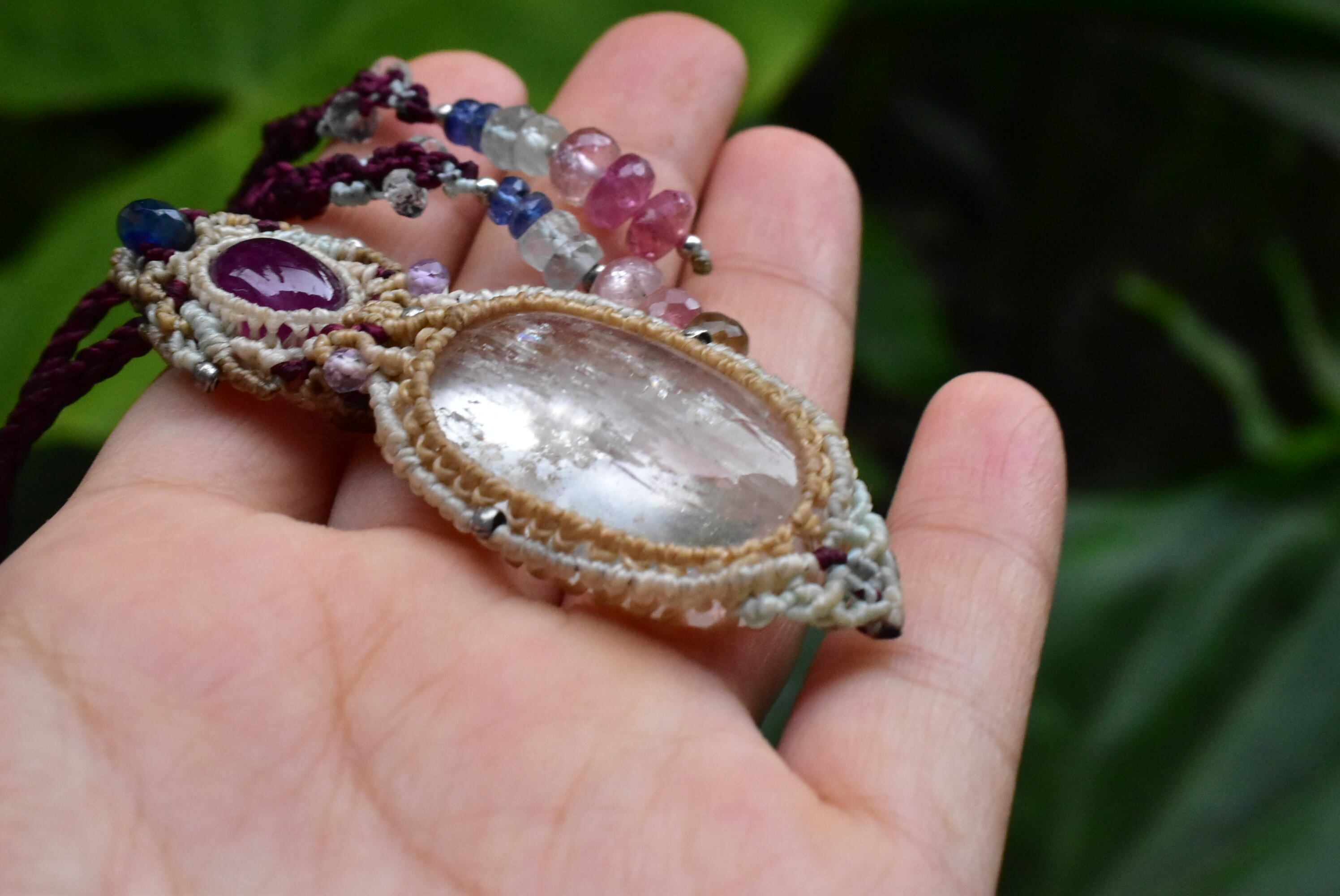 このたびは繊細な透明感とシラーが美しいクンツァイトルースと紅いルビーを組み合わせて、明るい色合いのマクラメ編み装飾を施し、2石をひとつにペンダントとして仕上げました。