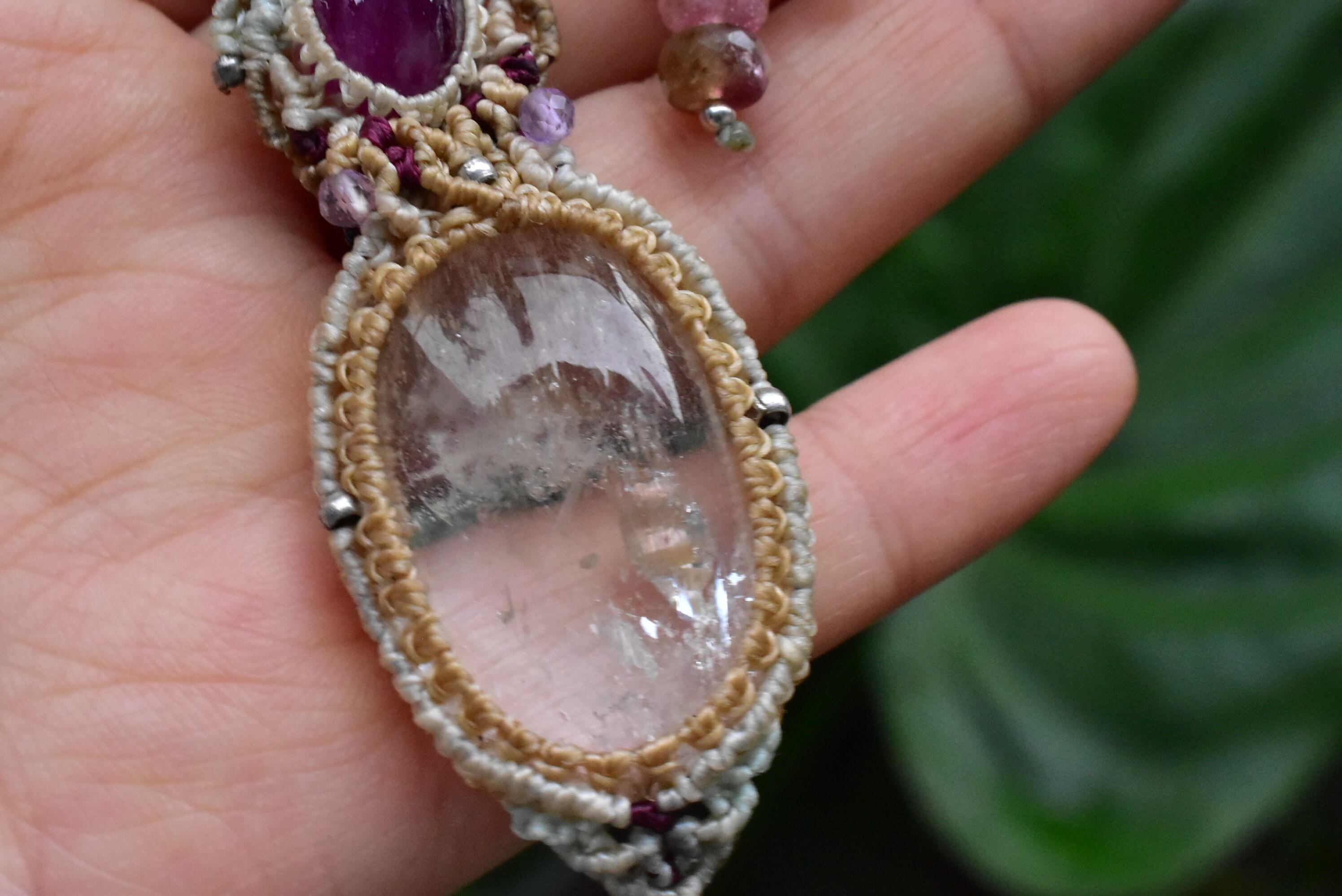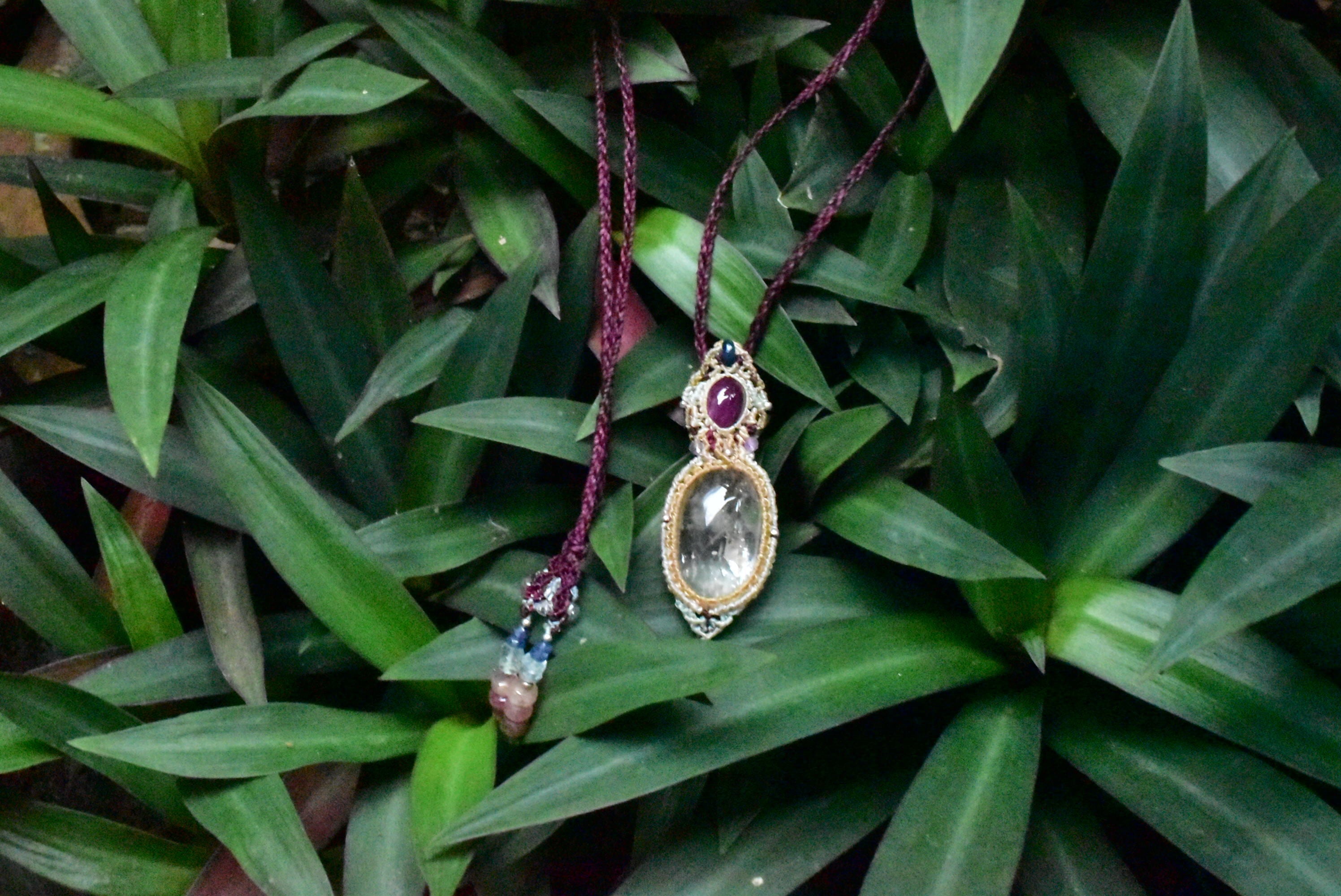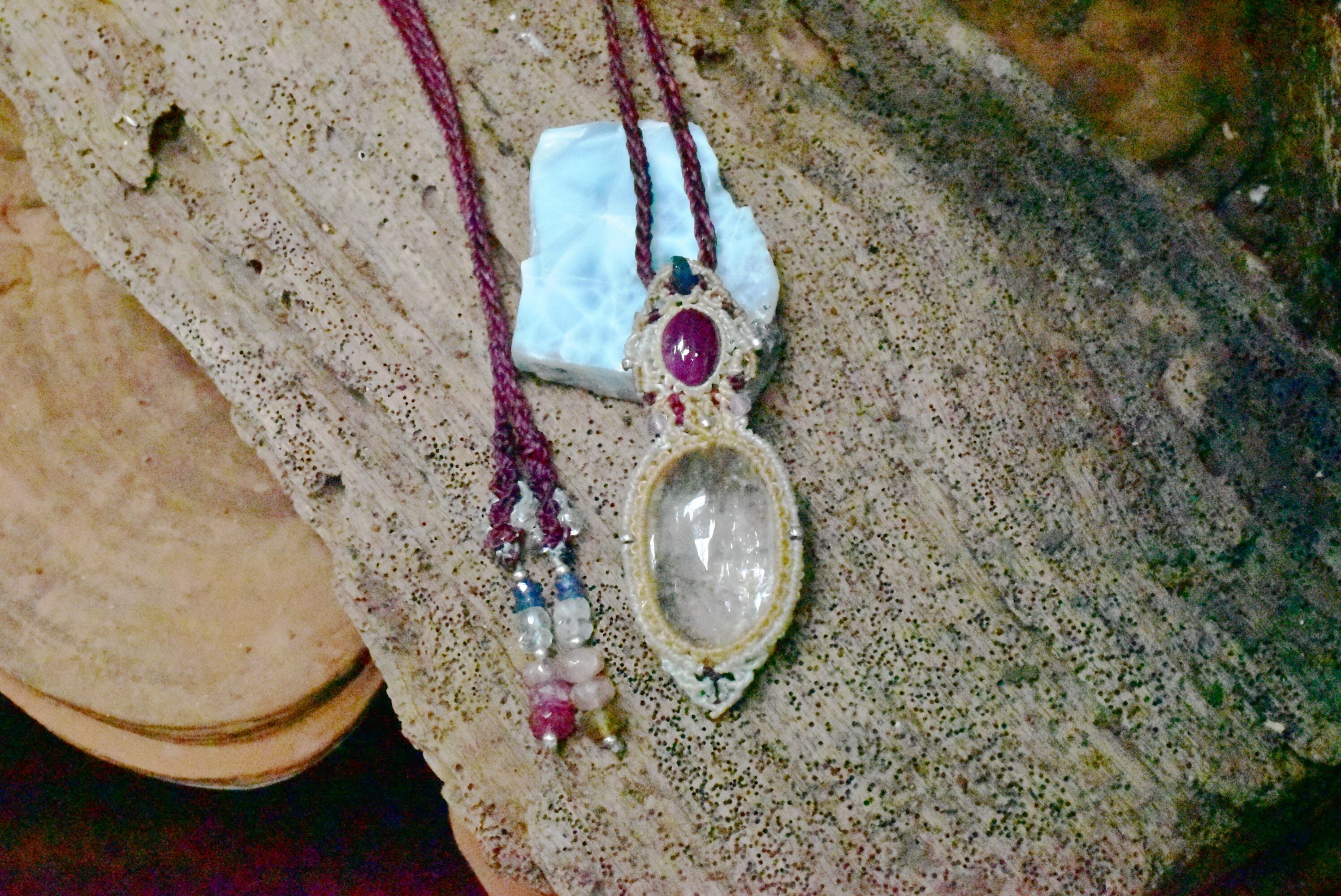 このたびは繊細な透明感とシラーが美しいクンツァイトルースと紅いルビーを組み合わせて、明るい色合いのマクラメ編み装飾を施し、2石をひとつにペンダントとして仕上げました。