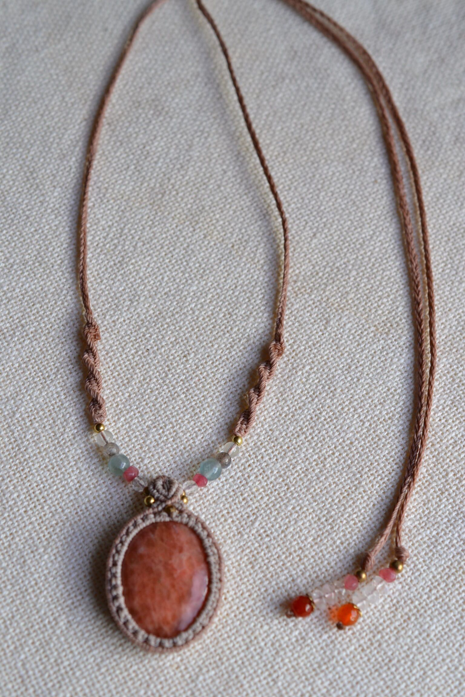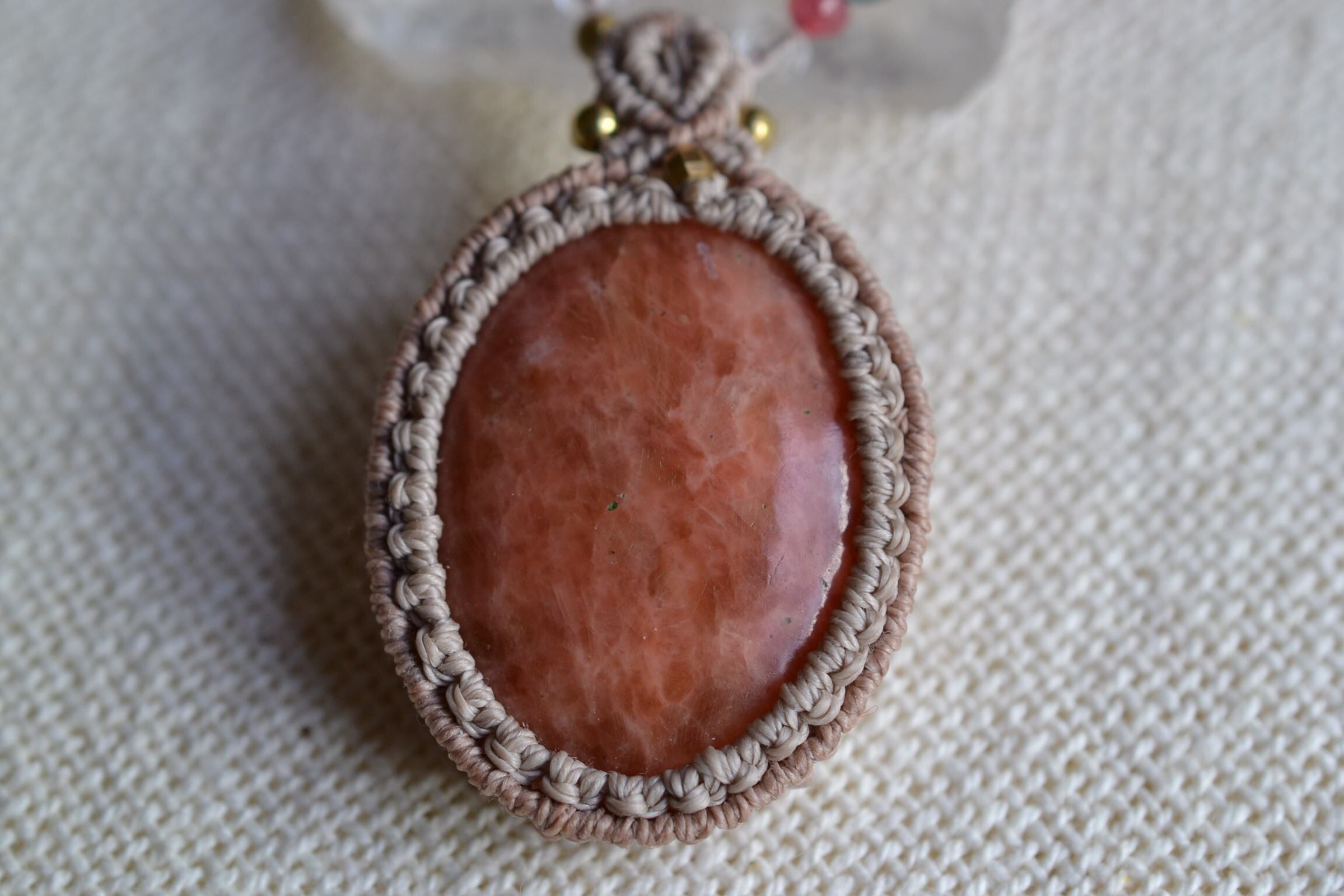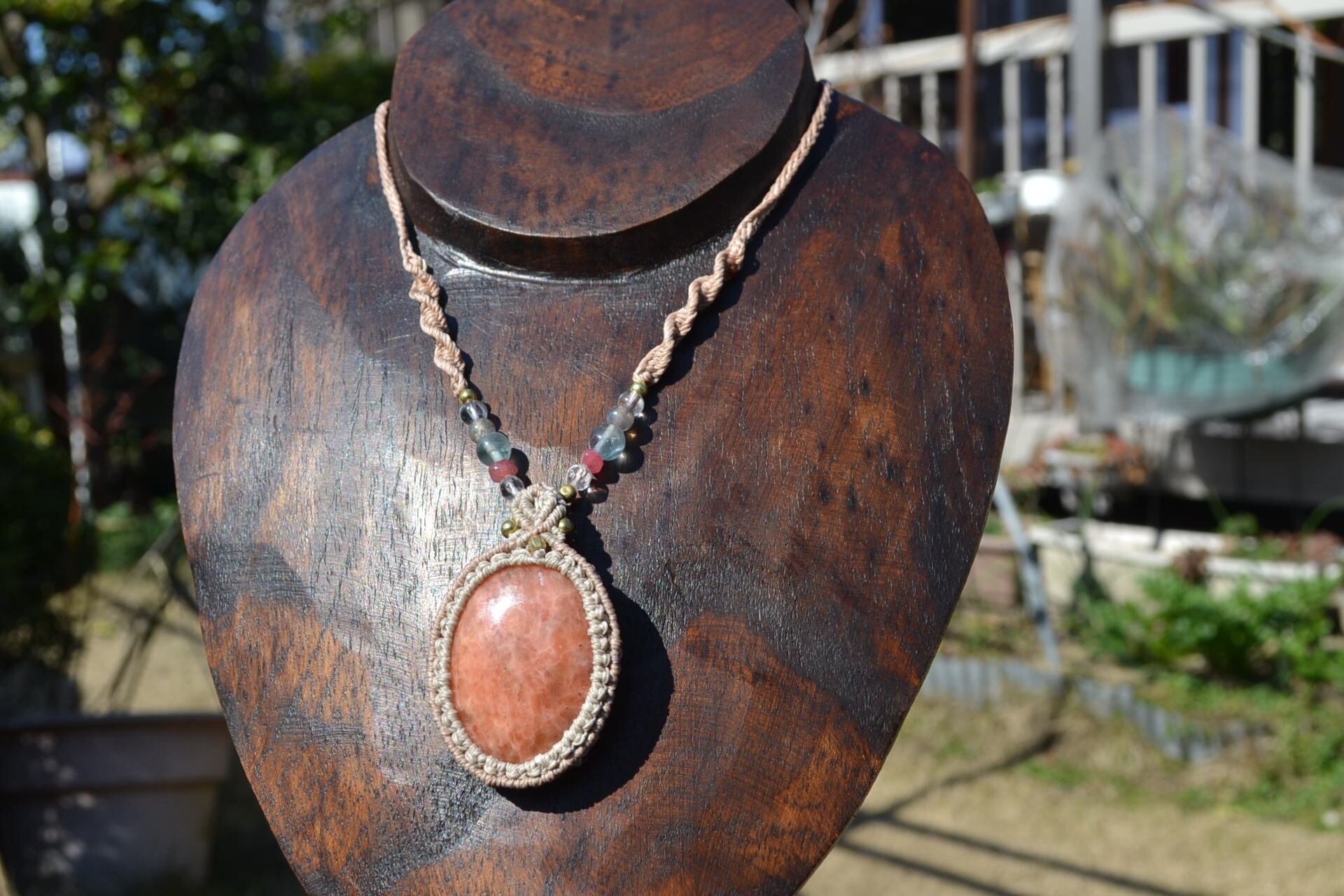 元気な色味が鮮やかな良質で大きなオレンジアベンチュリンをたくさんの天然石ビーズをぎゅっとひとつにしてマクラメ編み装飾しました。小さなそれぞれのビーズたちとのコンビネーションが美しいペンダントに仕上がりました。