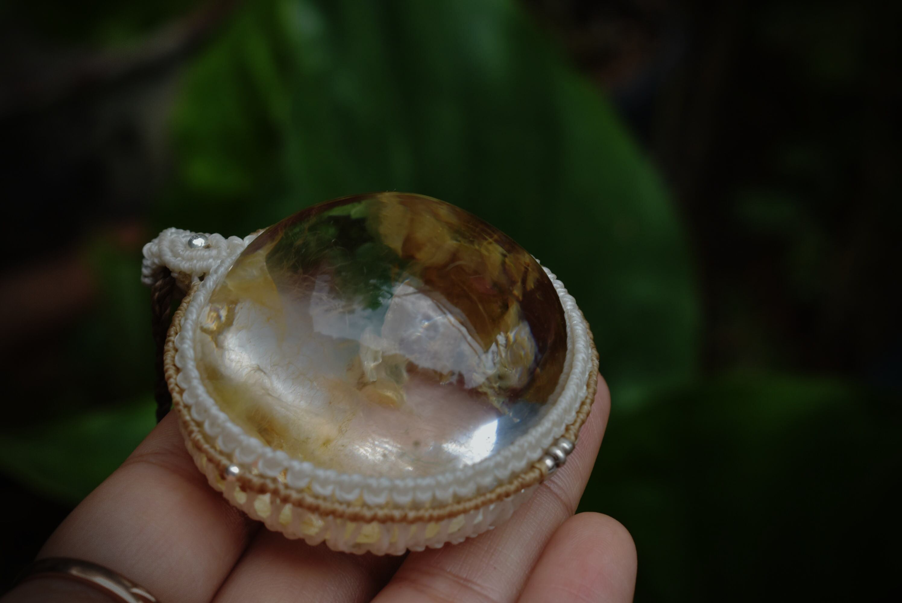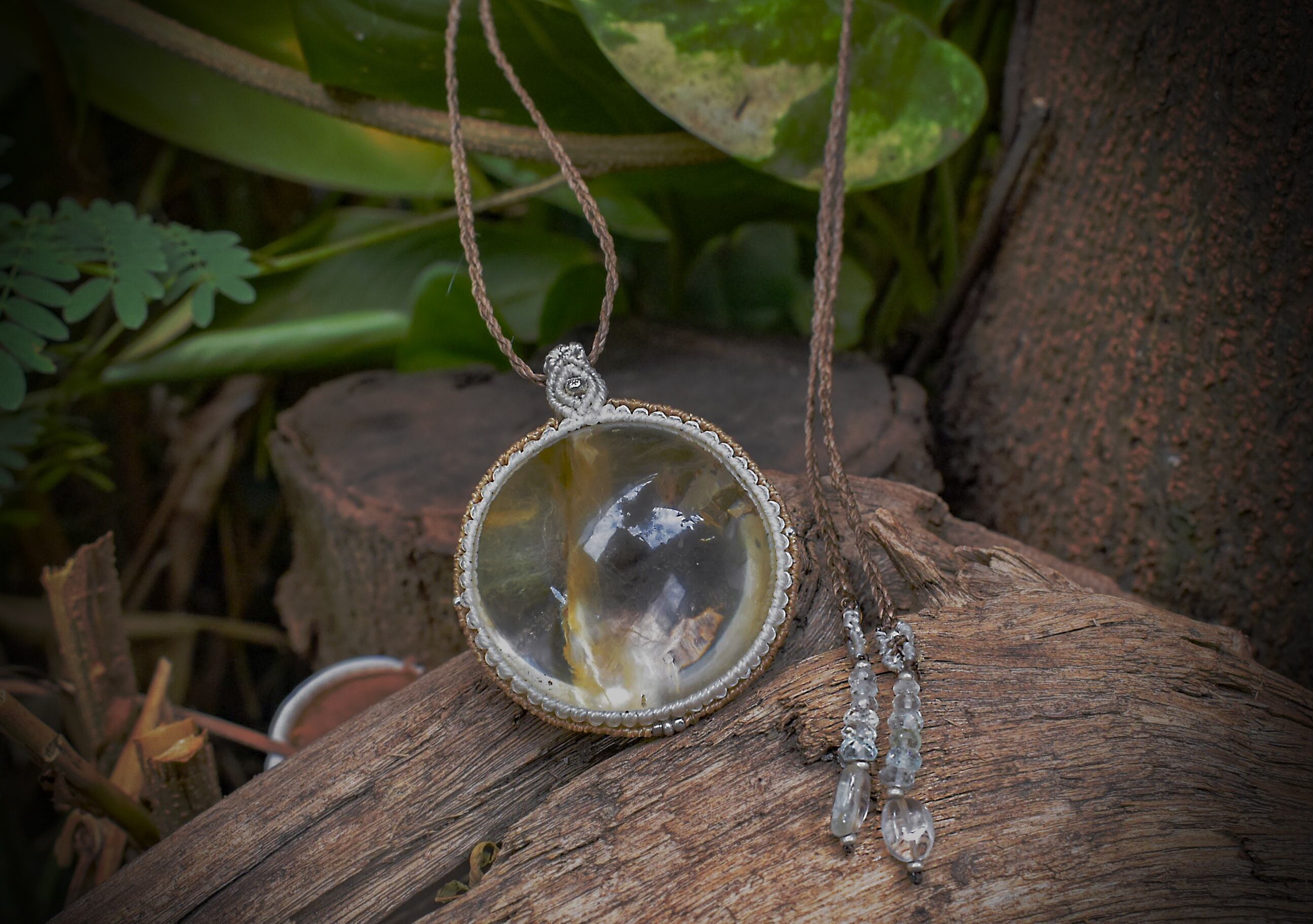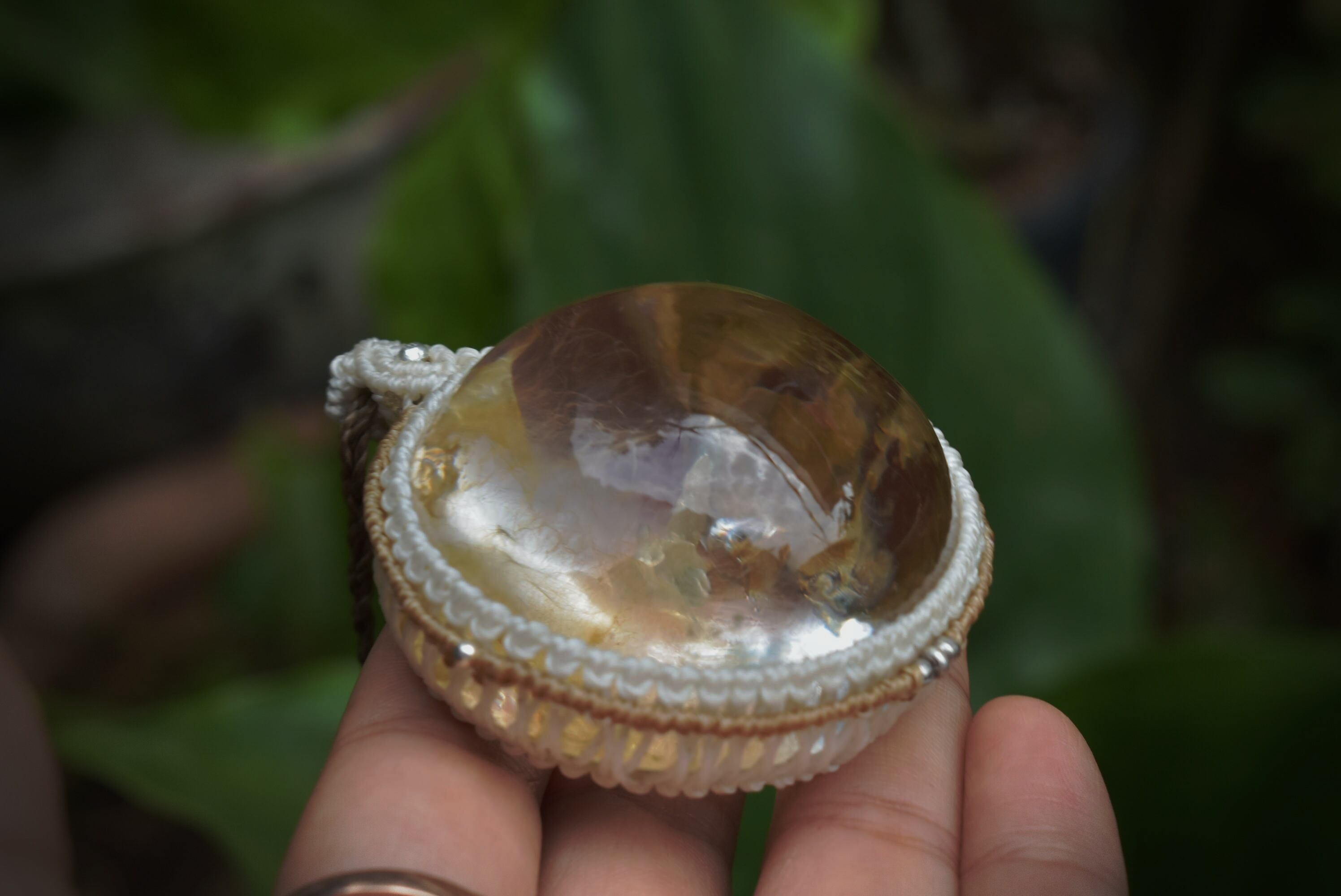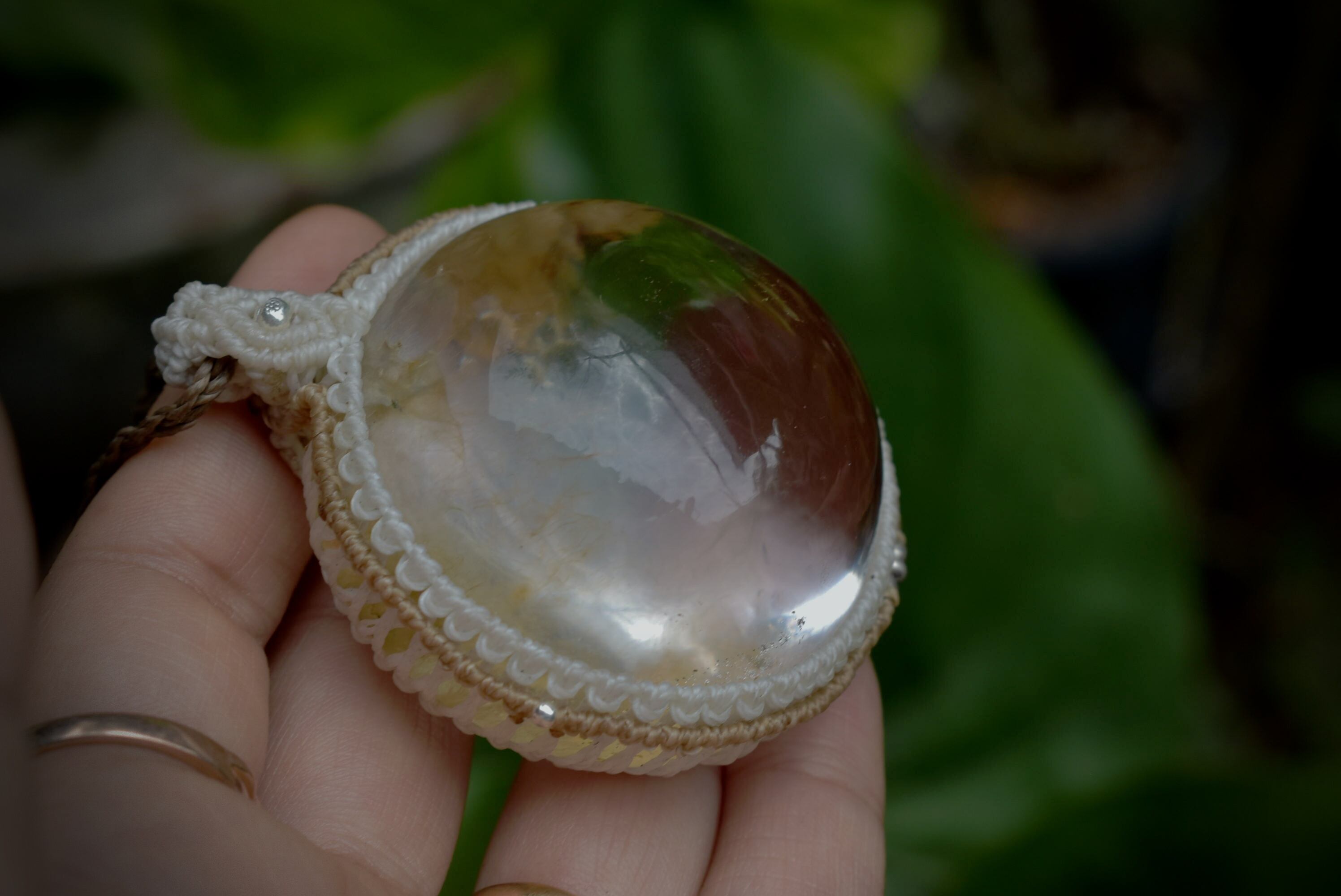大玉水晶の登場です。大きく、透明感がありボリュームある水晶をシンプルに仕上げたマクラメペンダンと。ふわふわと水晶の中を漂う、細かい繊維のようなイエローアンフォボールは