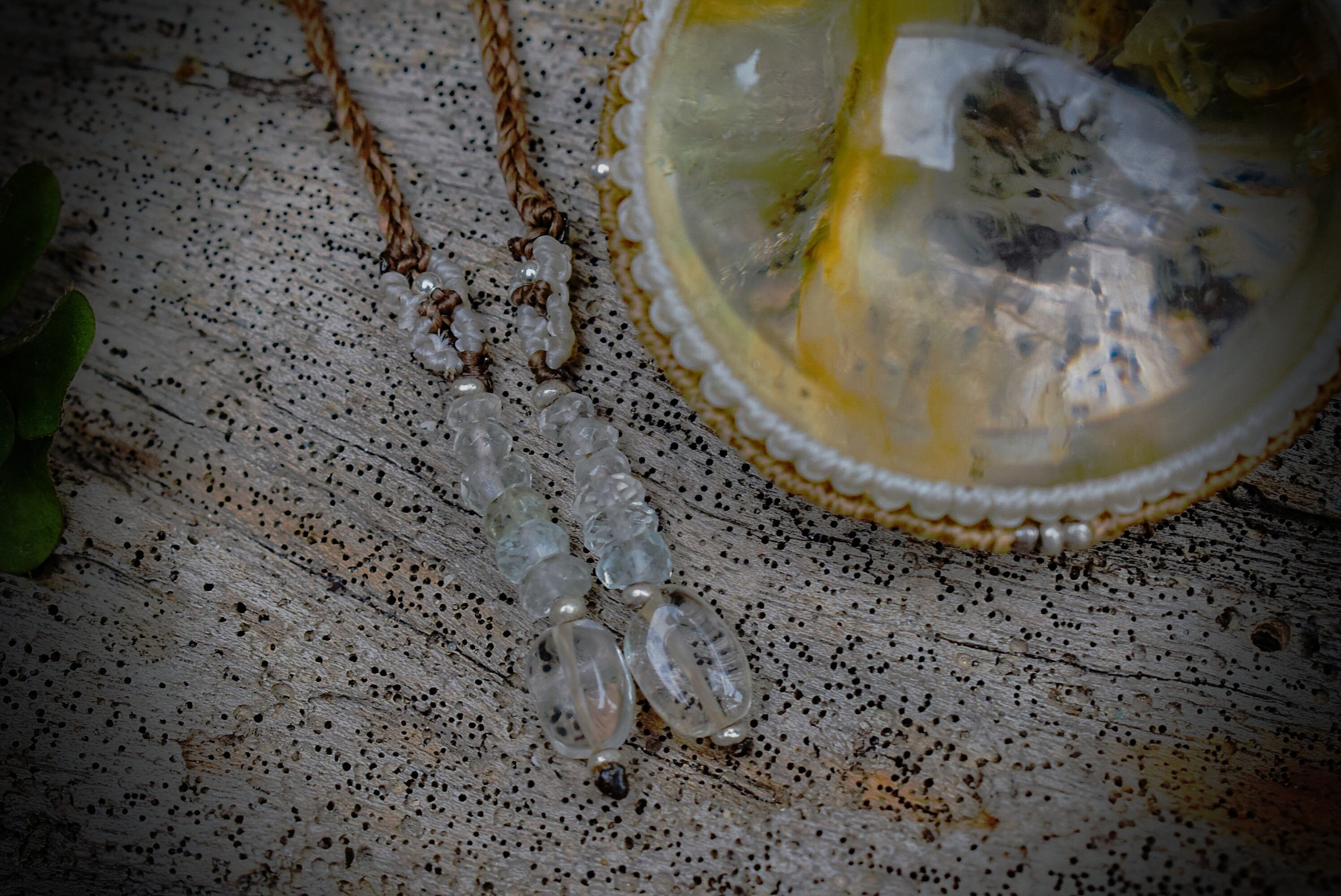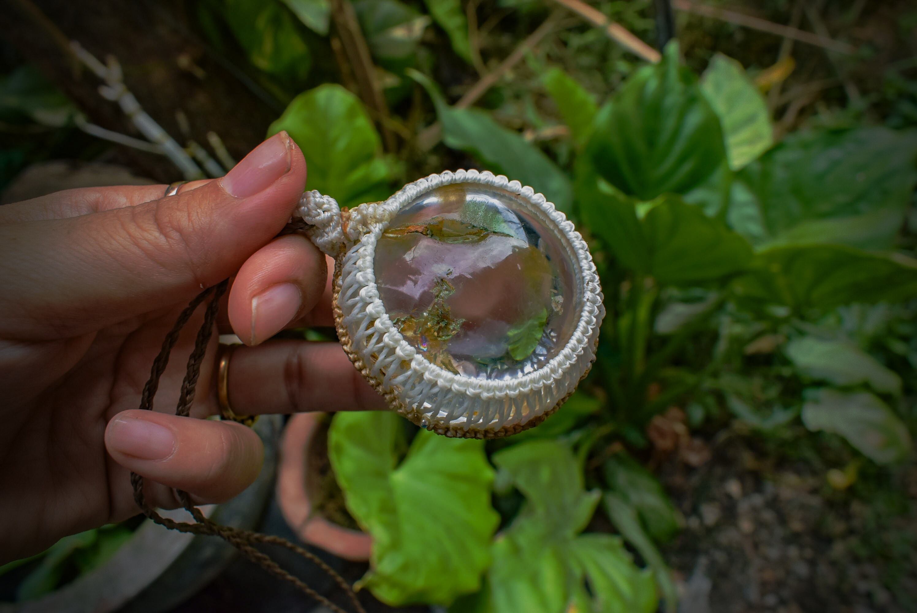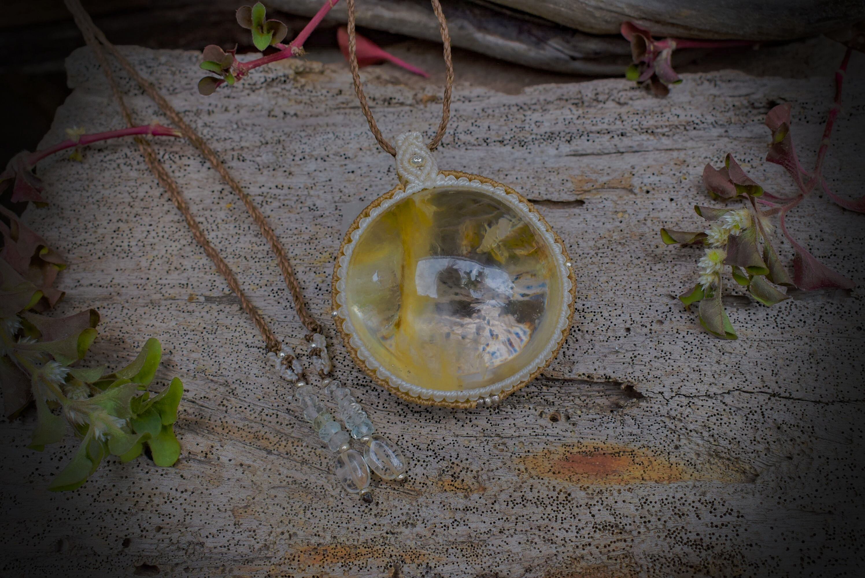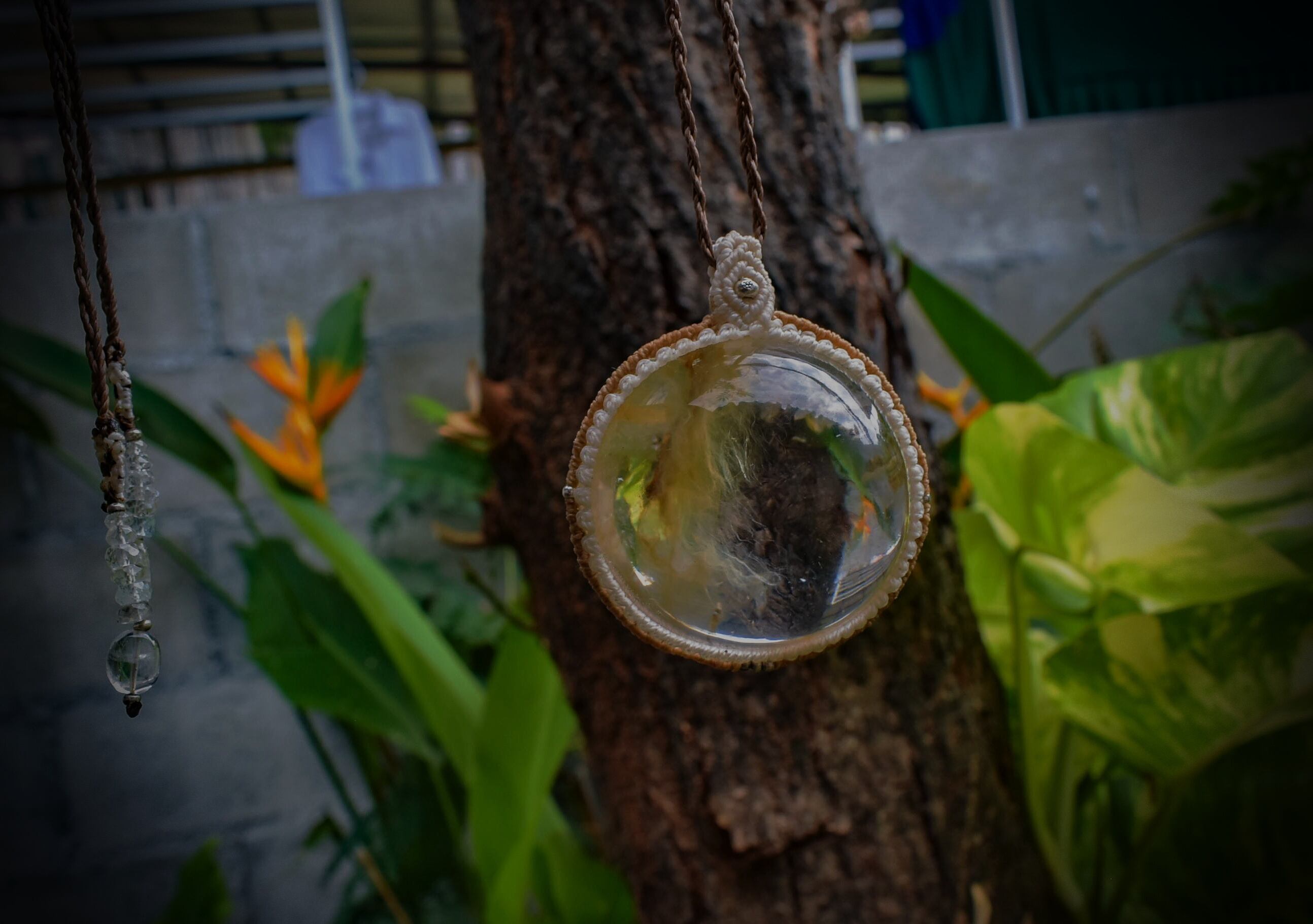 大玉水晶の登場です。大きく、透明感がありボリュームある水晶をシンプルに仕上げたマクラメペンダンと。ふわふわと水晶の中を漂う、細かい繊維のようなイエローアンフォボールは