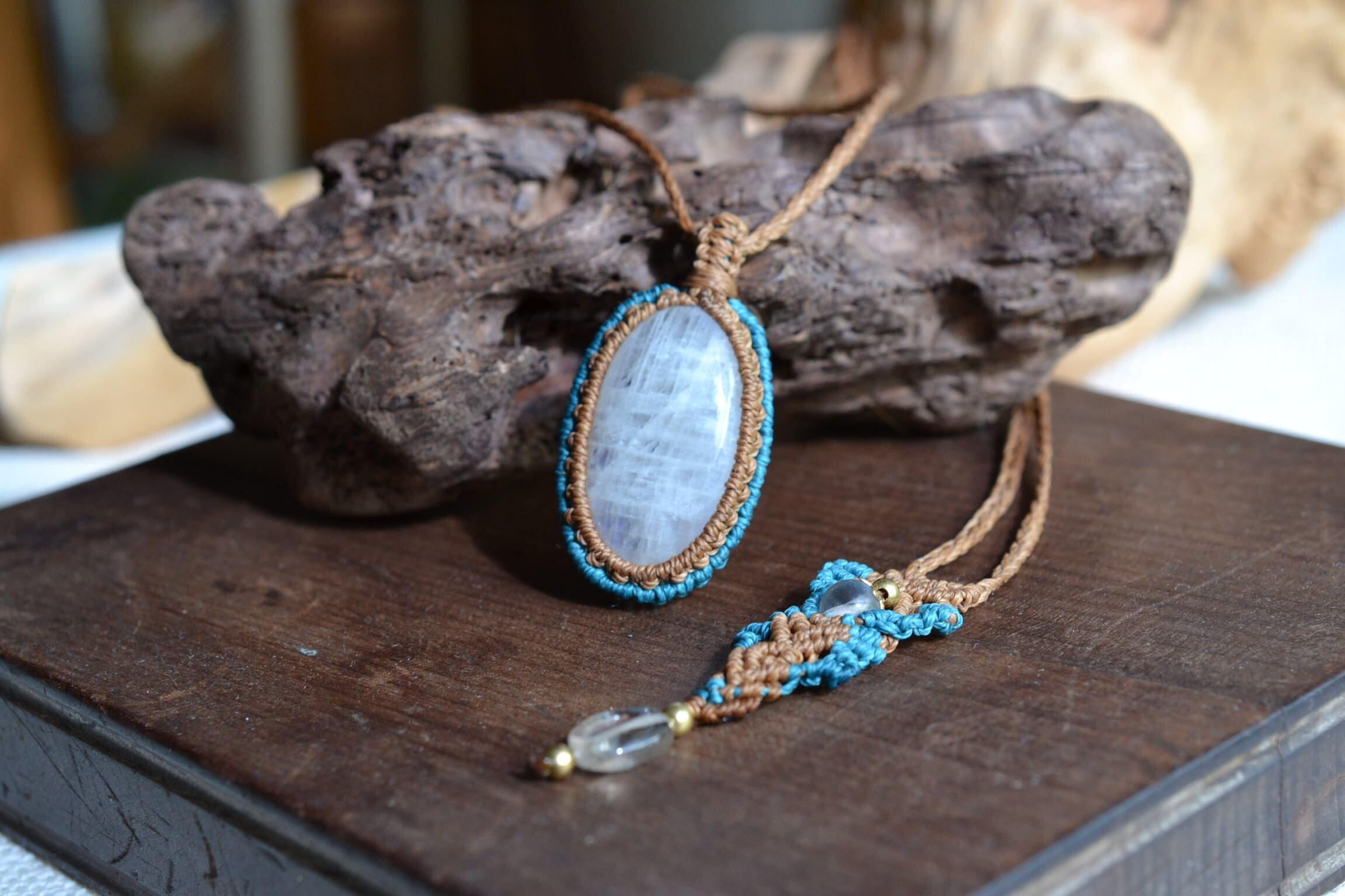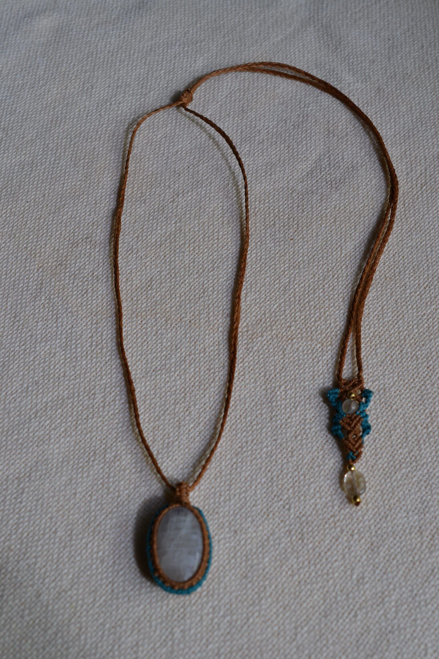 うっすらブルーの輝きが何とも愛おしく見えるムーンストーンをシンプルにマクラメ編み装飾を施してペンダントに仕上げました。