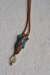 ゴールドカラーとコバルトブルーの蝋引き糸を組み合わせ、石が引き立つように包み込みました。シンプルですが石の輝きが良く映えるペンダントです。