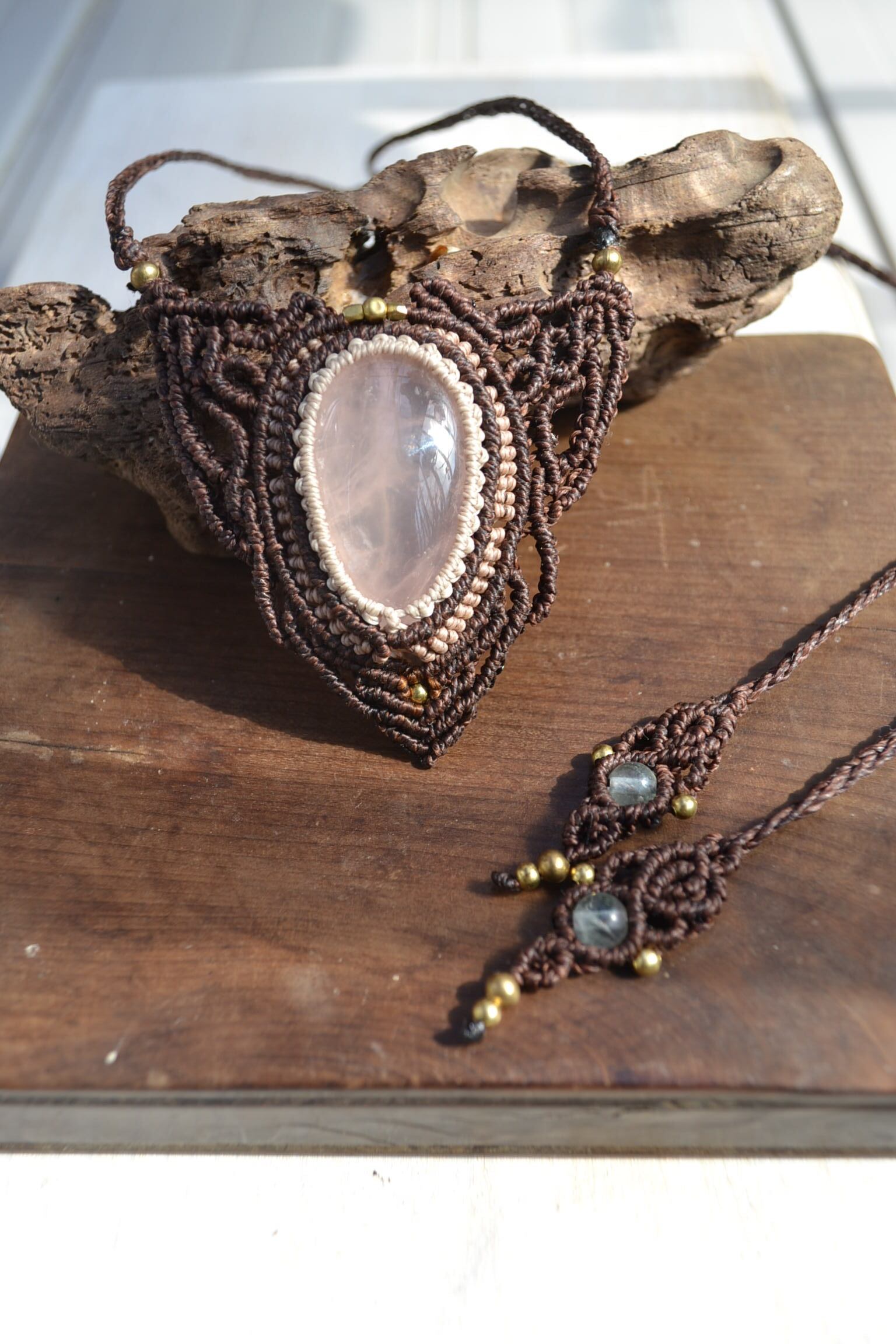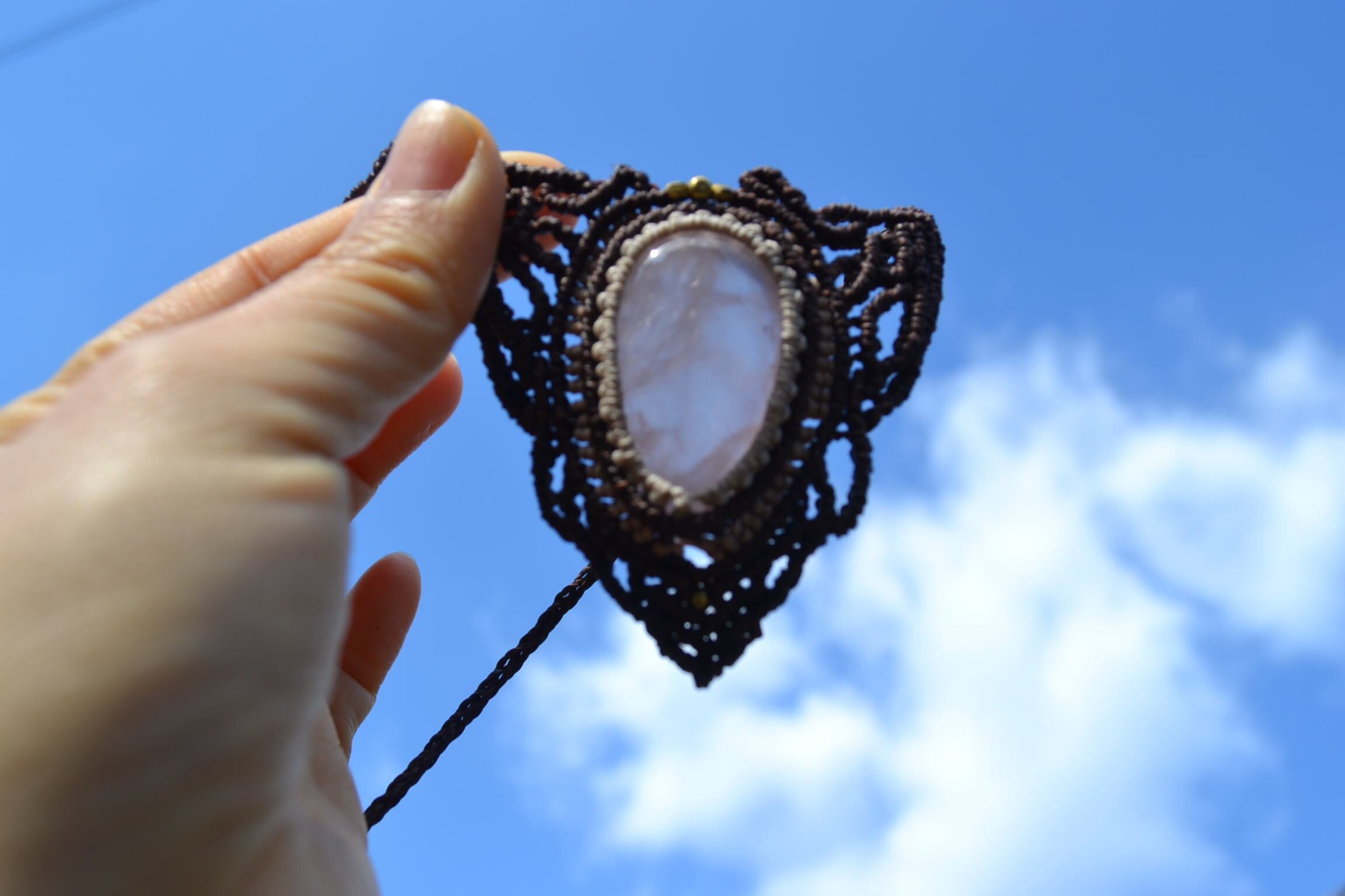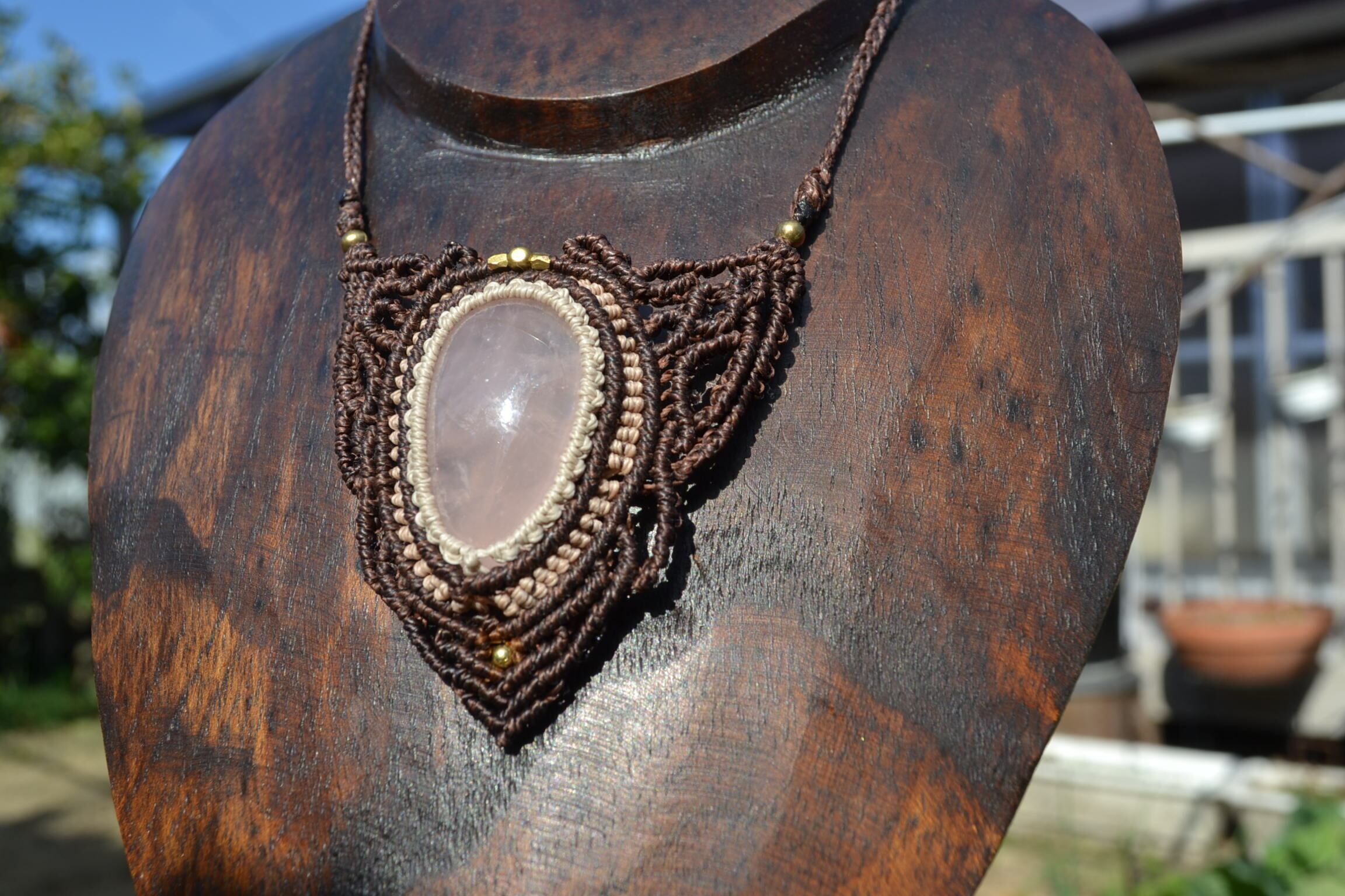 つるんとしたボディの中に創造的なクラッシュとシラーが見え隠れするキュートなローズクォーツをっ装着時に体の中心に輝きを放てるように包み込むようにしてスクエア型にマクラメ編み装飾し、特徴的なペンダントネックレスを制作しました。