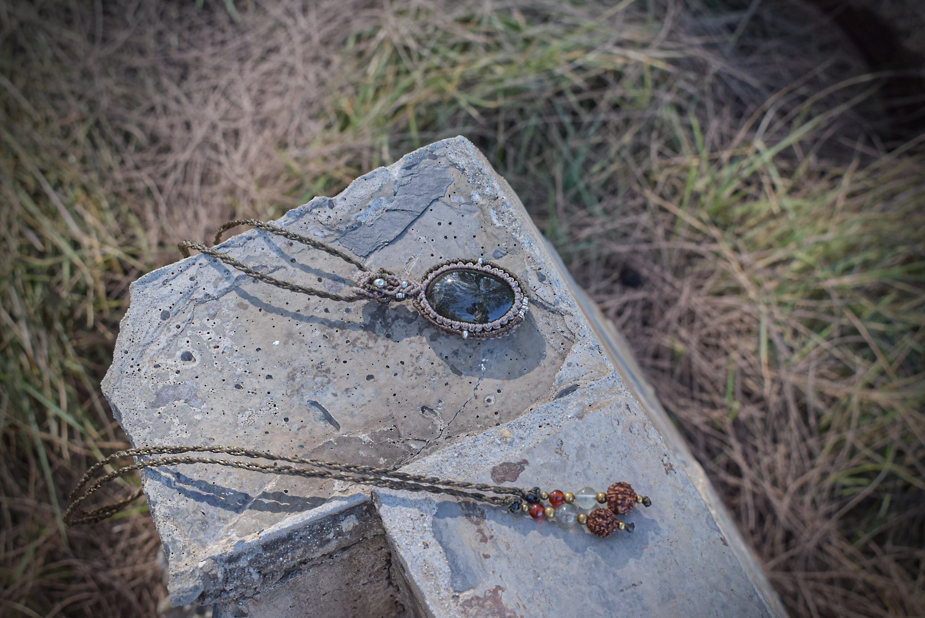 ◆このたびはオリーブ、ピンクベージュ色の蝋引き糸を使用しマクラメ編み装飾を施しました。