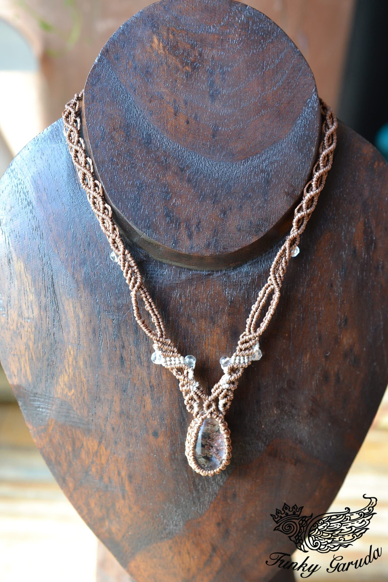 澄んだクリアな世界の中にまばゆいシラーとお庭を覗かせてくれるすっきりとした印象のガーデンクオーツをテディベアブラウンカラーの蝋引き糸を使用してマクラメ編み装飾し、装飾部分に遊びのあるネックレスを制作しました。