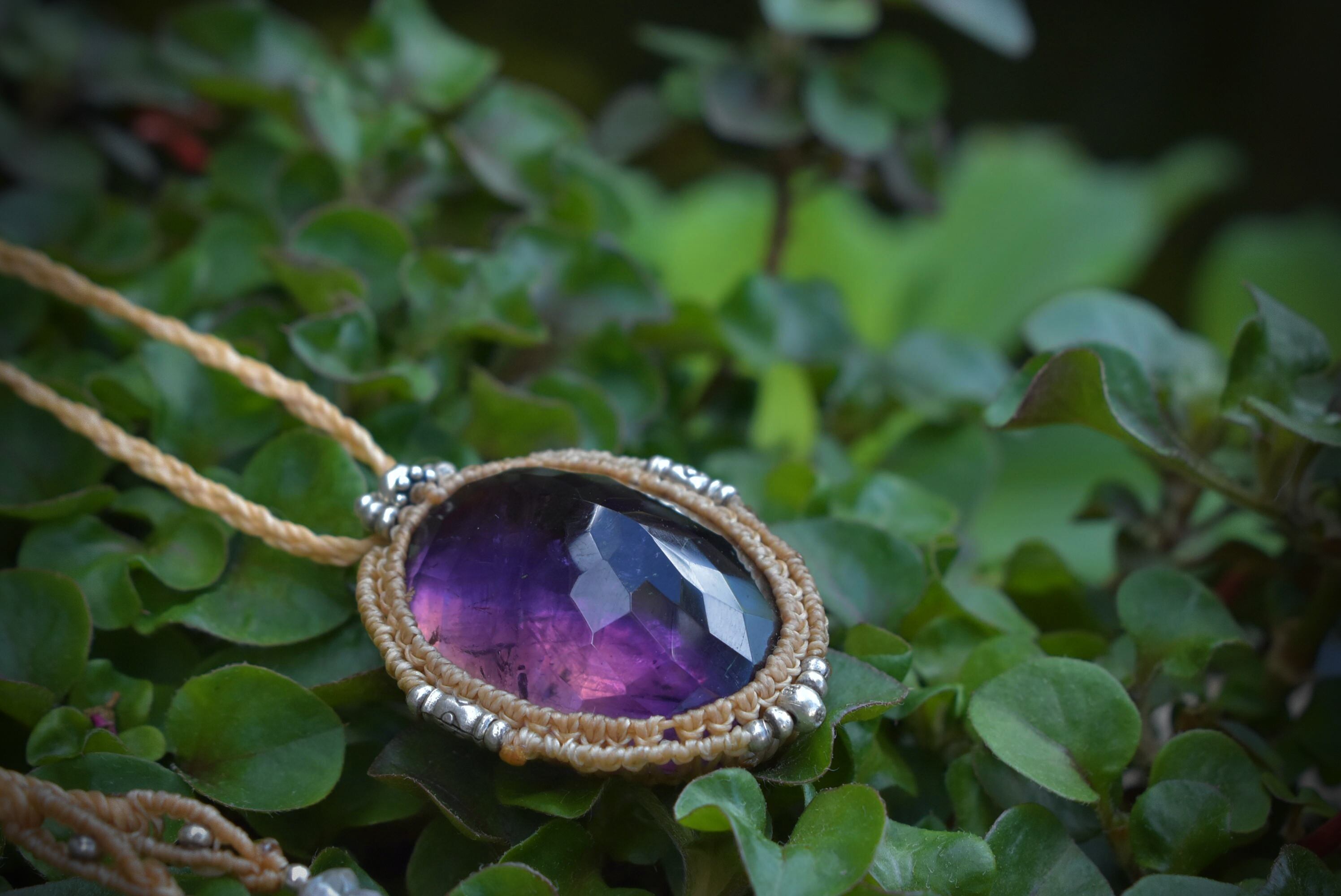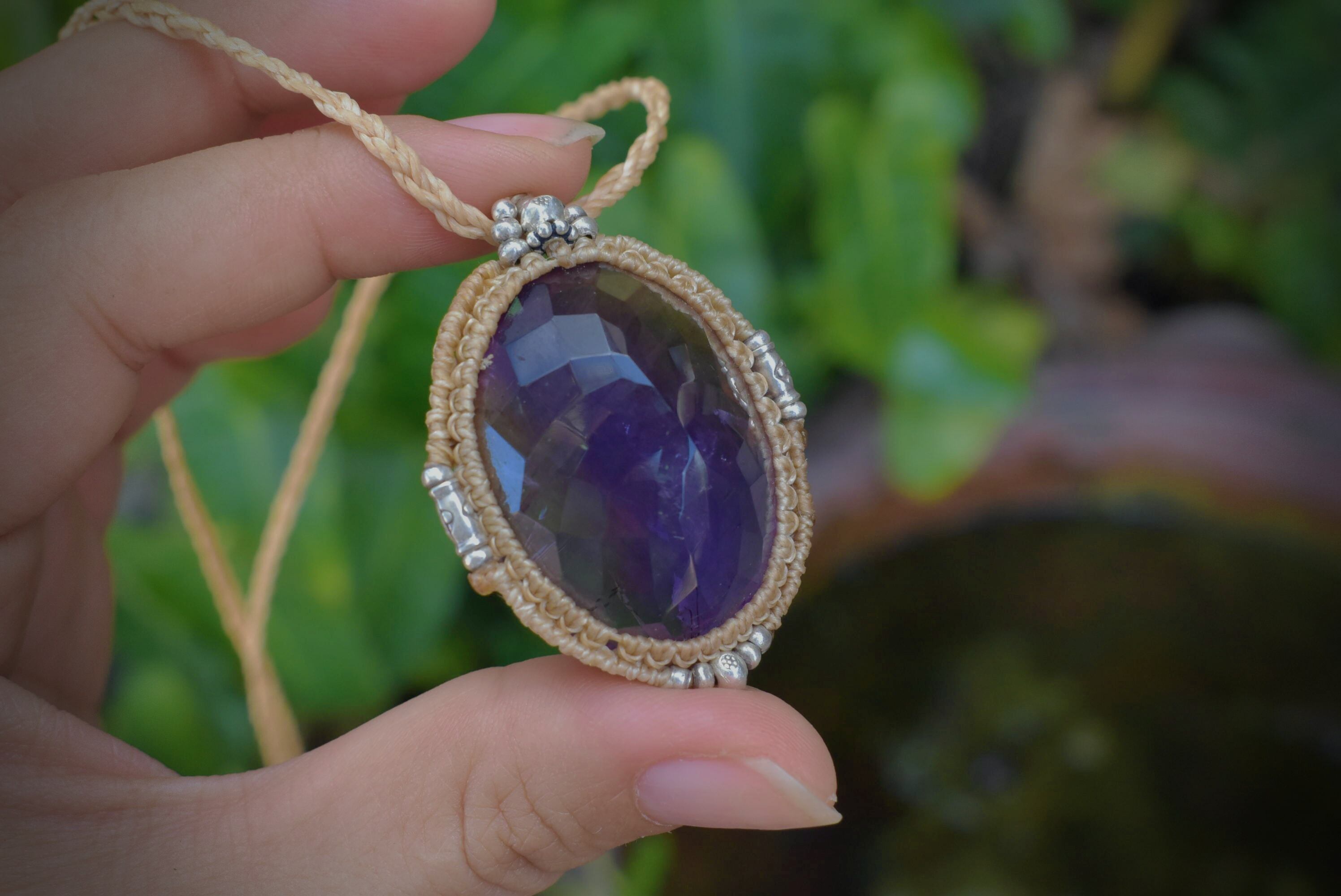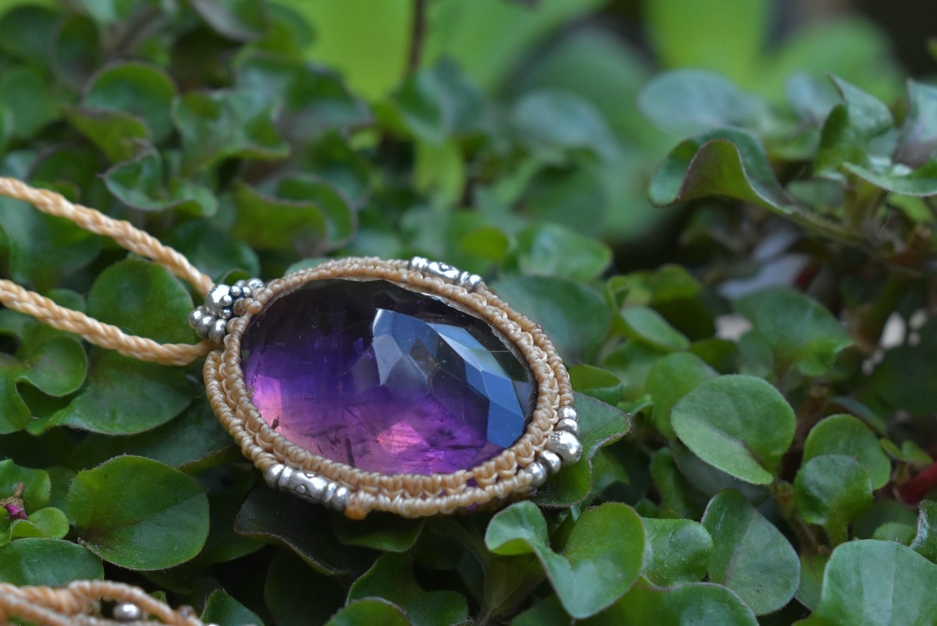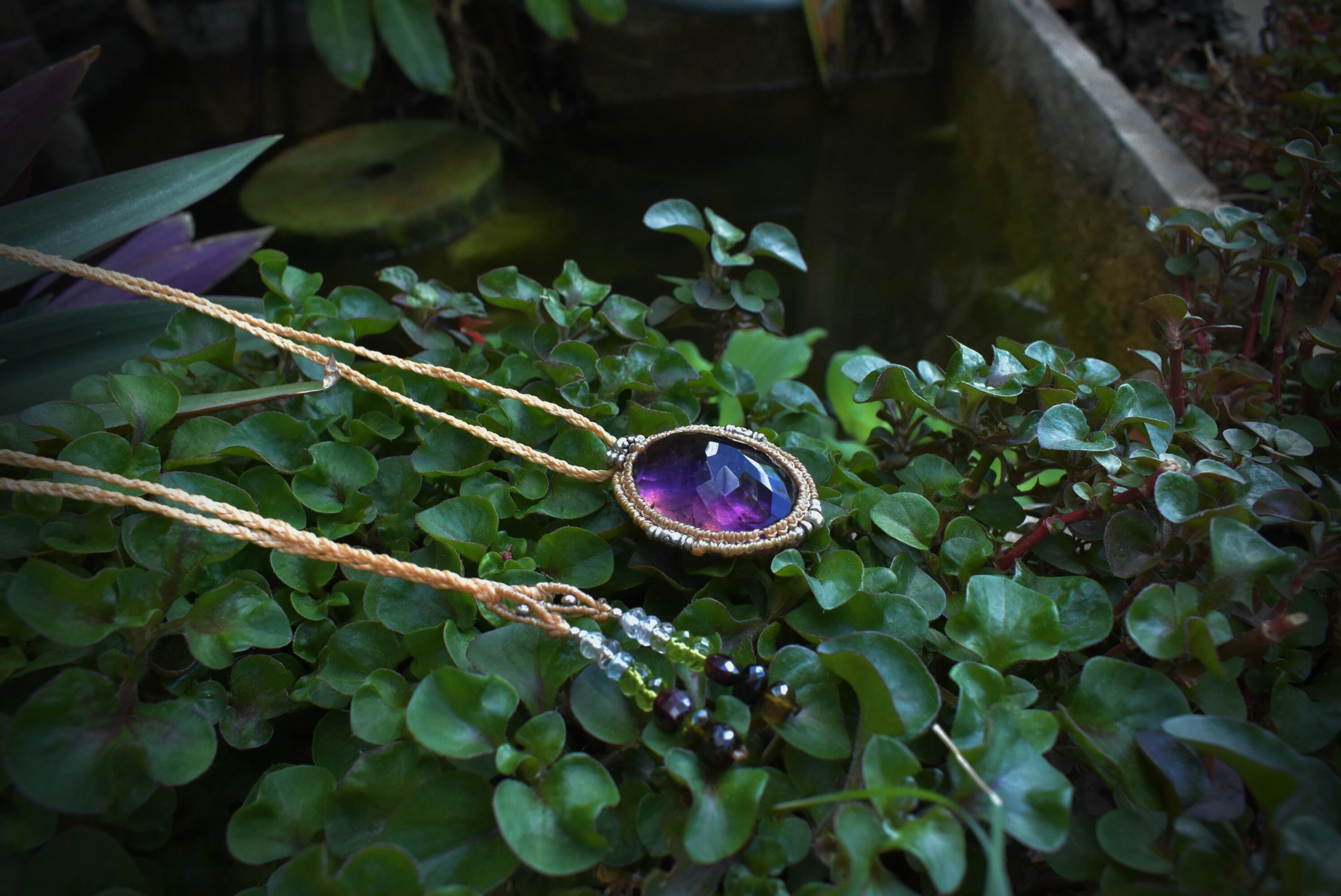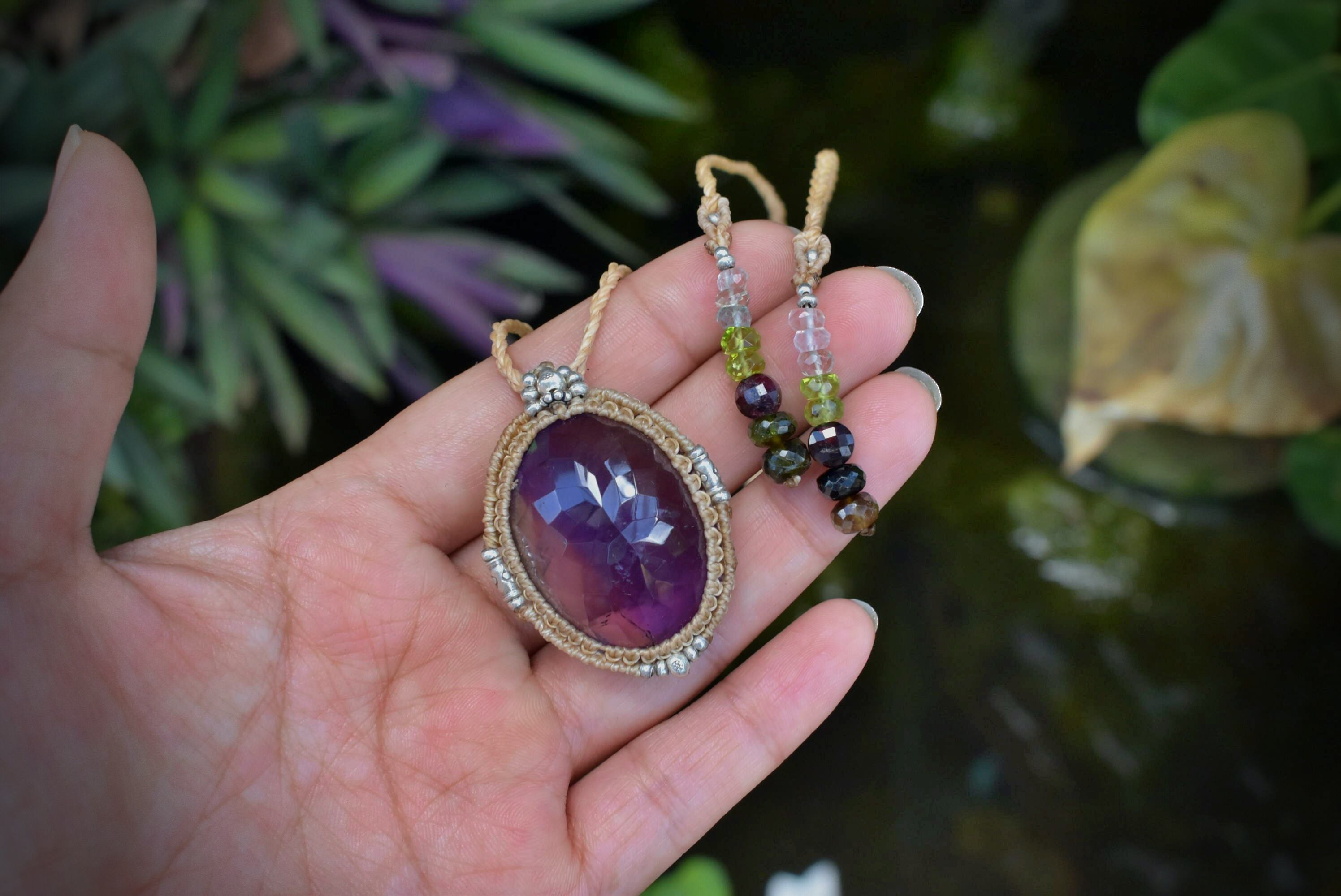 美しく細かいファセットカットが石全体に施されているアメトリン。石の中の世界は液体が溶け込むような丁度良い混ざりあった部分を見ることができます。よく見るとルチルの内包物や虹のプリズムインクルージョンもチラホラ。何よりも透明感と石自体の質感が素晴らしいので見飽きることのないジェムクォリティーのアメトリンを贅沢にカレンシルバー92.5をあしらい、マクラメ編みペンダントに仕上げました。