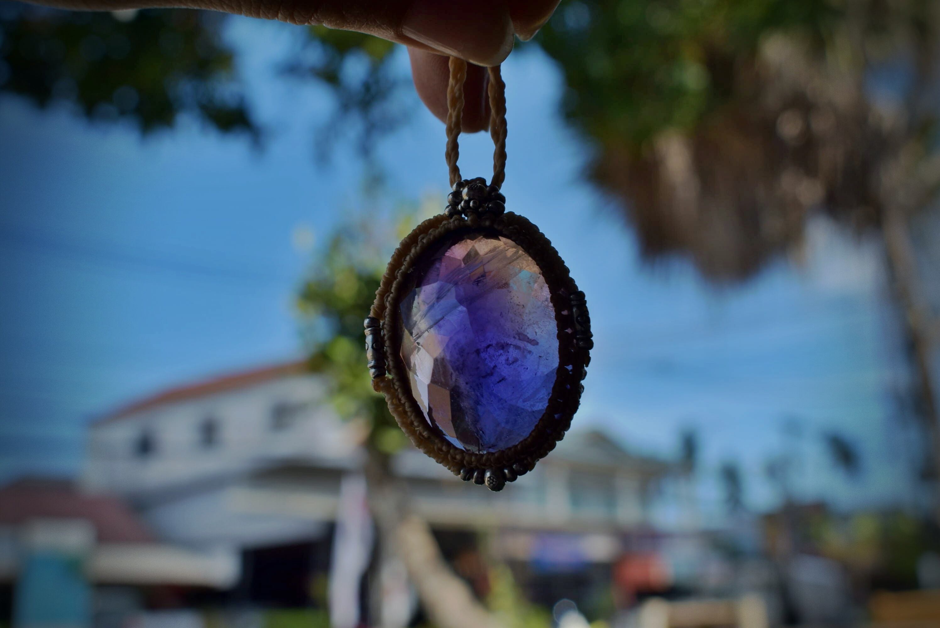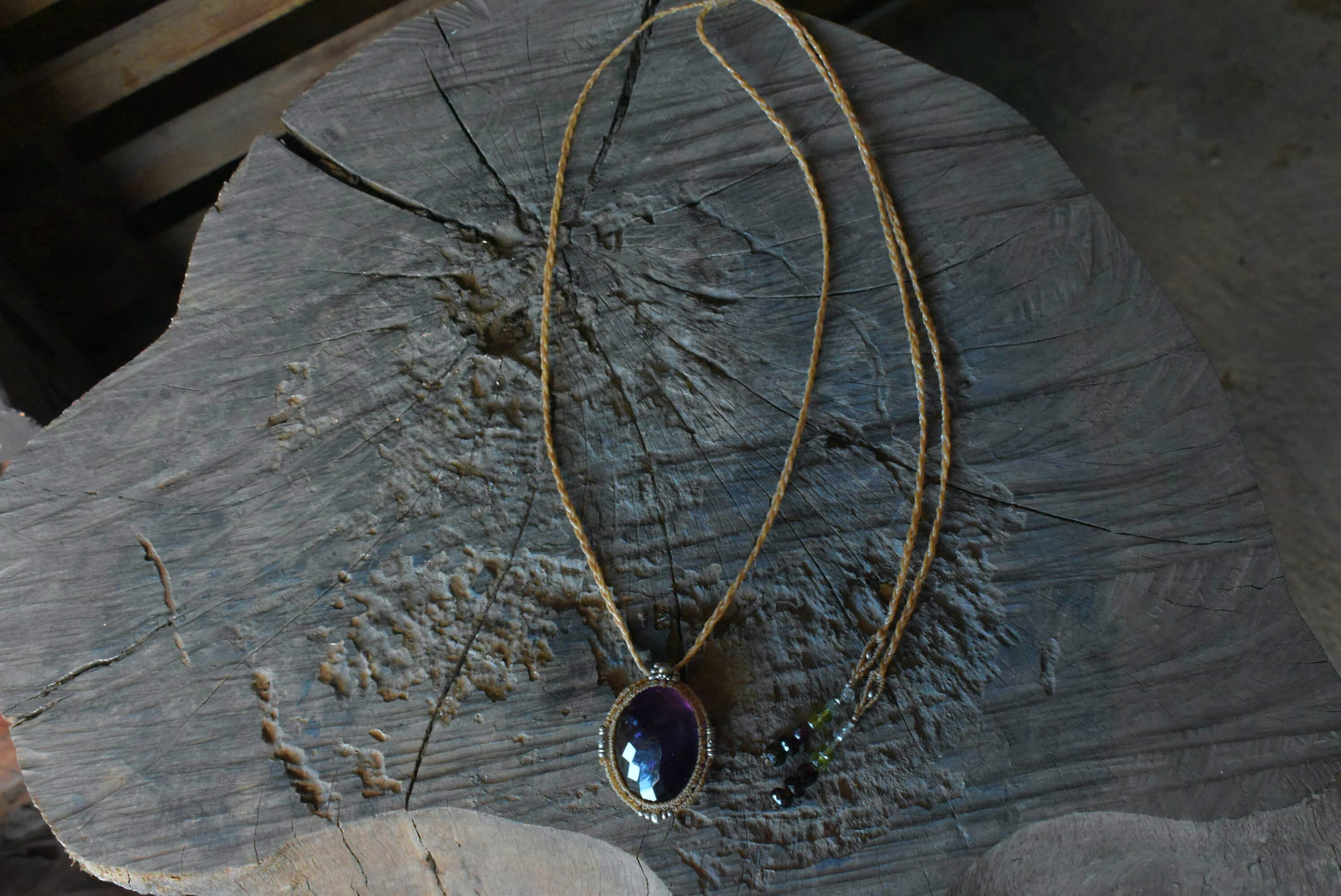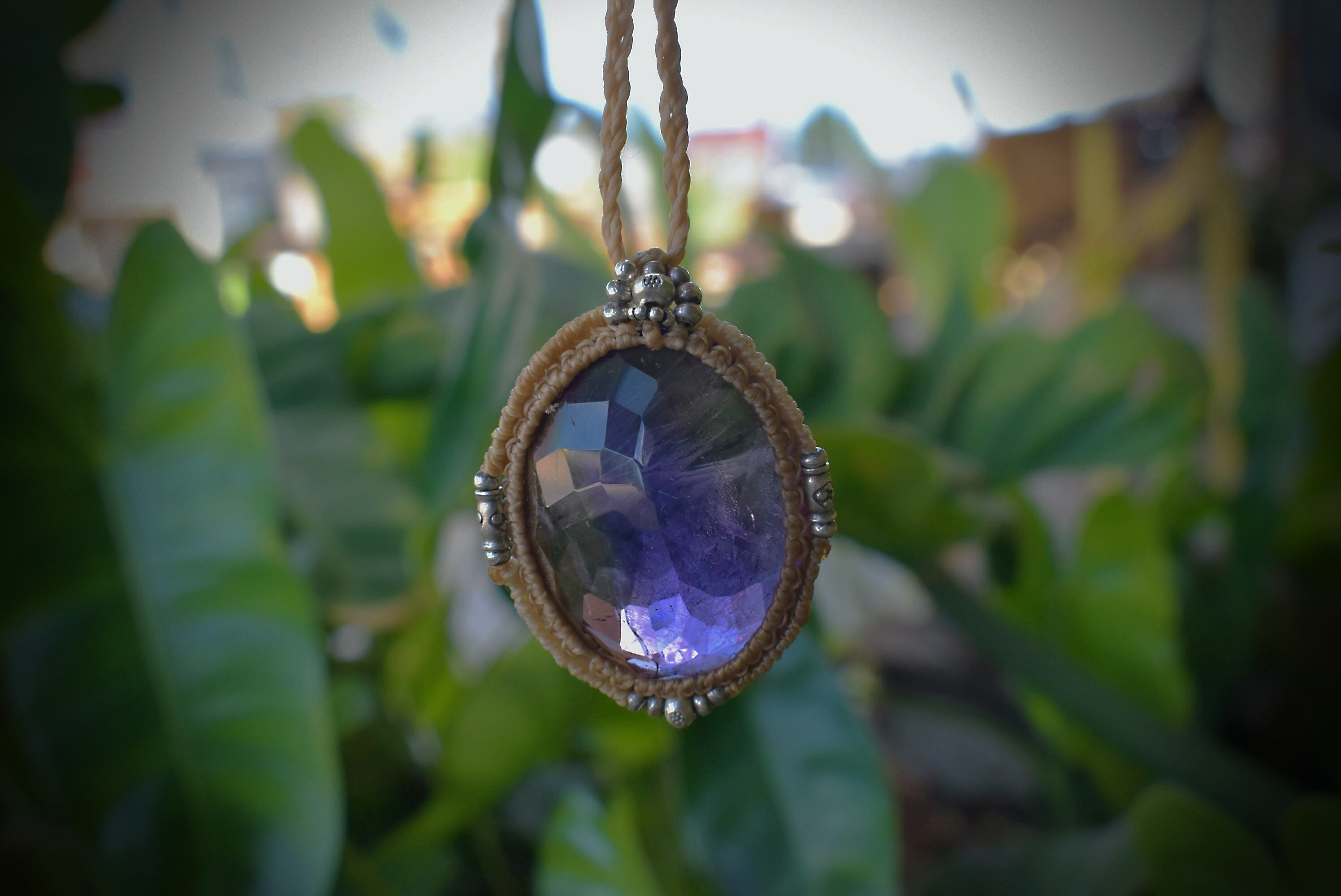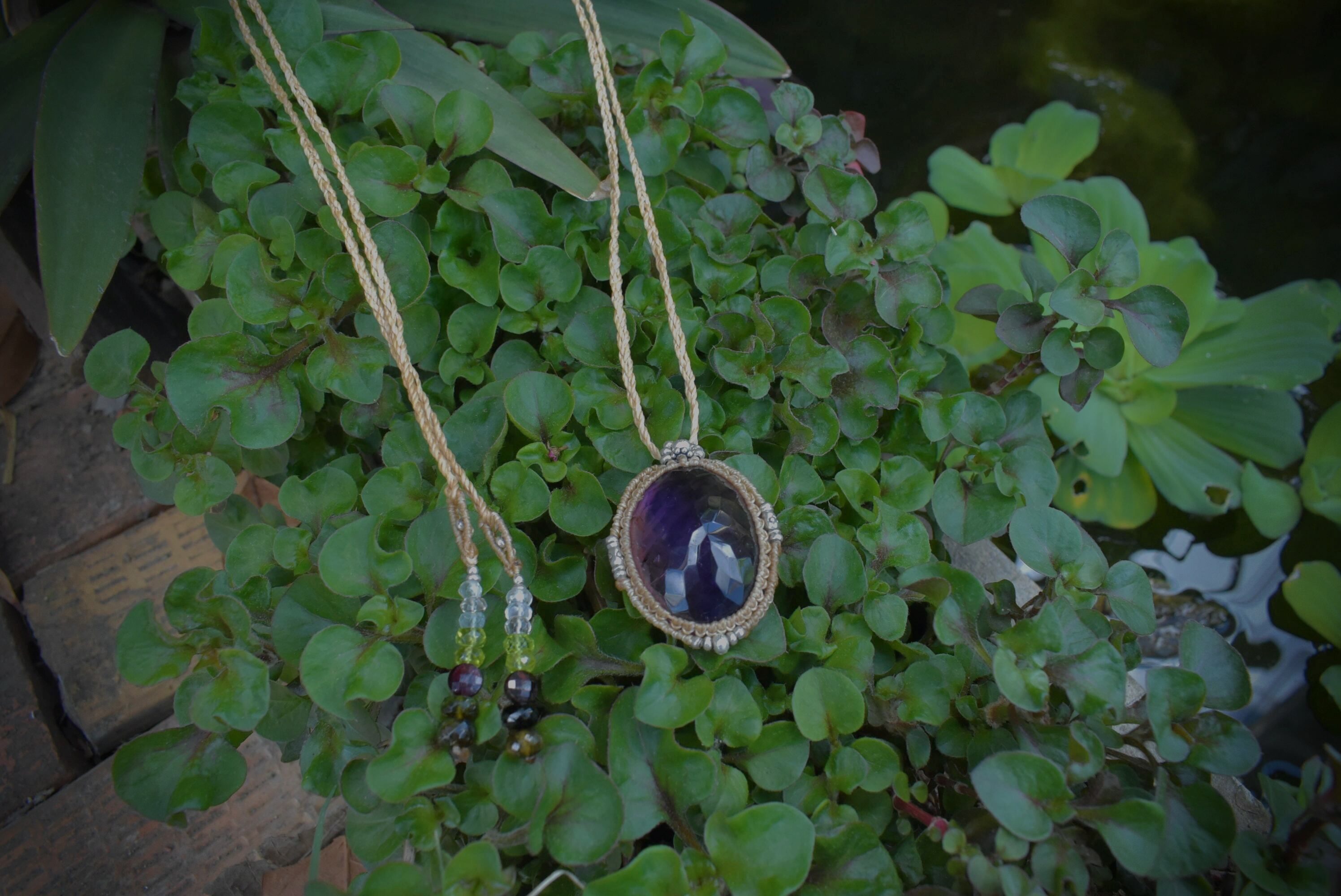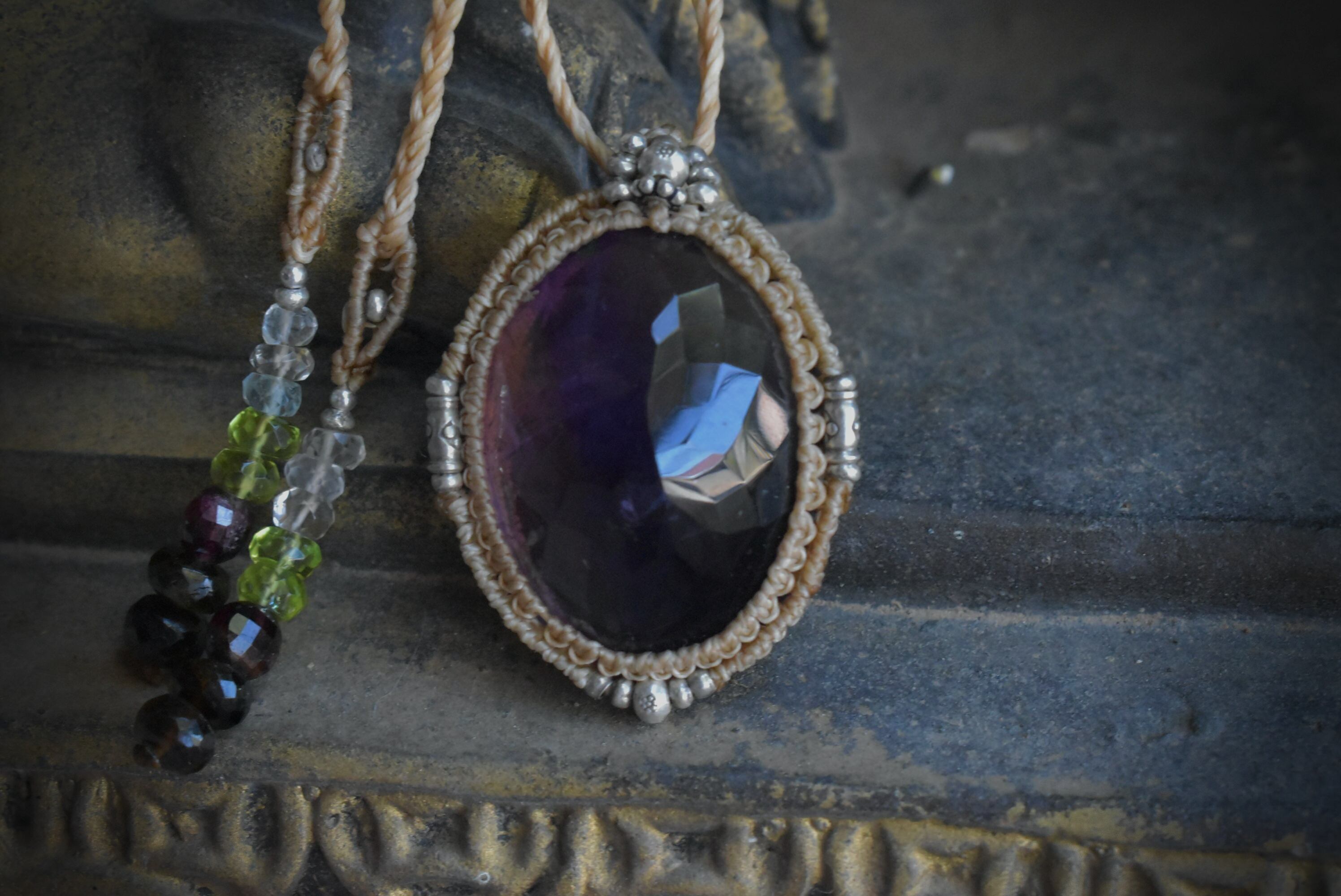 美しく細かいファセットカットが石全体に施されているアメトリン。石の中の世界は液体が溶け込むような丁度良い混ざりあった部分を見ることができます。よく見るとルチルの内包物や虹のプリズムインクルージョンもチラホラ。何よりも透明感と石自体の質感が素晴らしいので見飽きることのないジェムクォリティーのアメトリンを贅沢にカレンシルバー92.5をあしらい、マクラメ編みペンダントに仕上げました。