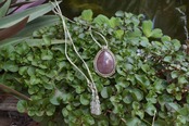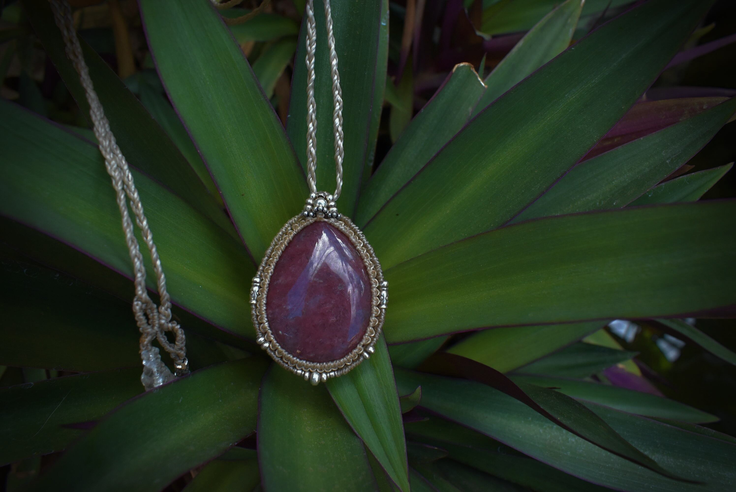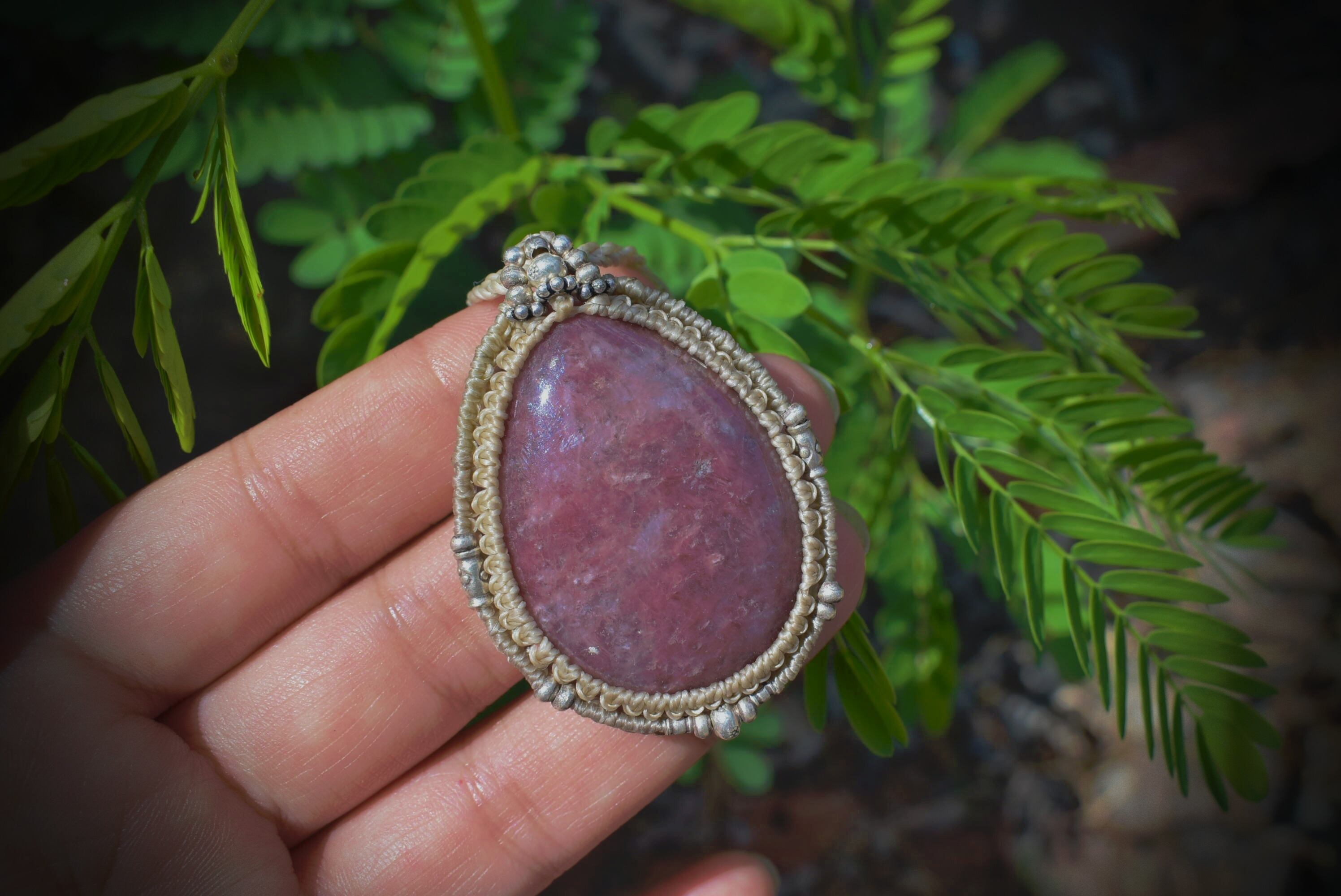 ピンク色のボディを持つチューライトを市場から仕入れてきたので、さっそくカレンシルバービーズを細やかにあしらってマクラメ編みペンダントに仕上げました。