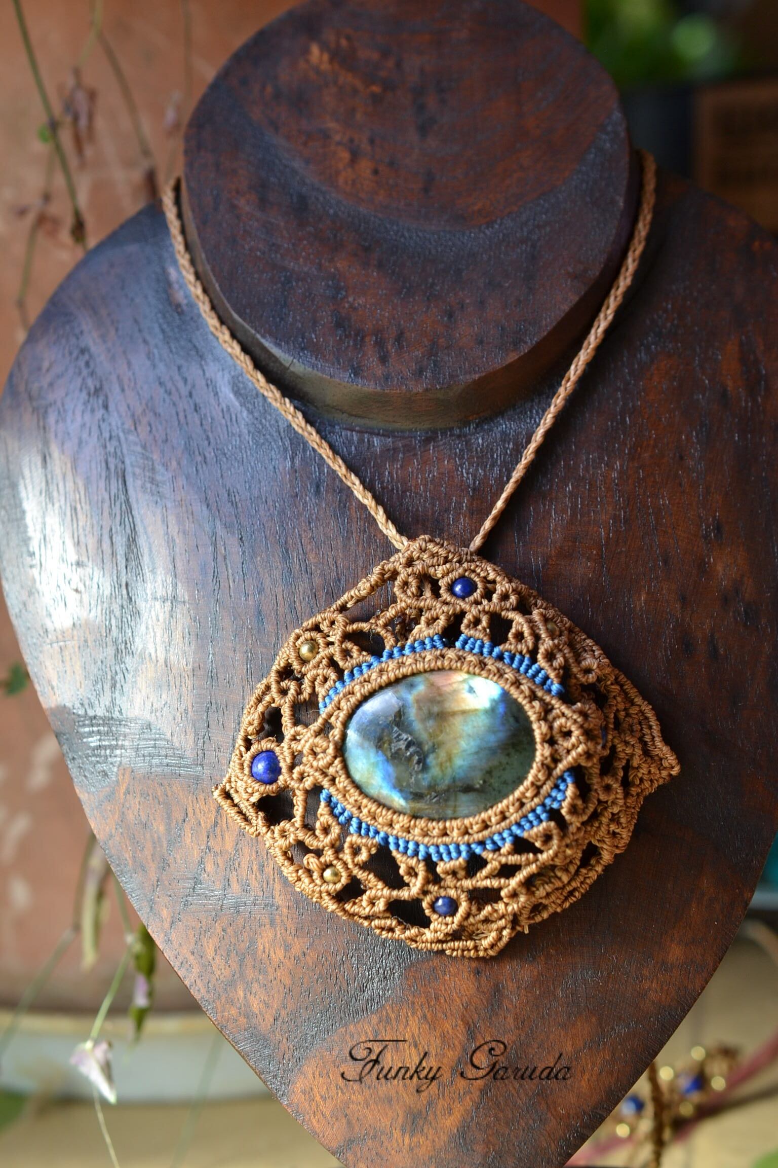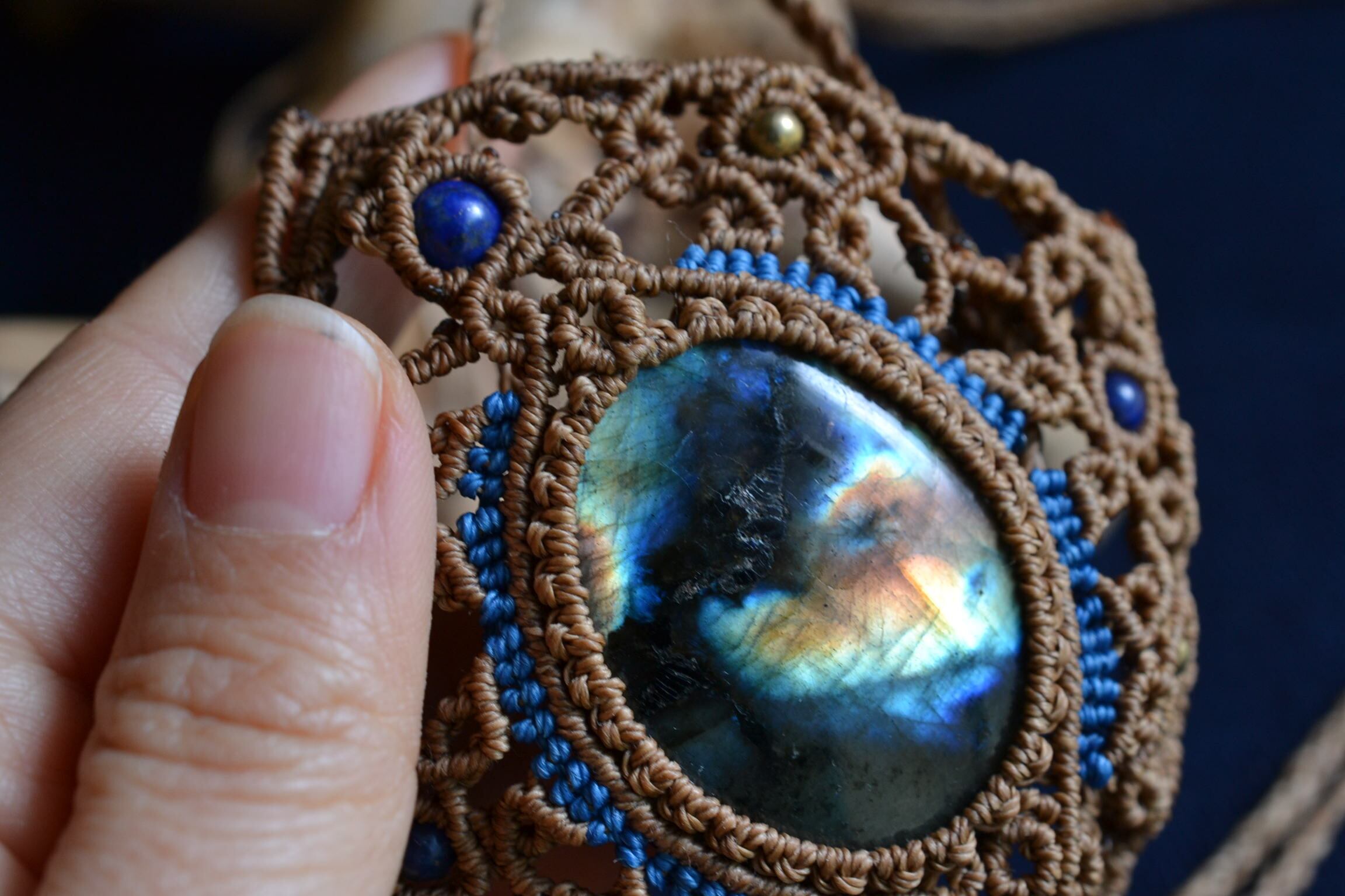 ネックレスを装着したときに、背守りとなる紐の先のエンド部分にもラピスラズリビーズと真鍮パーツを一緒に編み込んでマクラメ編み装飾を施しました。