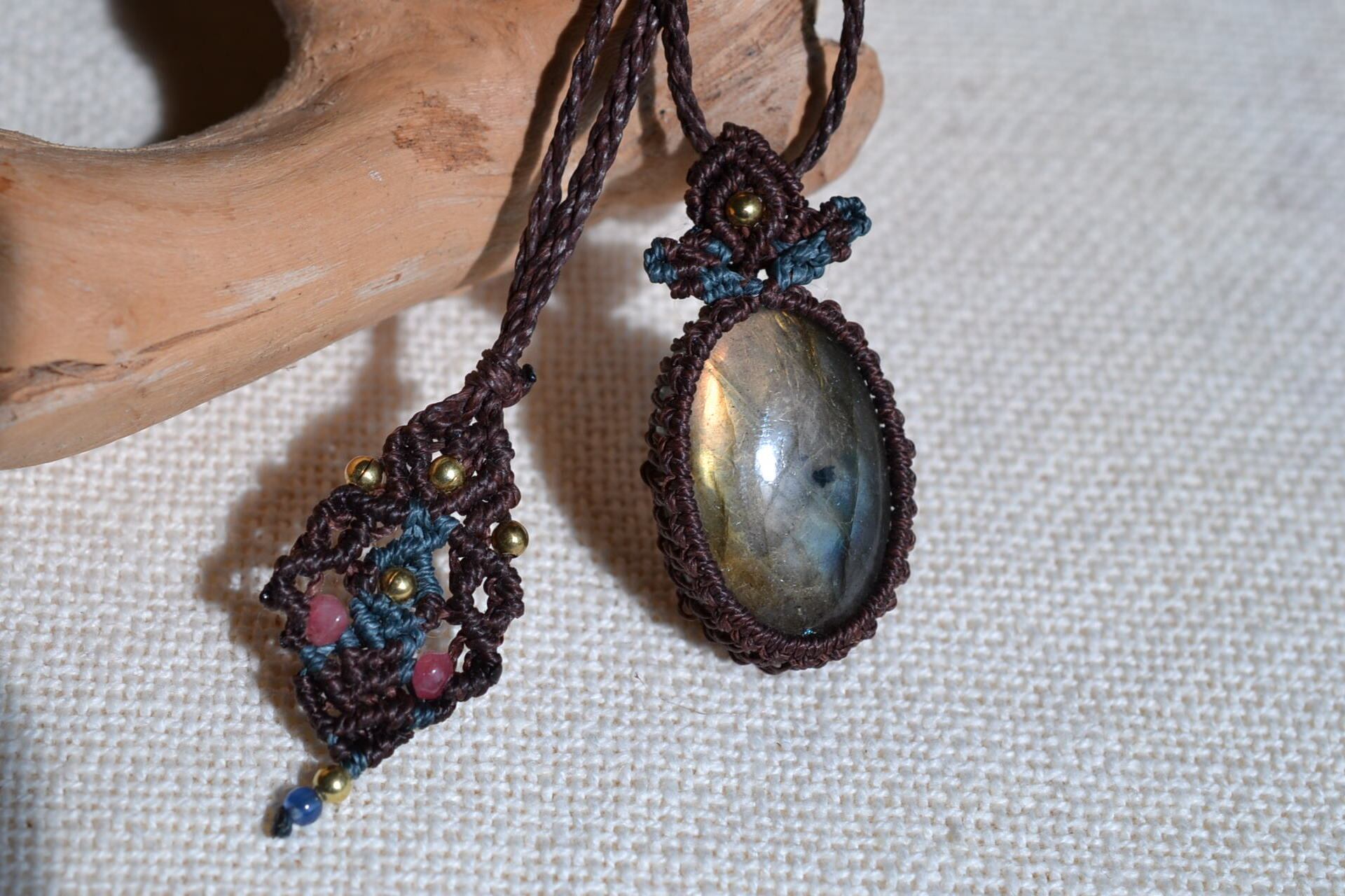 ネックレスを装着したときに、背守りとなる紐の先のエンド部分にはピンクトルマリンビーズと真鍮パーツも一緒に編み込んでマクラメ編み装飾を施しました。