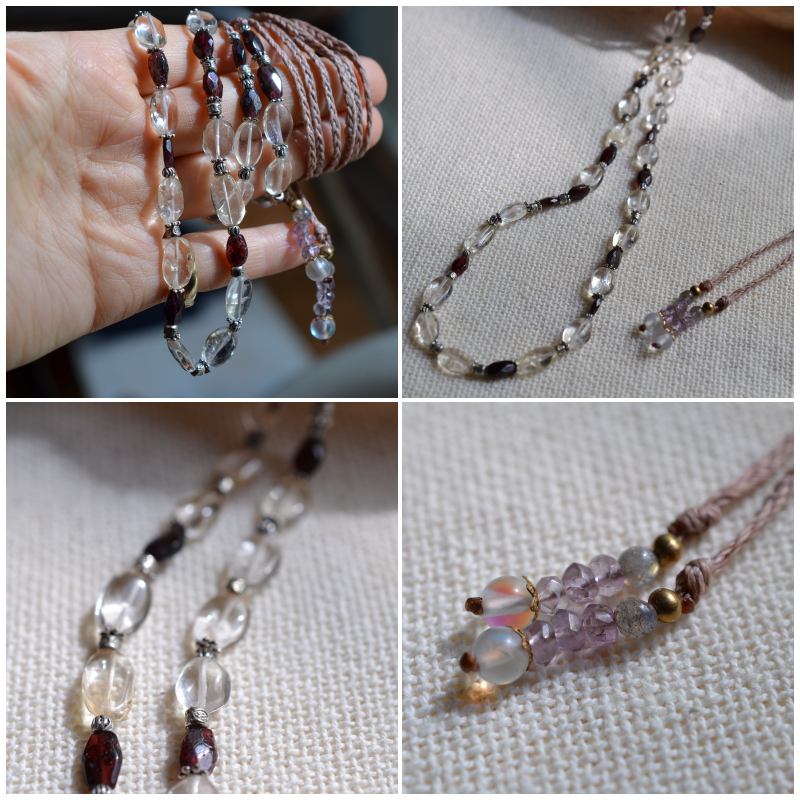 みなさまに大人気の石、ガーネットやクリアクオーツ、ムーンストーン..など、良質な天然石ビーズをひとつひとつ繋ぎ合わせ、重量感ある贅沢なロングネックレスに仕上げました。