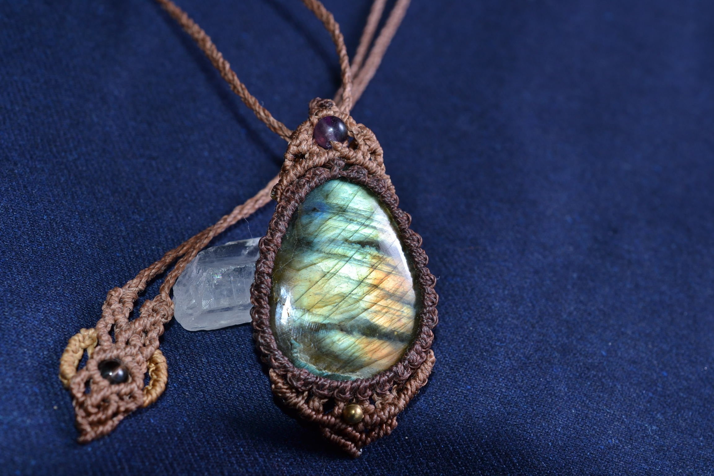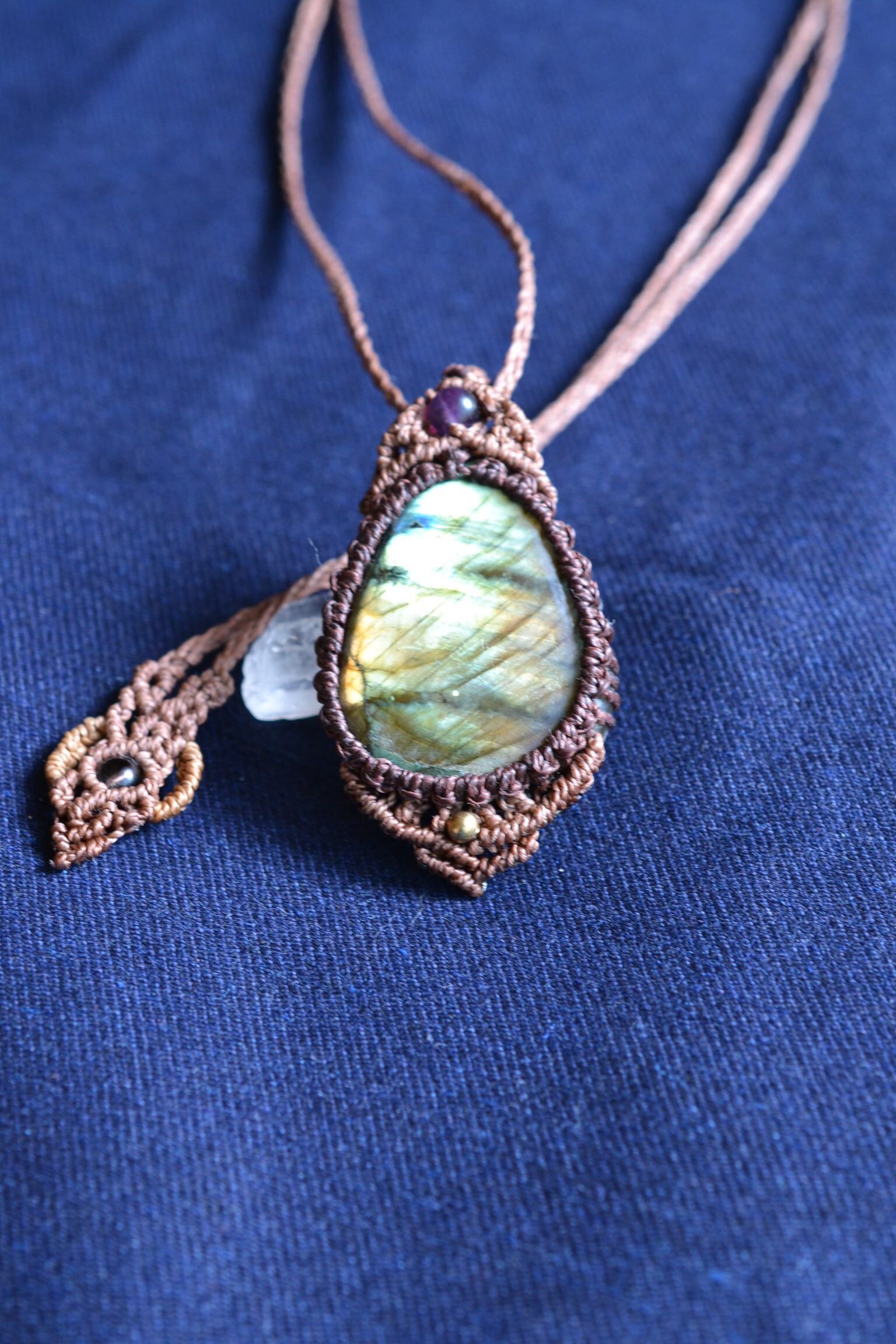 ネックレスを装着したときに、背守りとなる紐の先のエンド部分にはスモーキークオーツビーズを一緒に編み込んでマクラメ編み装飾を施しました。