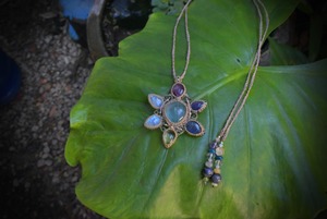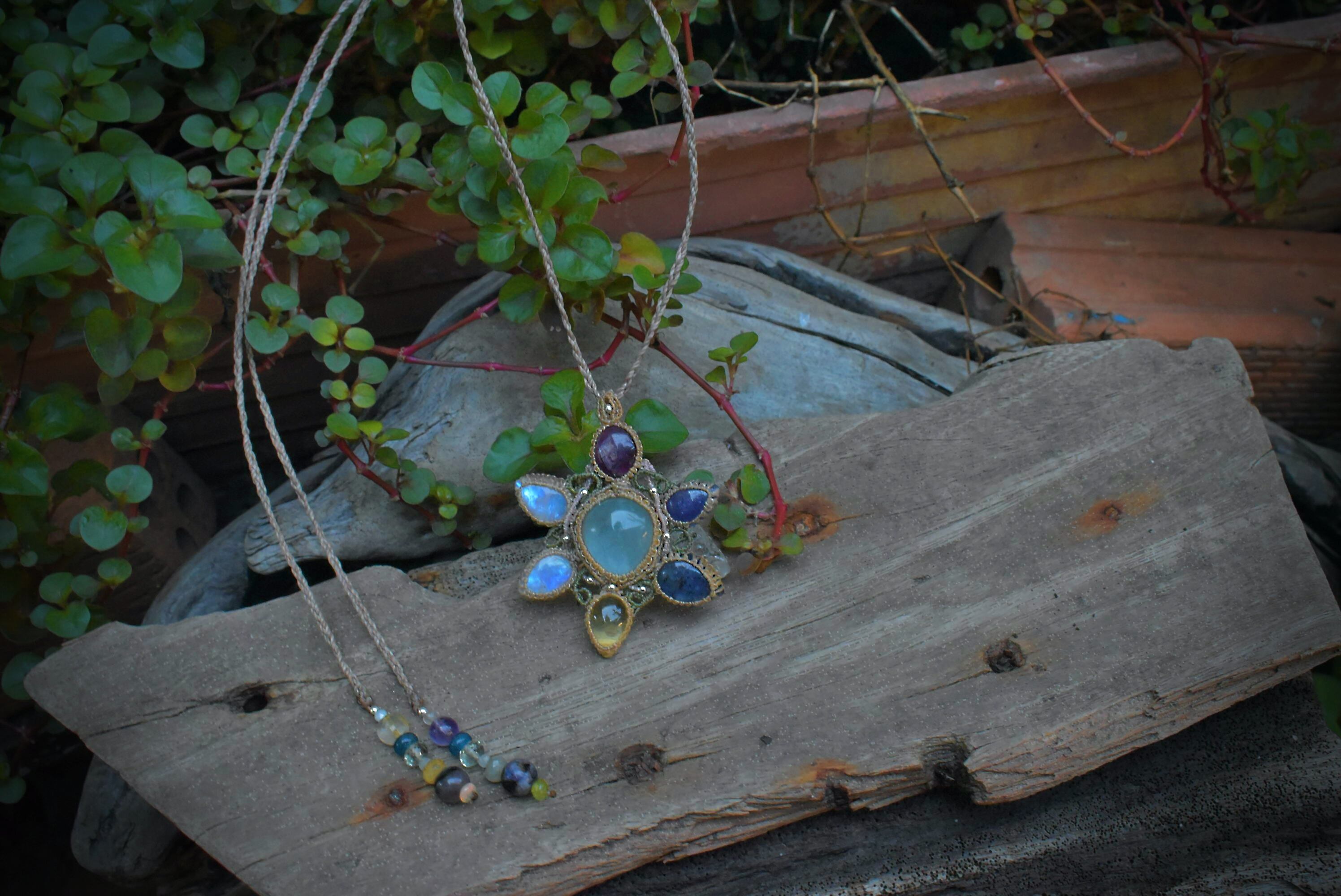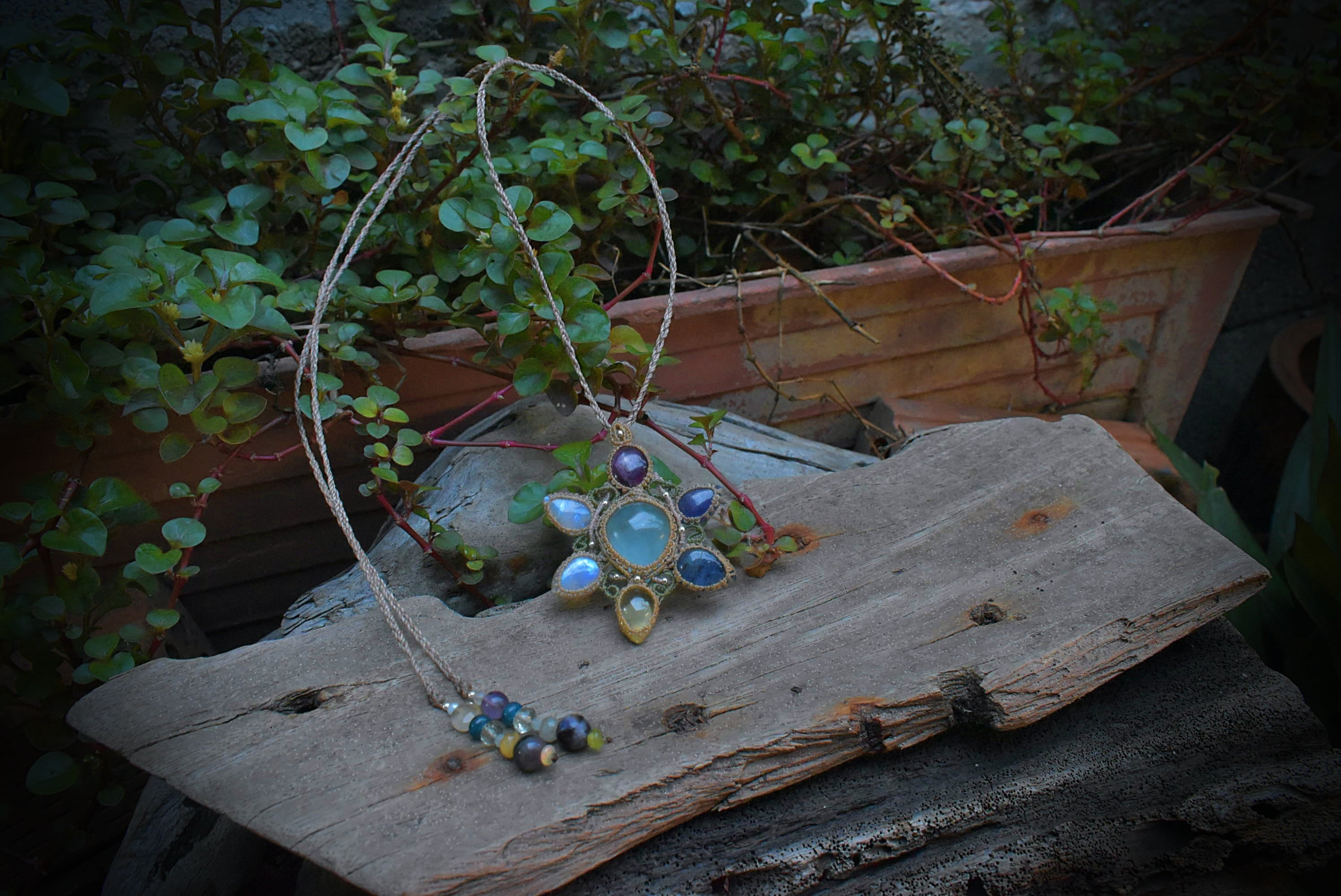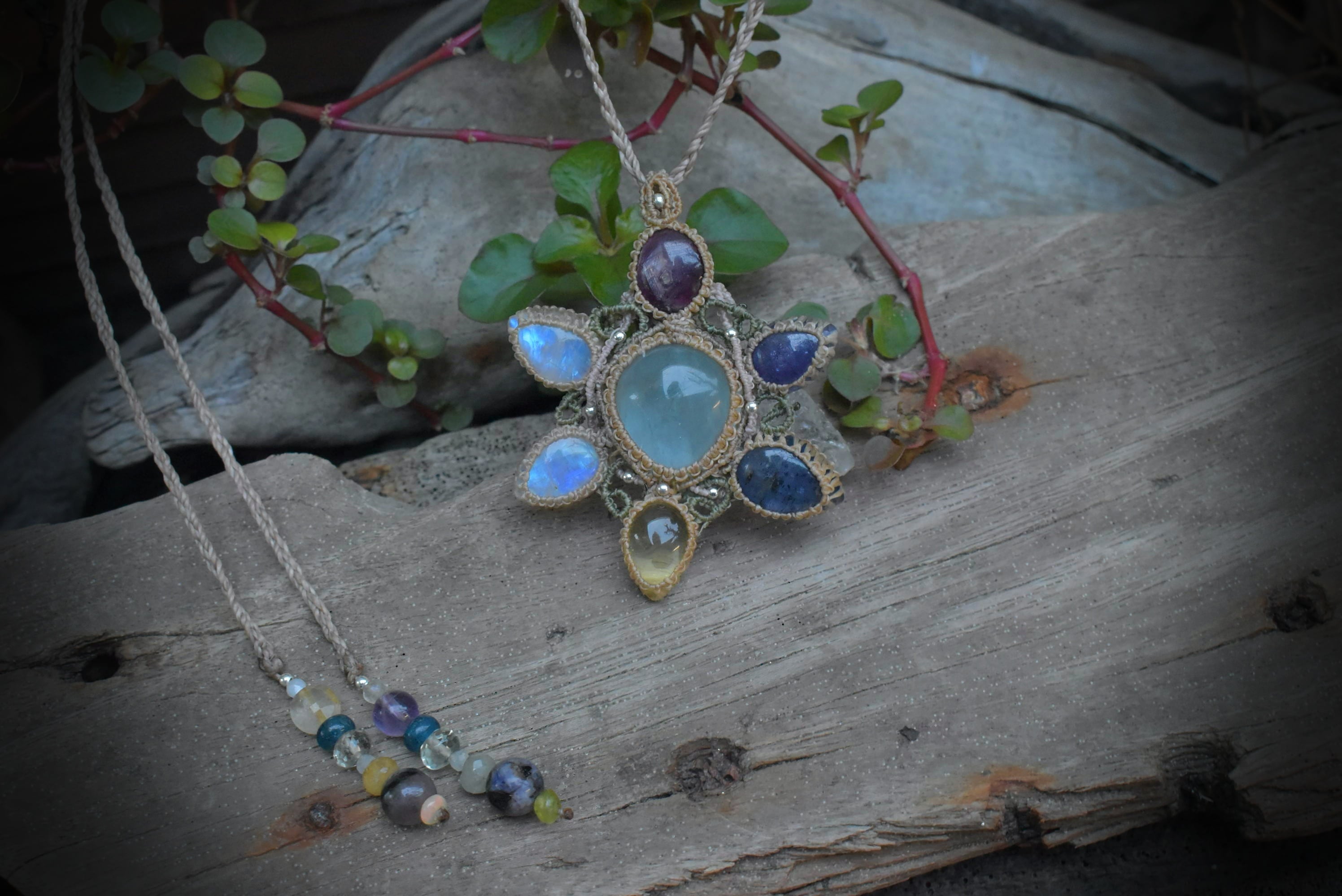 石の周りにはスタールビー、タンザナイト、アイオライト、レモンクォーツ、レインボームーンストーンを使用して贅沢で可愛いファンタジックなペンダントに仕上げました。