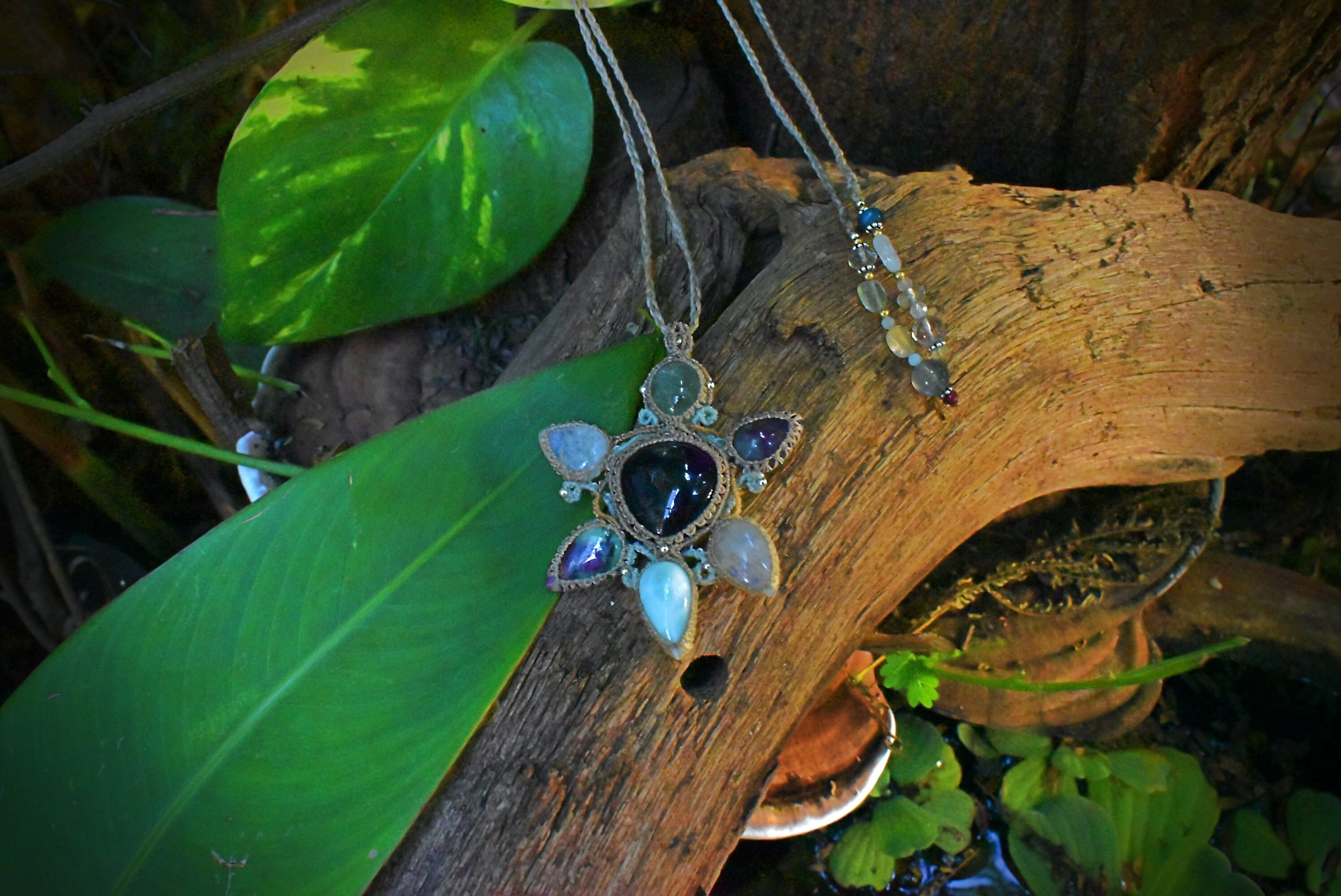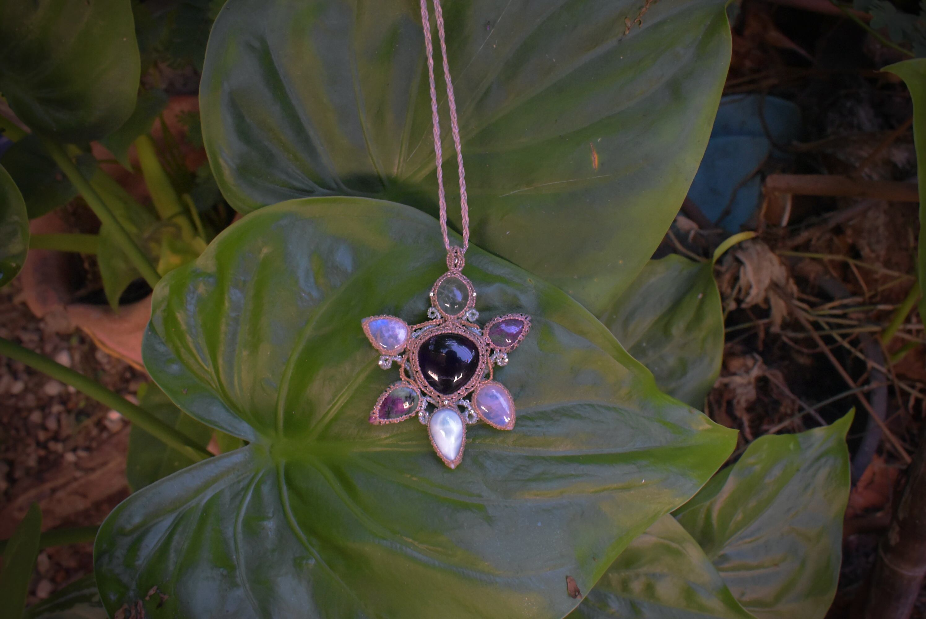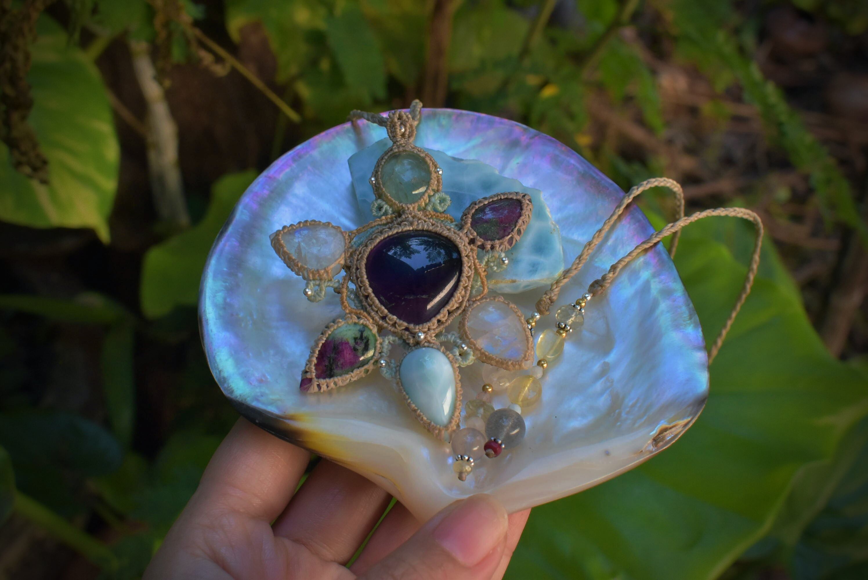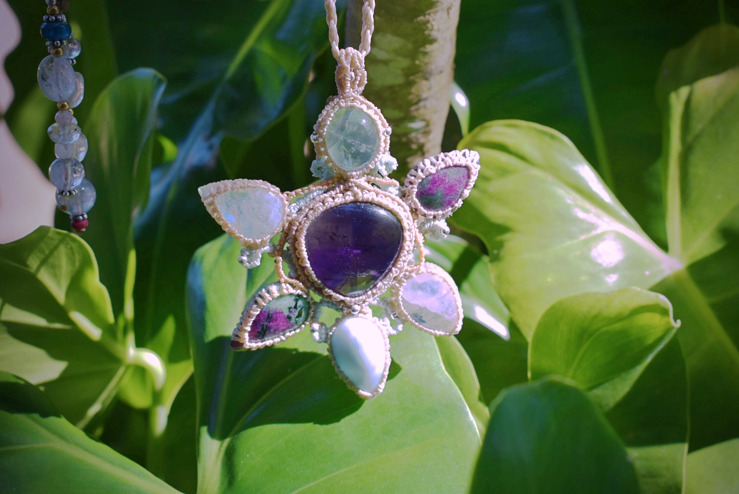 美しくパープル模様が透き通るアメジストを中心に透明感あるアクアマリン、レインボームーンストーン、ラリマー、毒々しい色合いでもあるルビーインゾイサイトのコントラストを付けながら、サイケデリックなお花が仕上がりました。