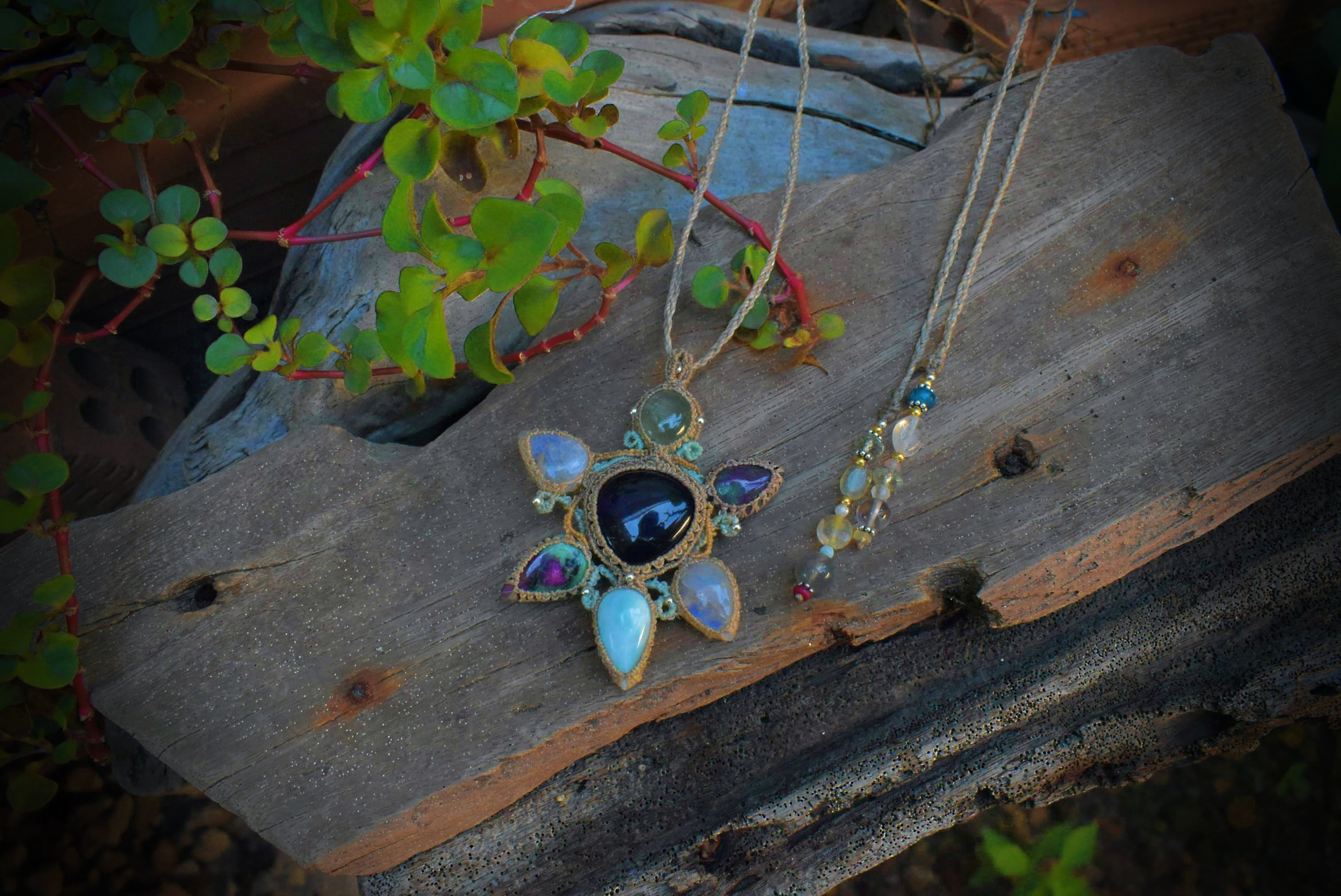 ◆このたびはミント、キナリ、ヘンプ色の蝋引き糸を使用しマクラメ編み装飾を施しました。