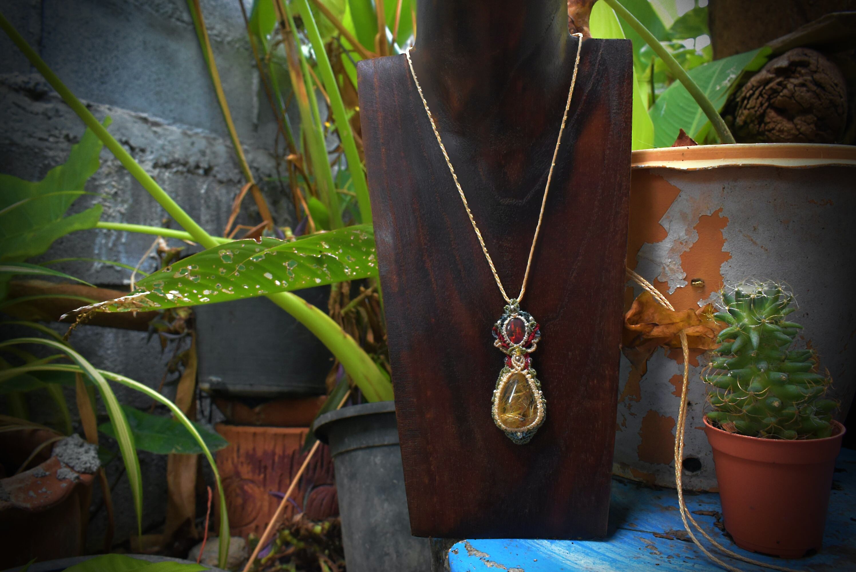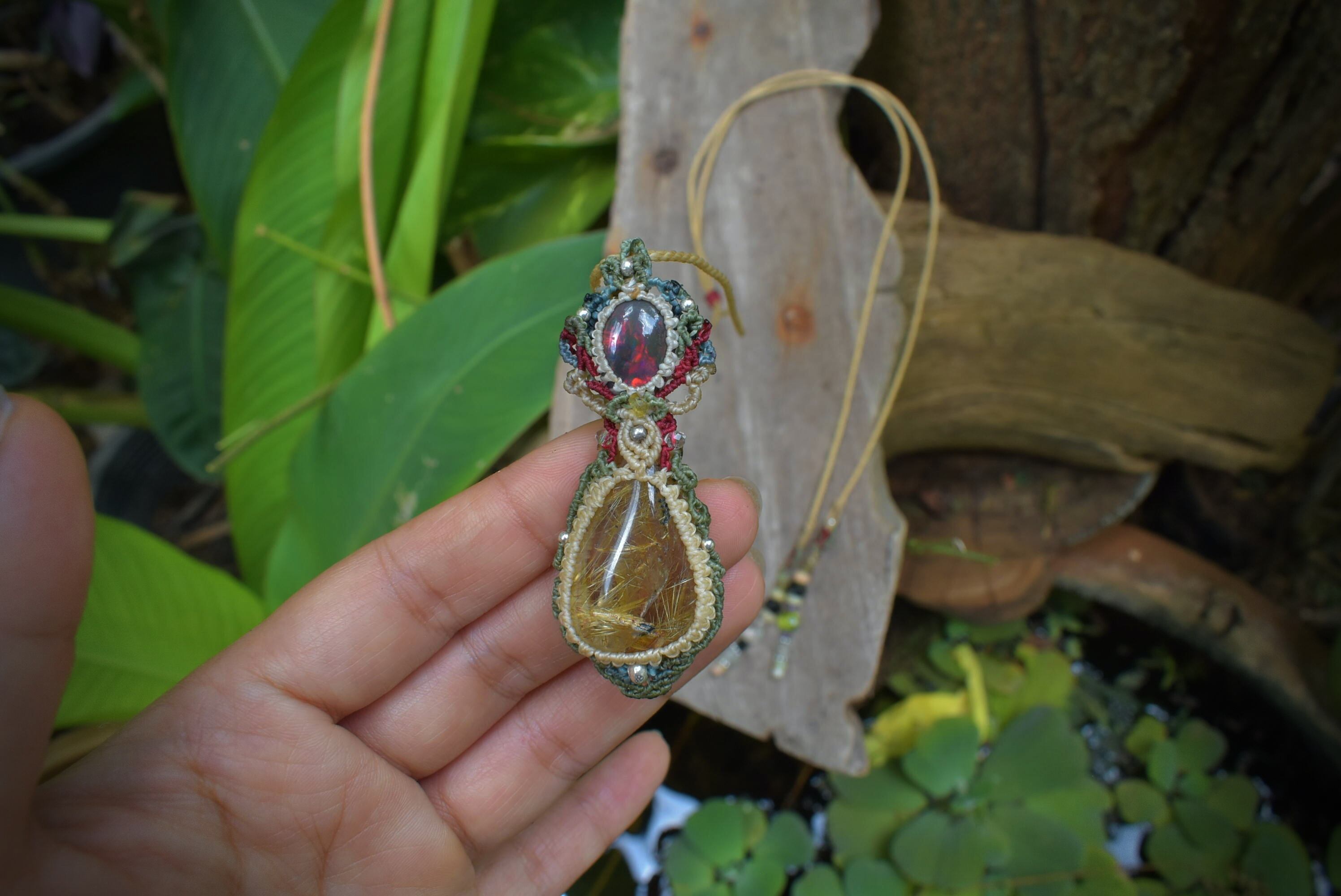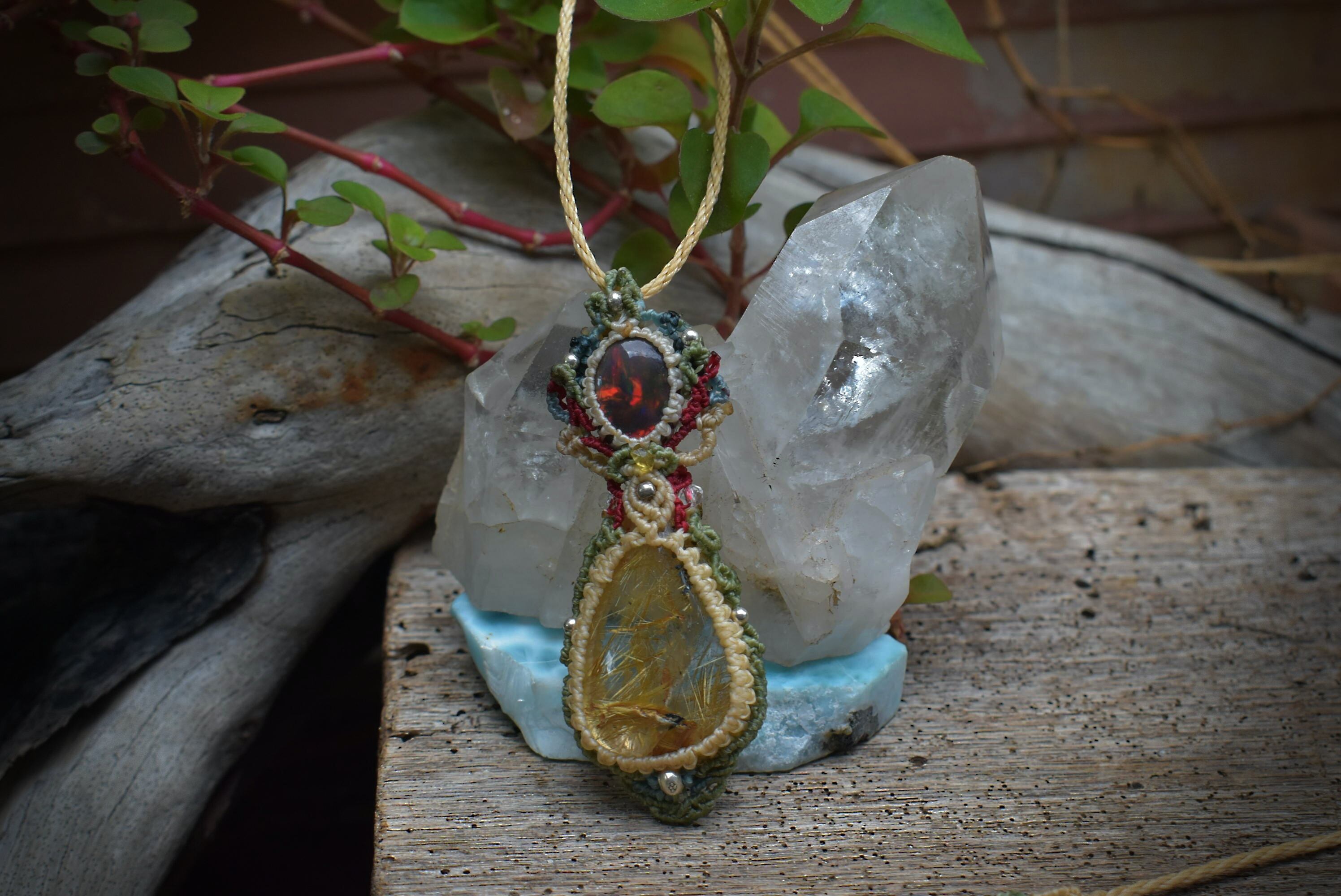 エチオピア産ファイアオパールとゴールドルチルクォーツ マクラメペンダントopal001