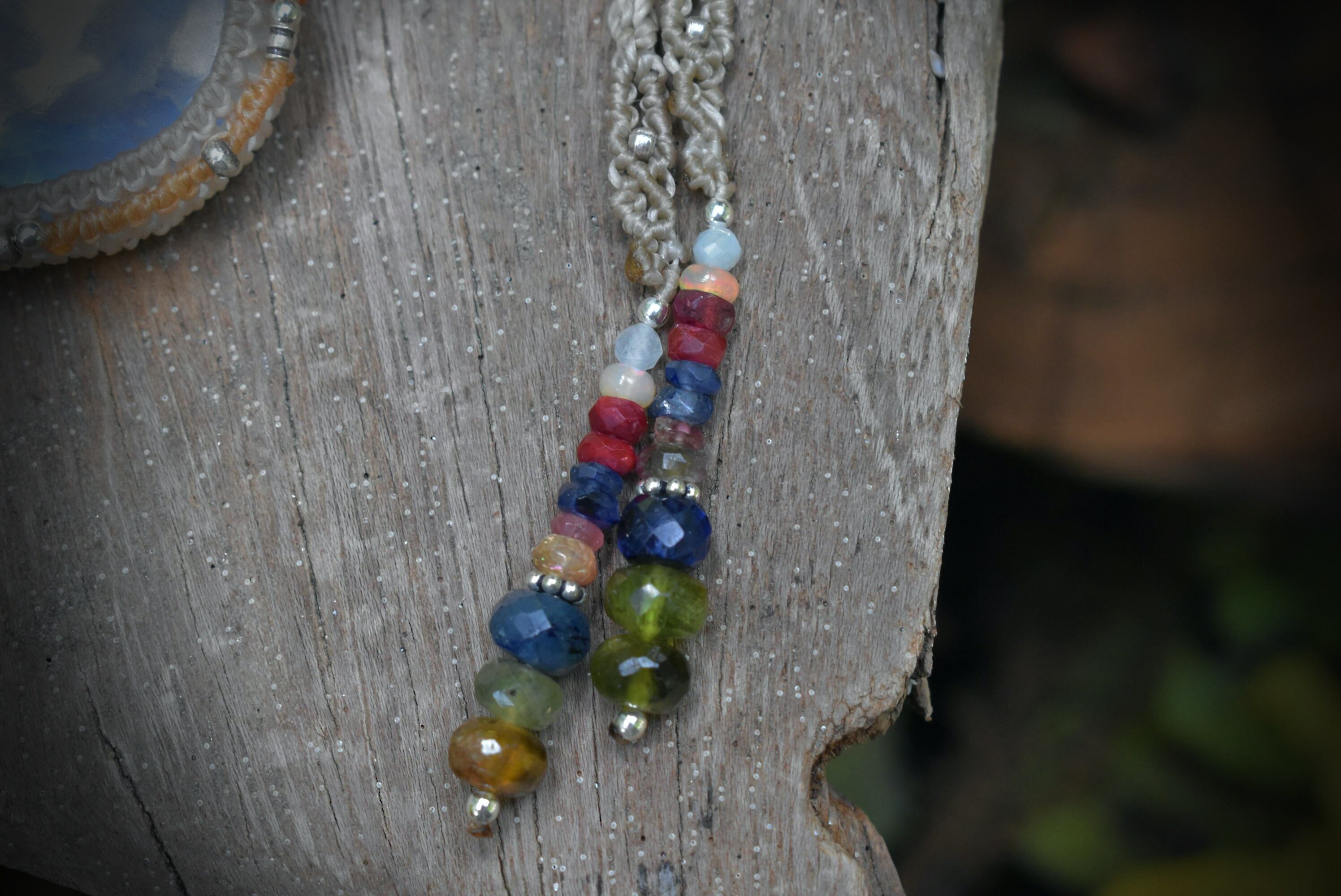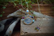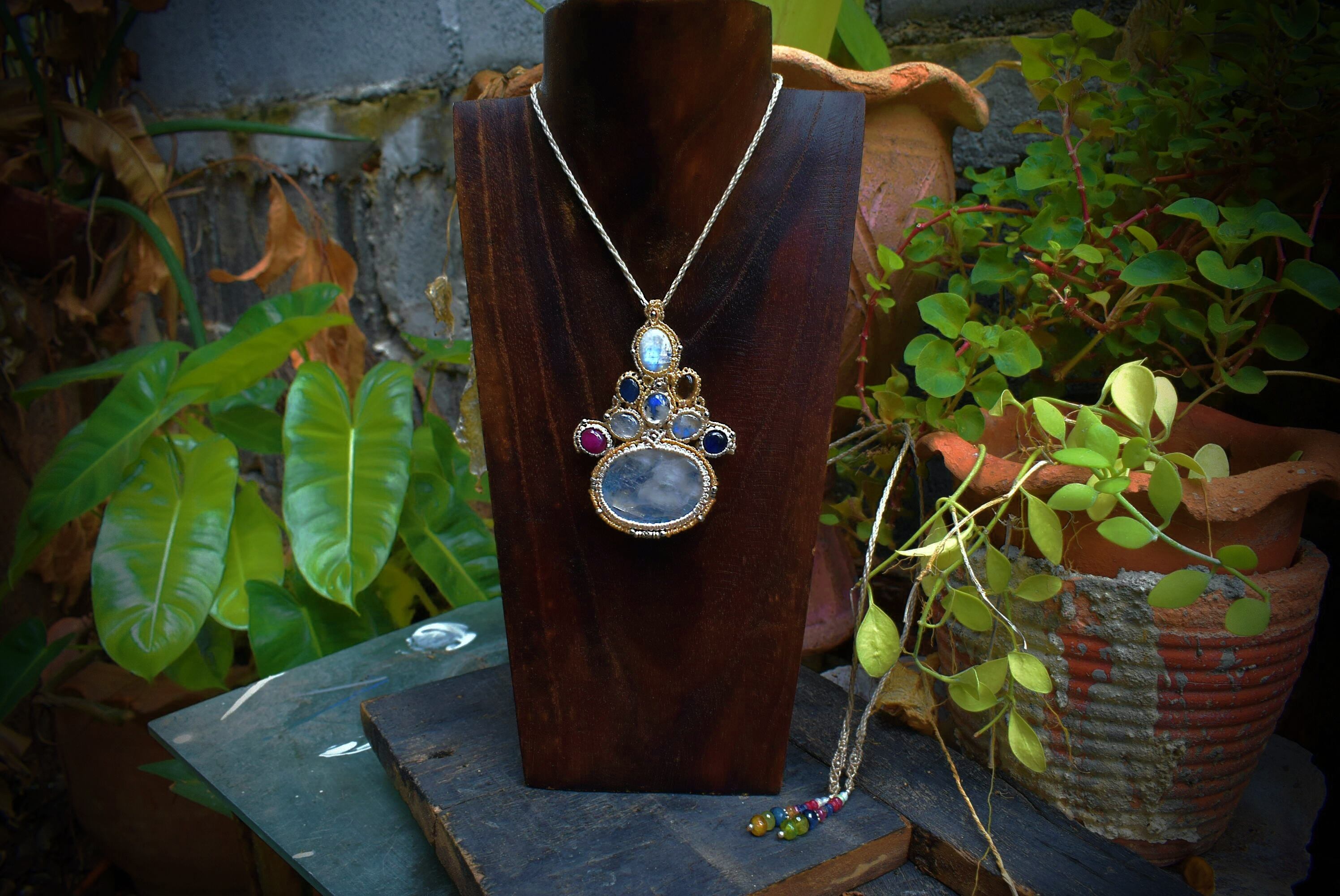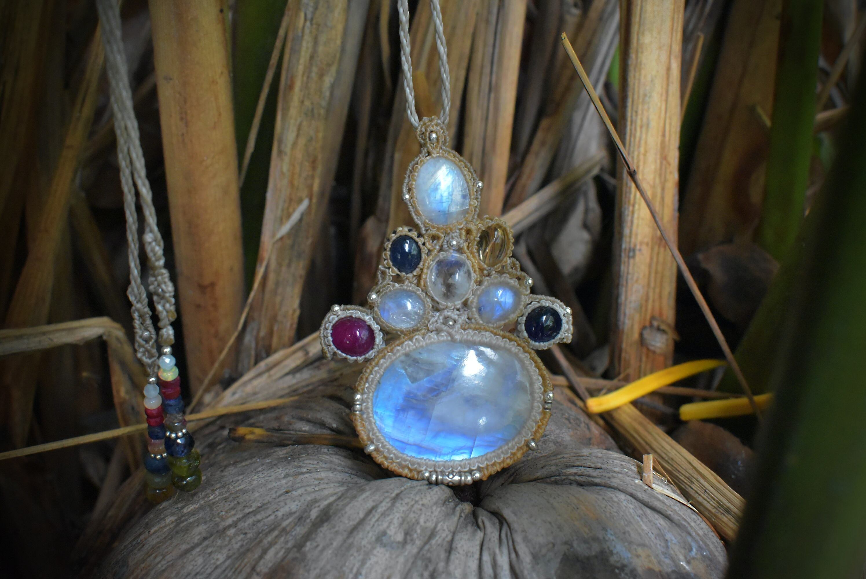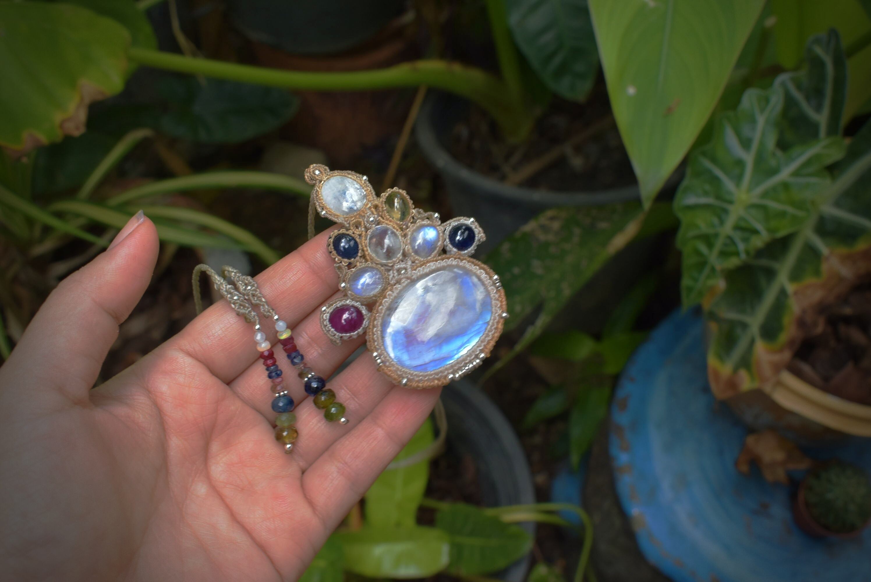 ロイヤルブルーに輝くムーンストーンを土台にして、小さな実が彩りよく、そして美味しそうに育ち上がった様子をマクラメ編み装飾にて表現したペンダント。