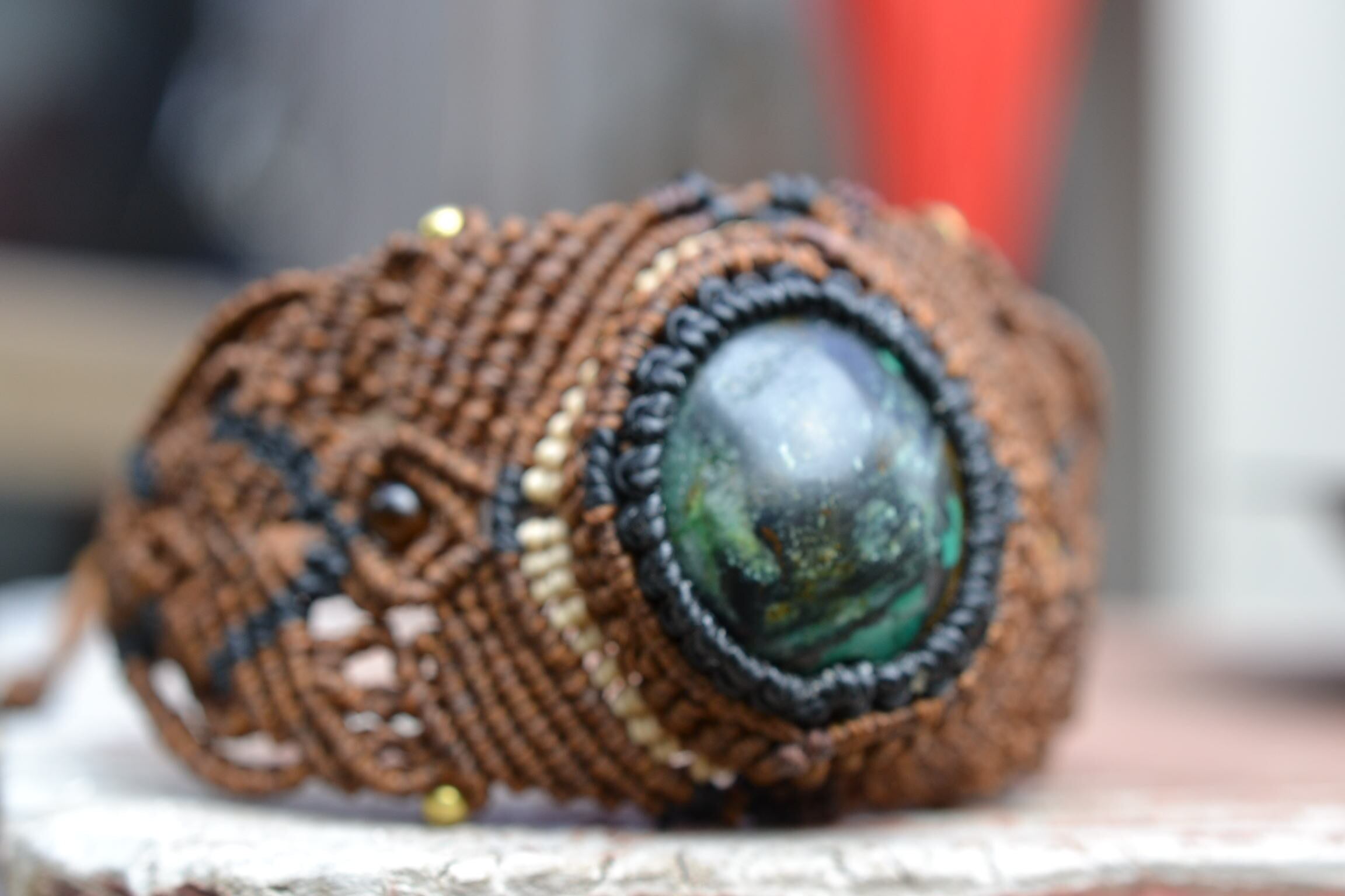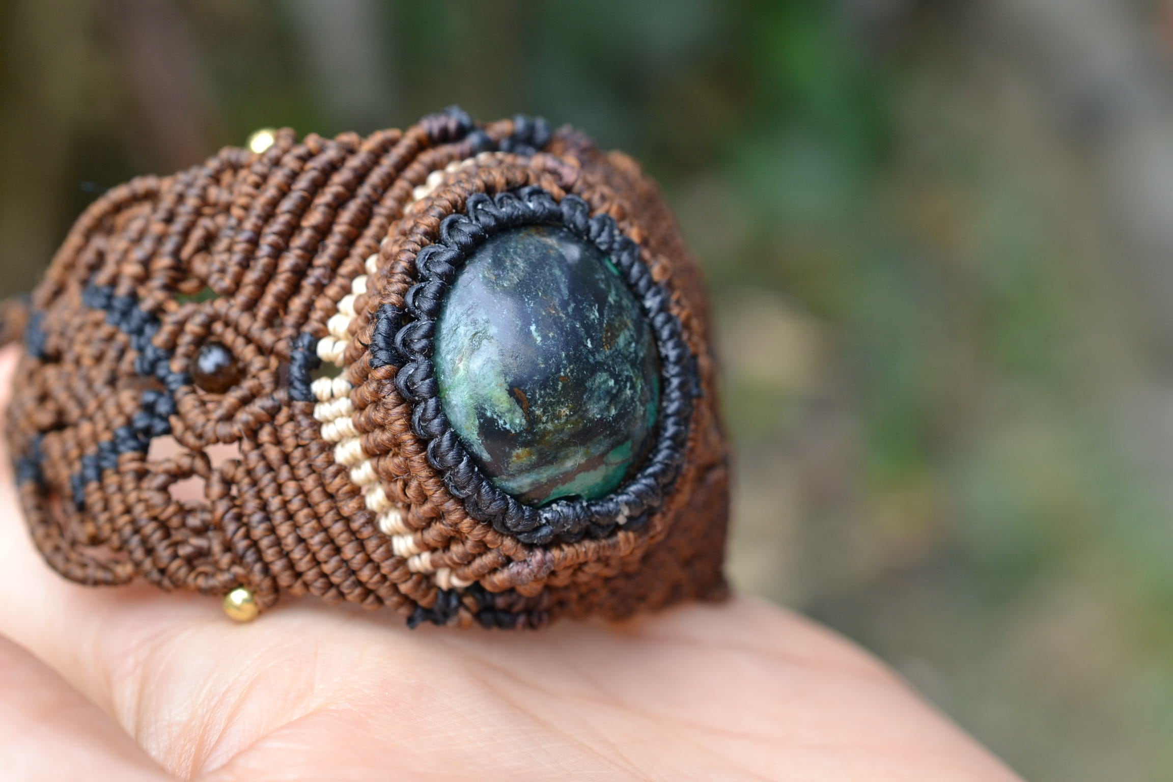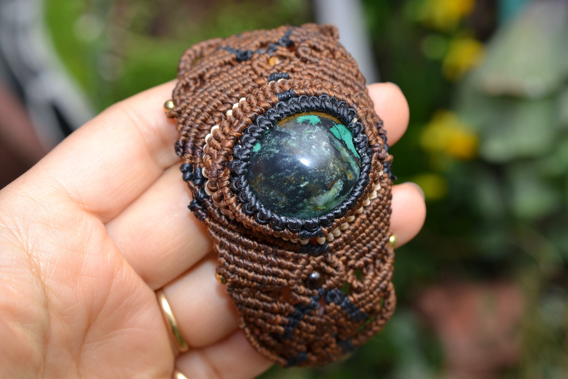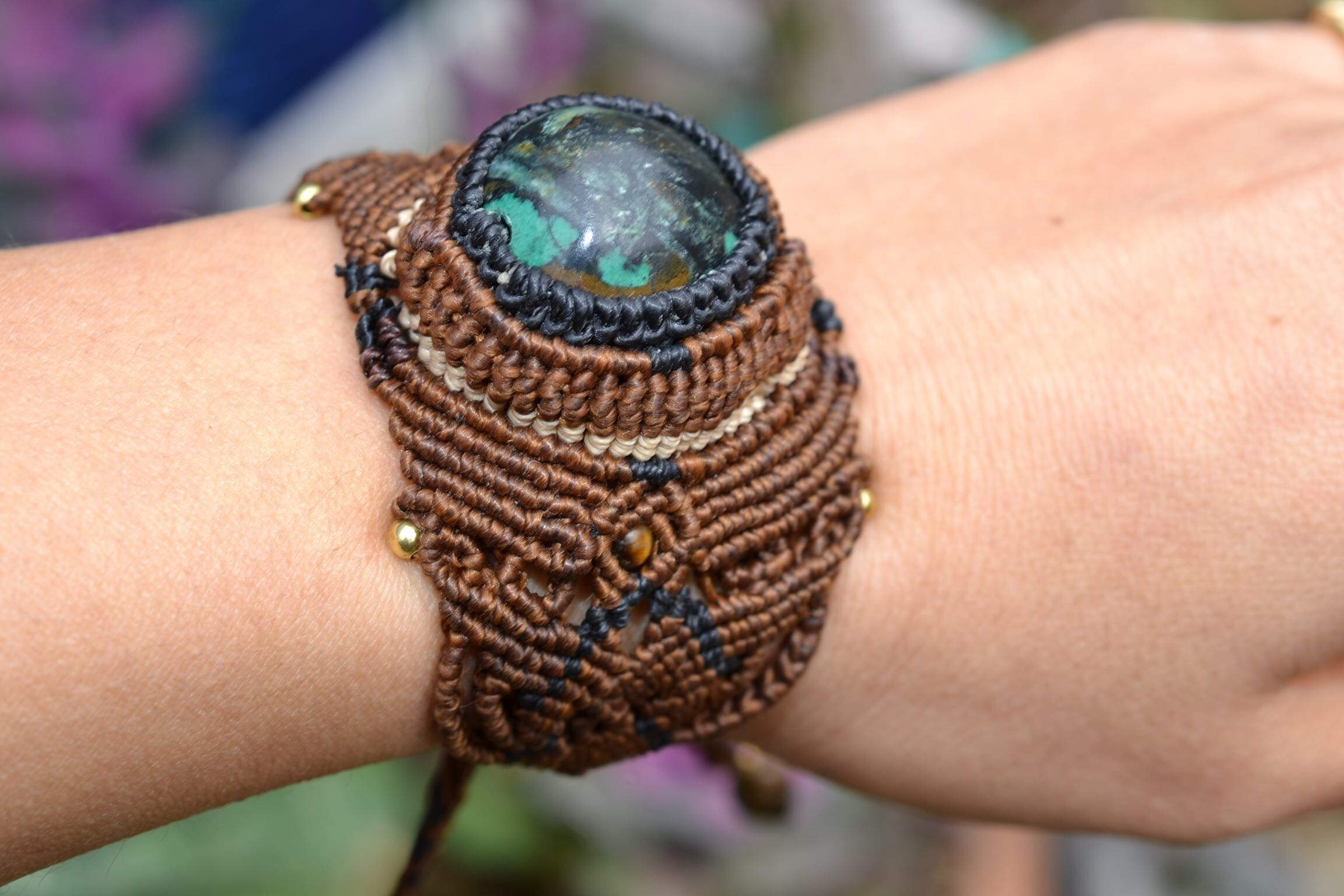 力強い印象のターコイズを包み込んでマクラメ編み装飾し、ブレスレットを制作しました。