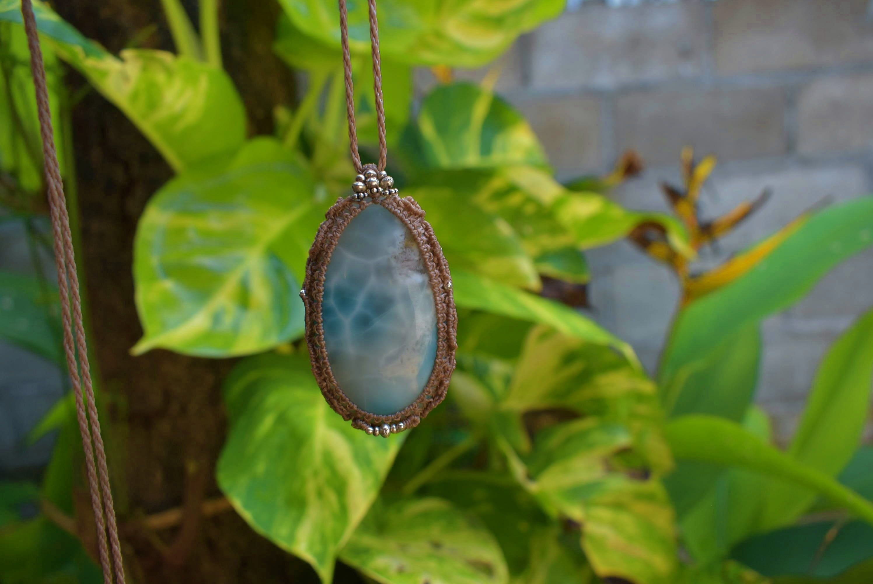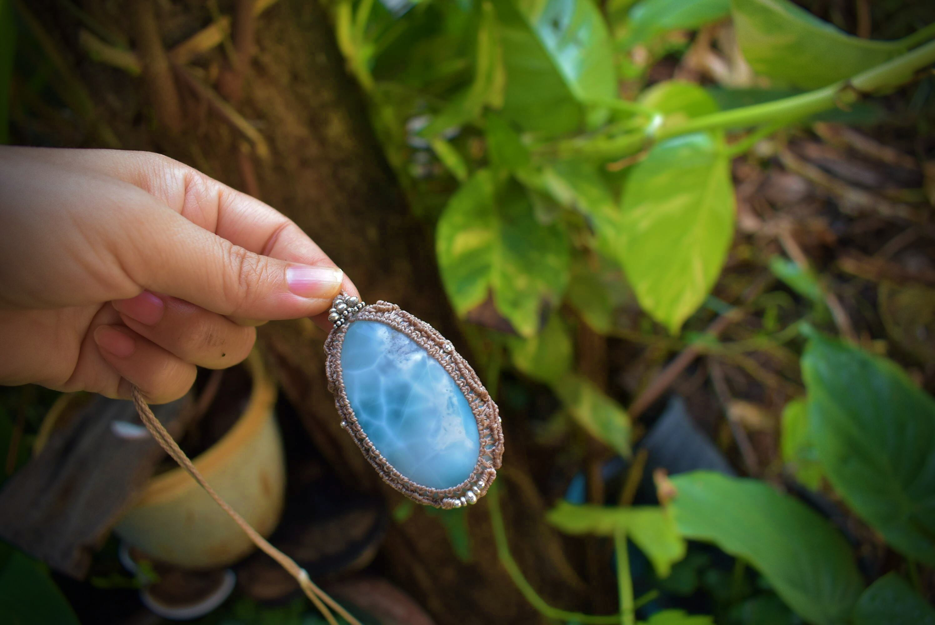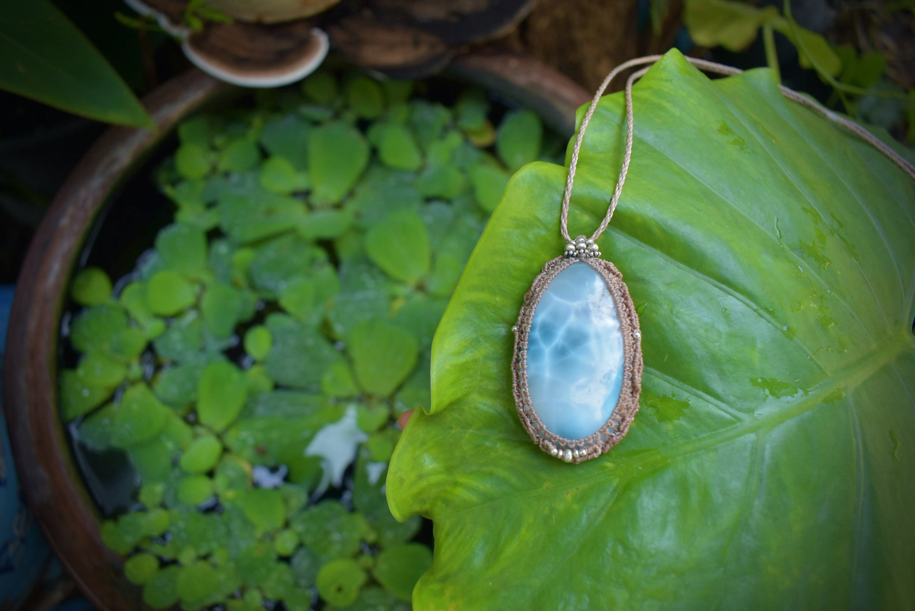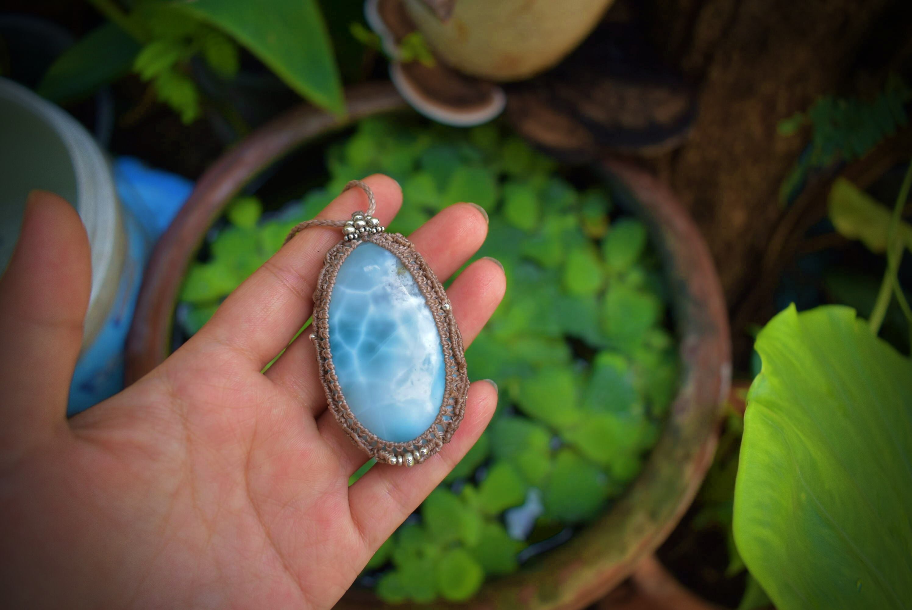 高品質な透け感★大粒ラリマー 編み込みマクラメペンダントlarim003