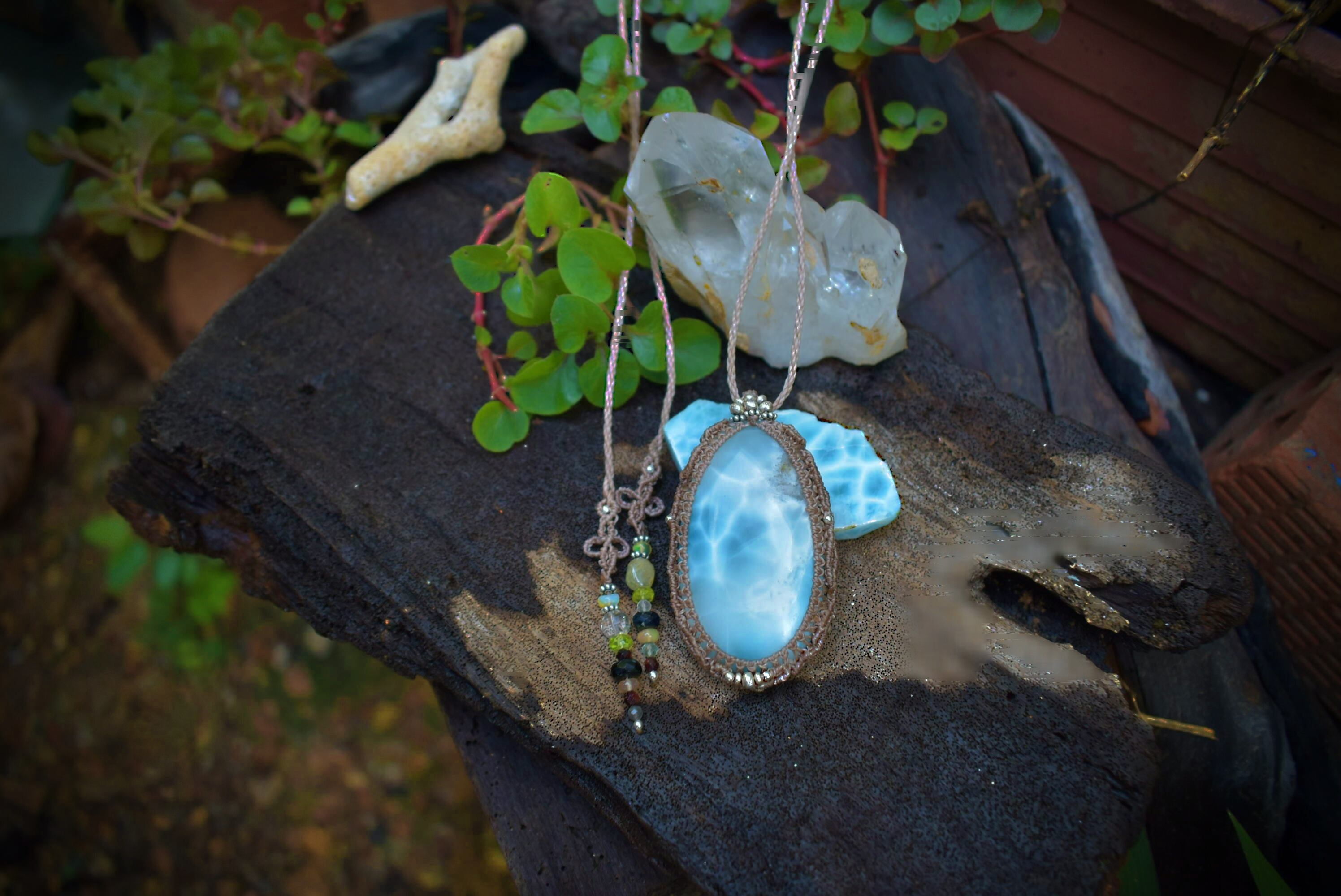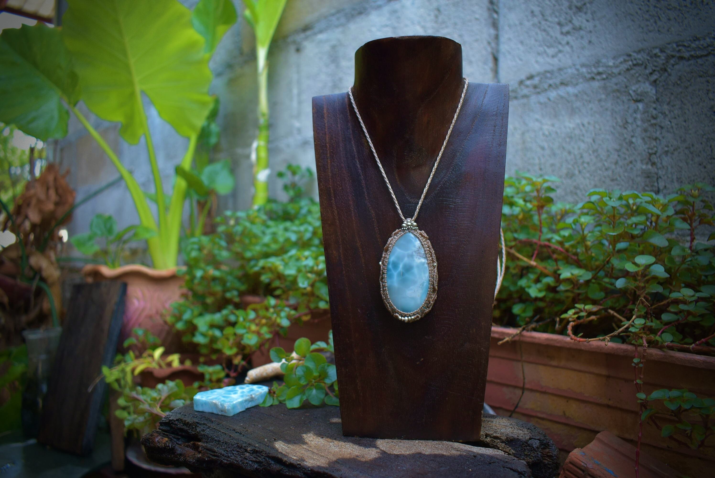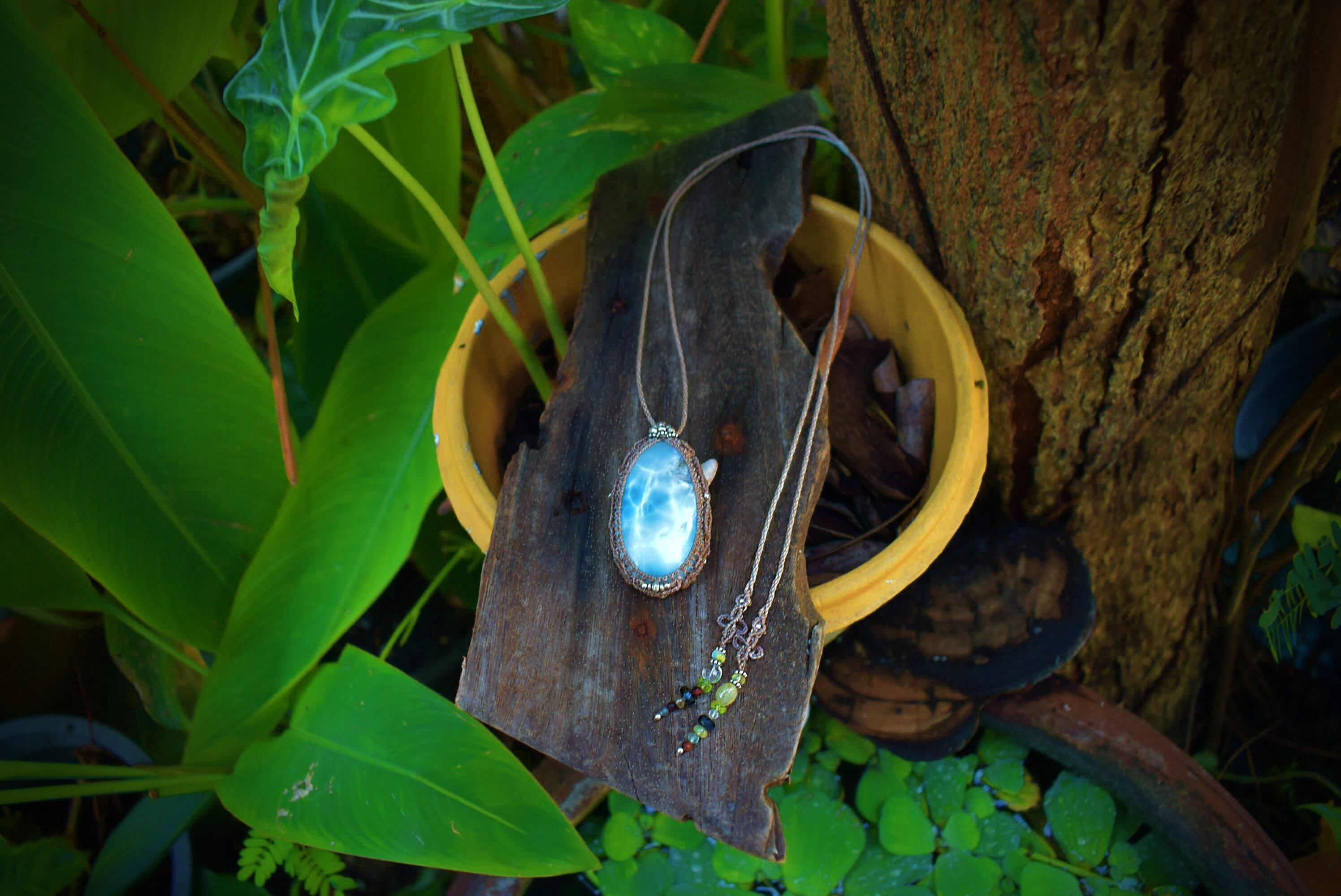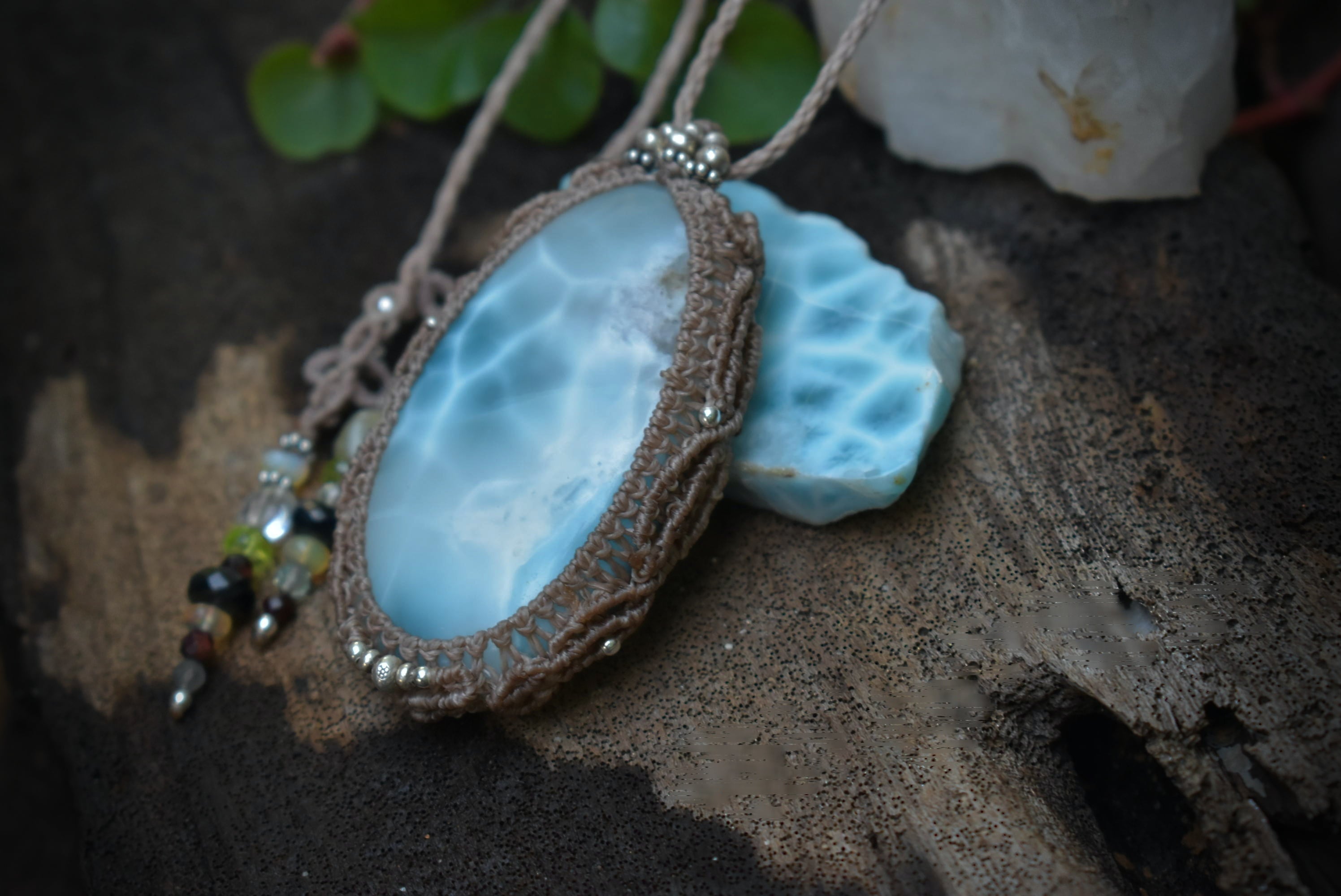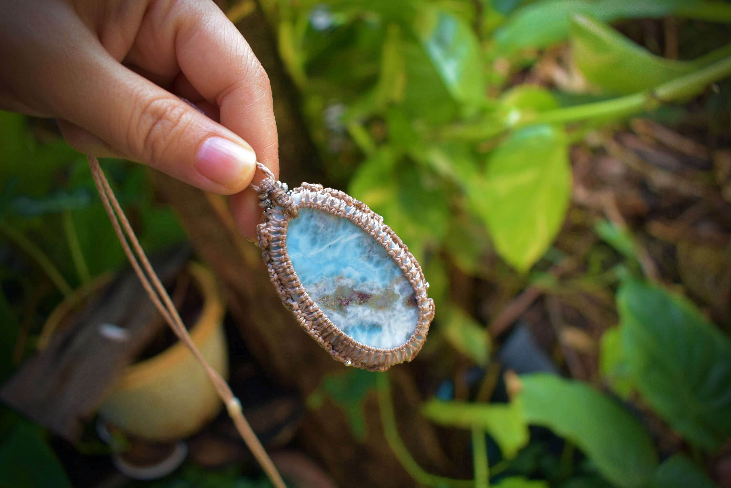 高品質な透け感★大粒ラリマー 編み込みマクラメペンダントlarim003