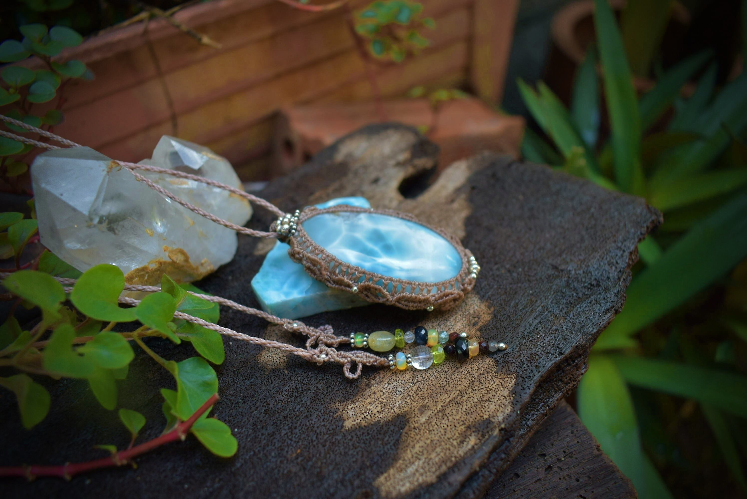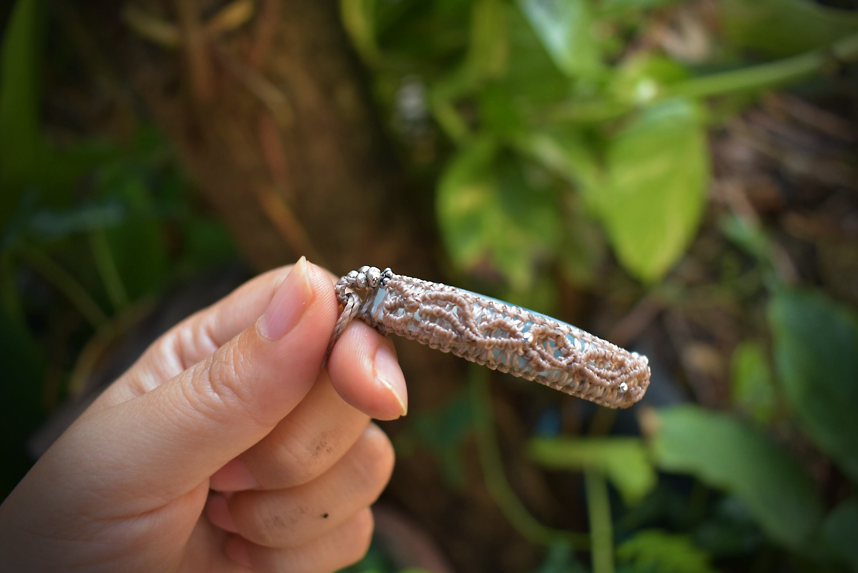 そういうものを意識して石の周りの巻き結び部分をとり囲うようにしてマクラメ編み装飾を施しました。