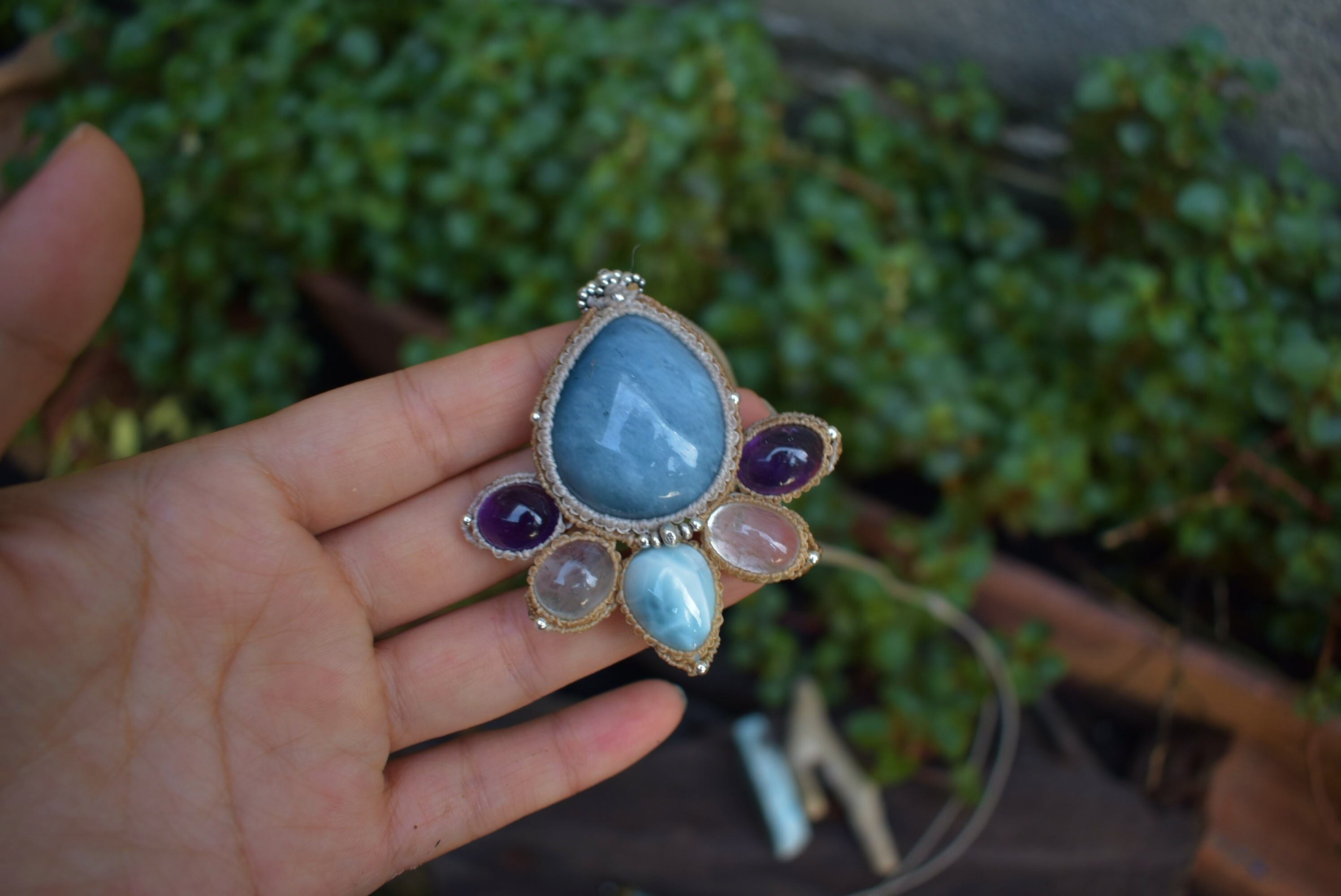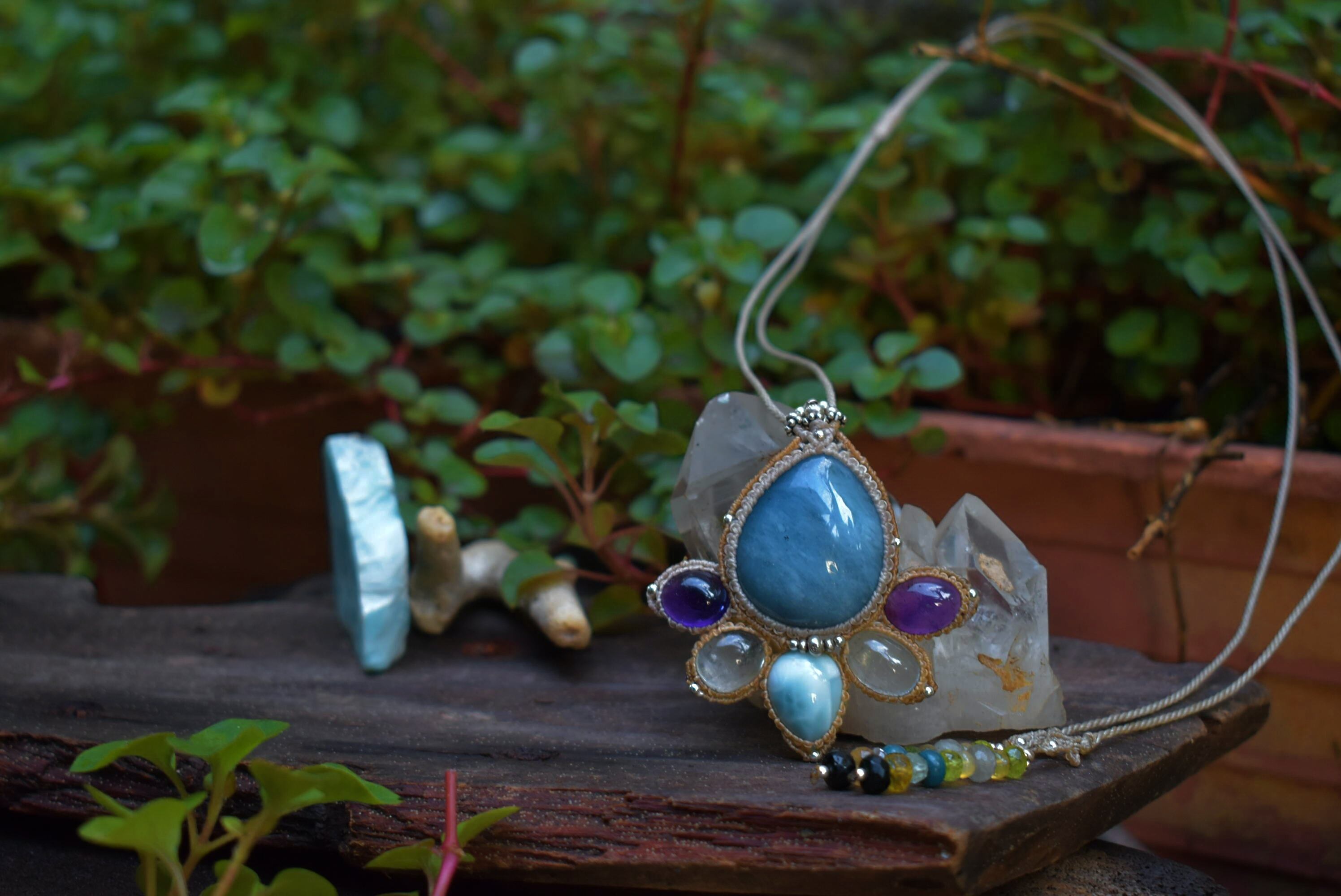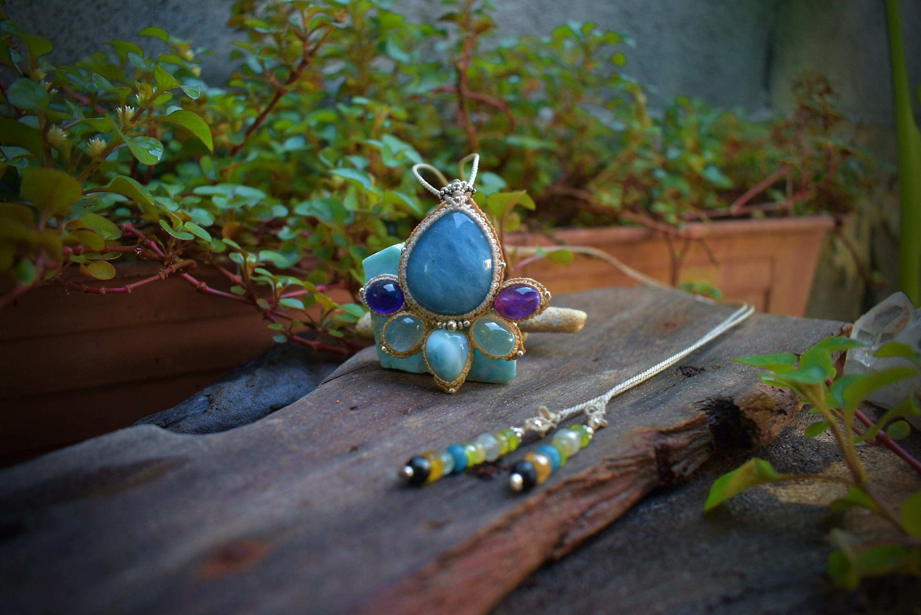 ぷっくり★ディープカラーアクアマリンと天然石 マクラメペンダントaqua002