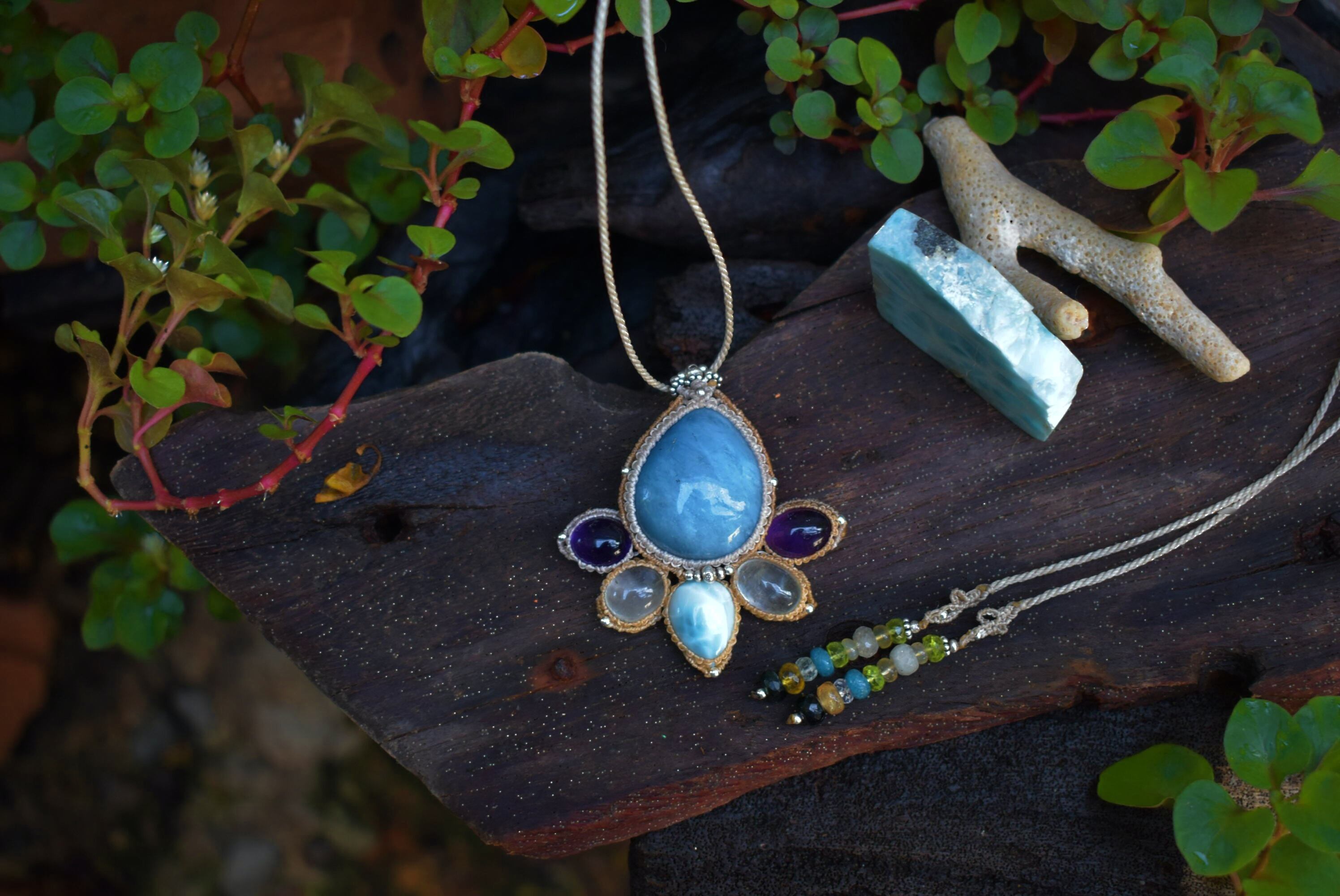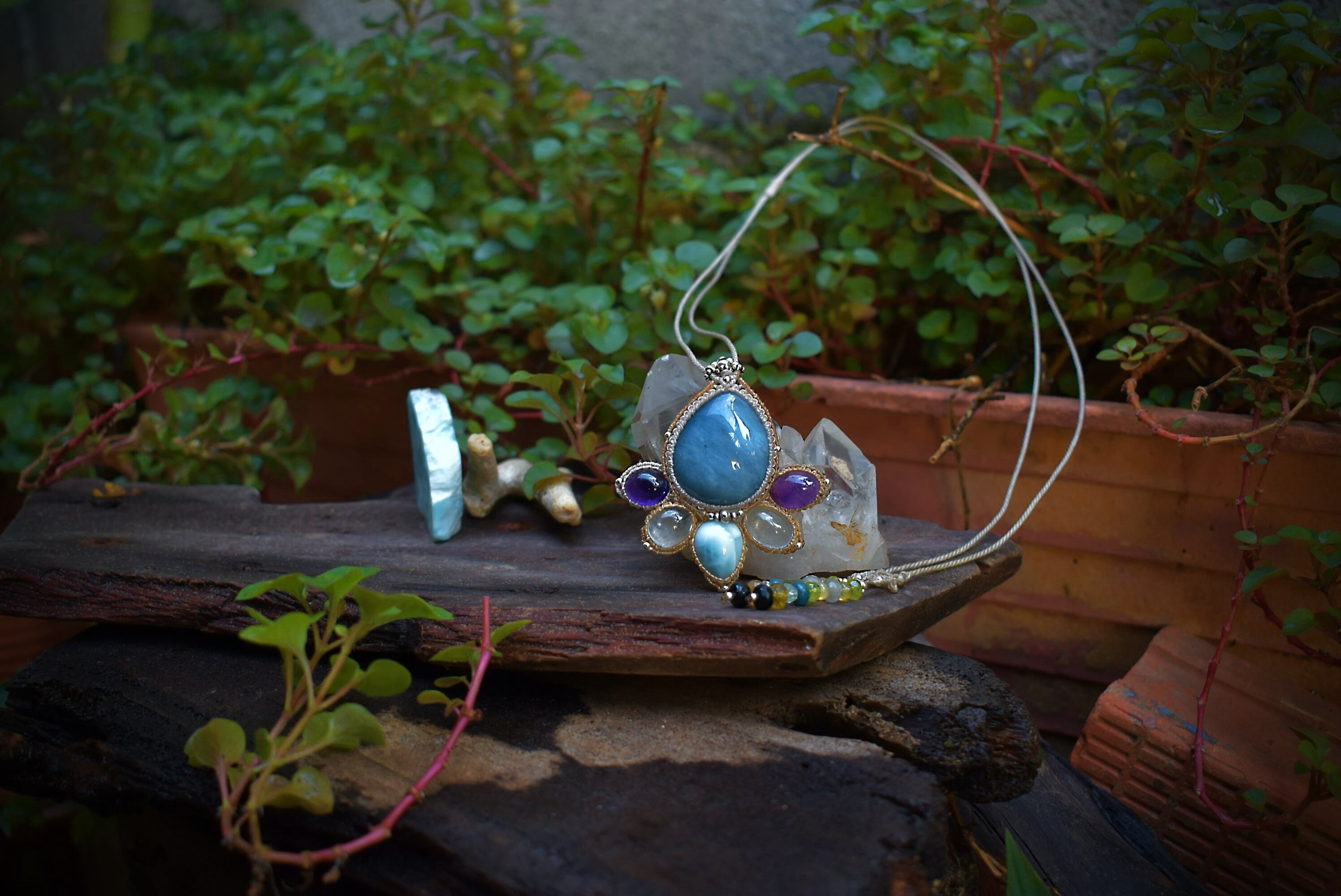 高品質なアクアマリンをベースに厚みある小粒の天然石たちをしっかりと結んで仕上げたペンダントを制作しました。このペンダントのアイデアはは”根を張る”ということを根底から考えて形にしたもの。ぷっくりとした高品質アクアマリンに寄り添うように品質良い色鮮やかな天然石を結び、つなぎ合わせました。