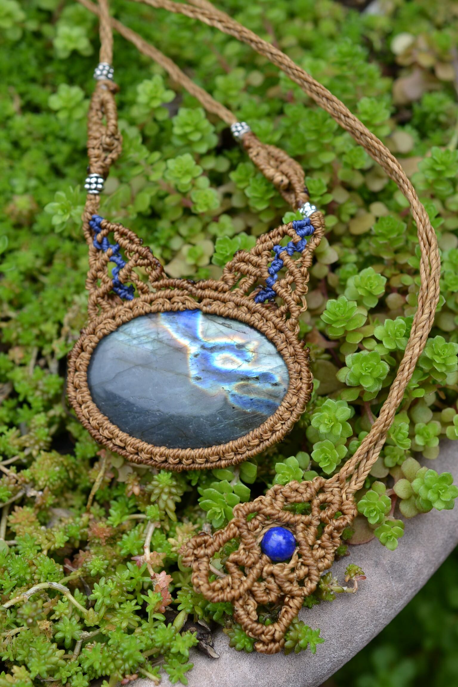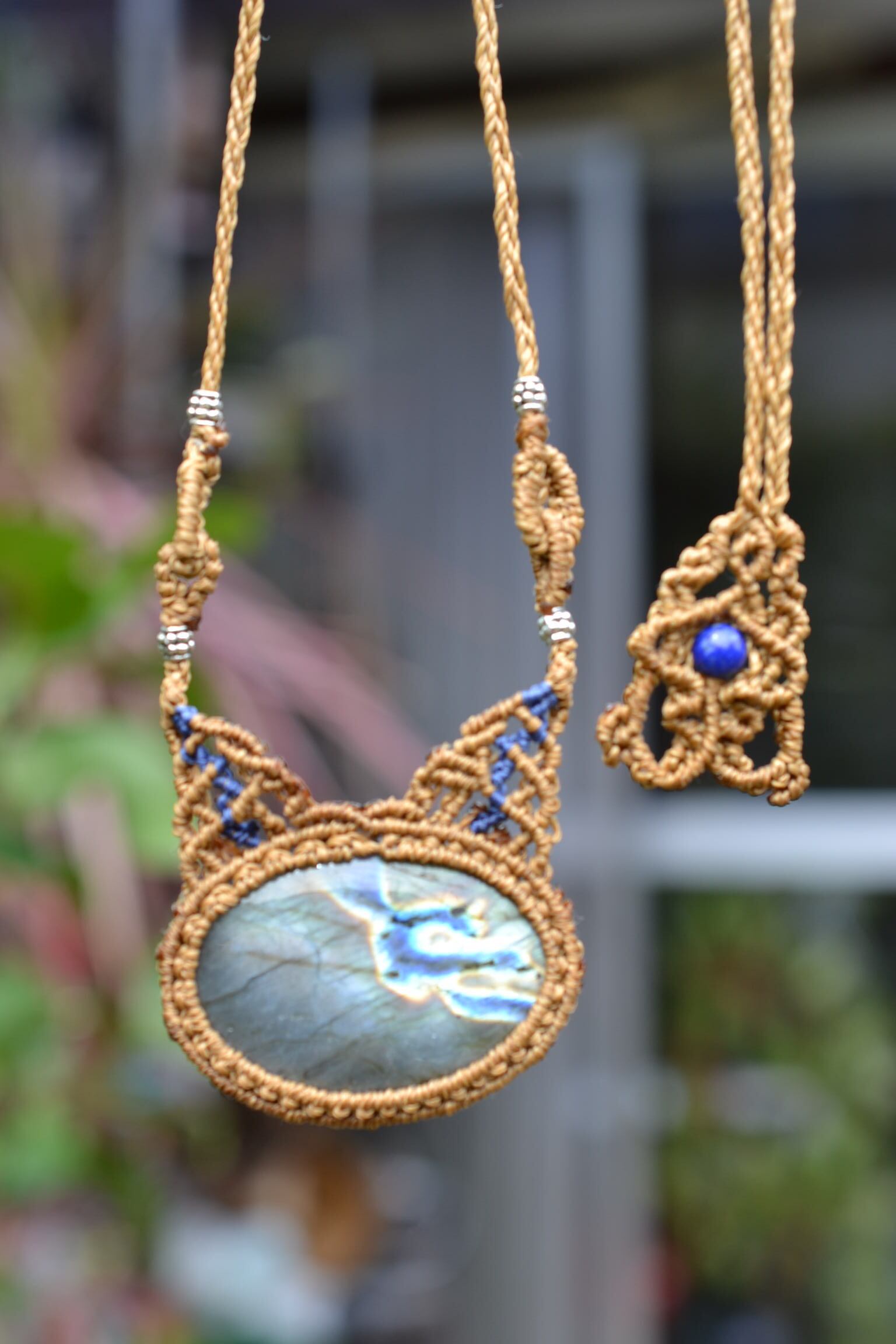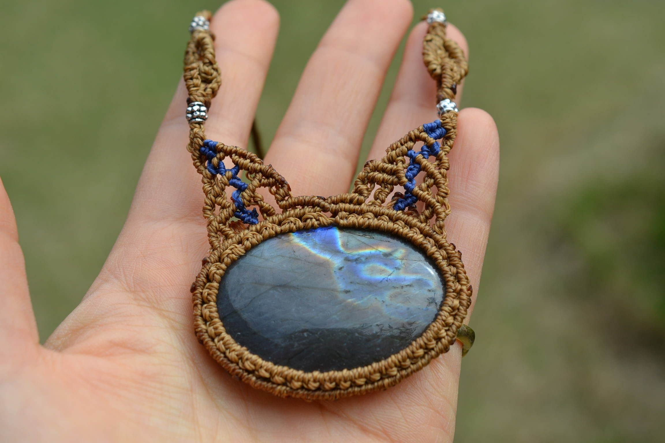 シルバーカラーとも見てとれるラブラドライトの中に大地の地形をイメージさせる大河のようなブルーの模様が素晴らしい個性的なラブラドライトを石のイメージに合わせてマクラメ編み装飾を施し、ネックレスに仕上げました。