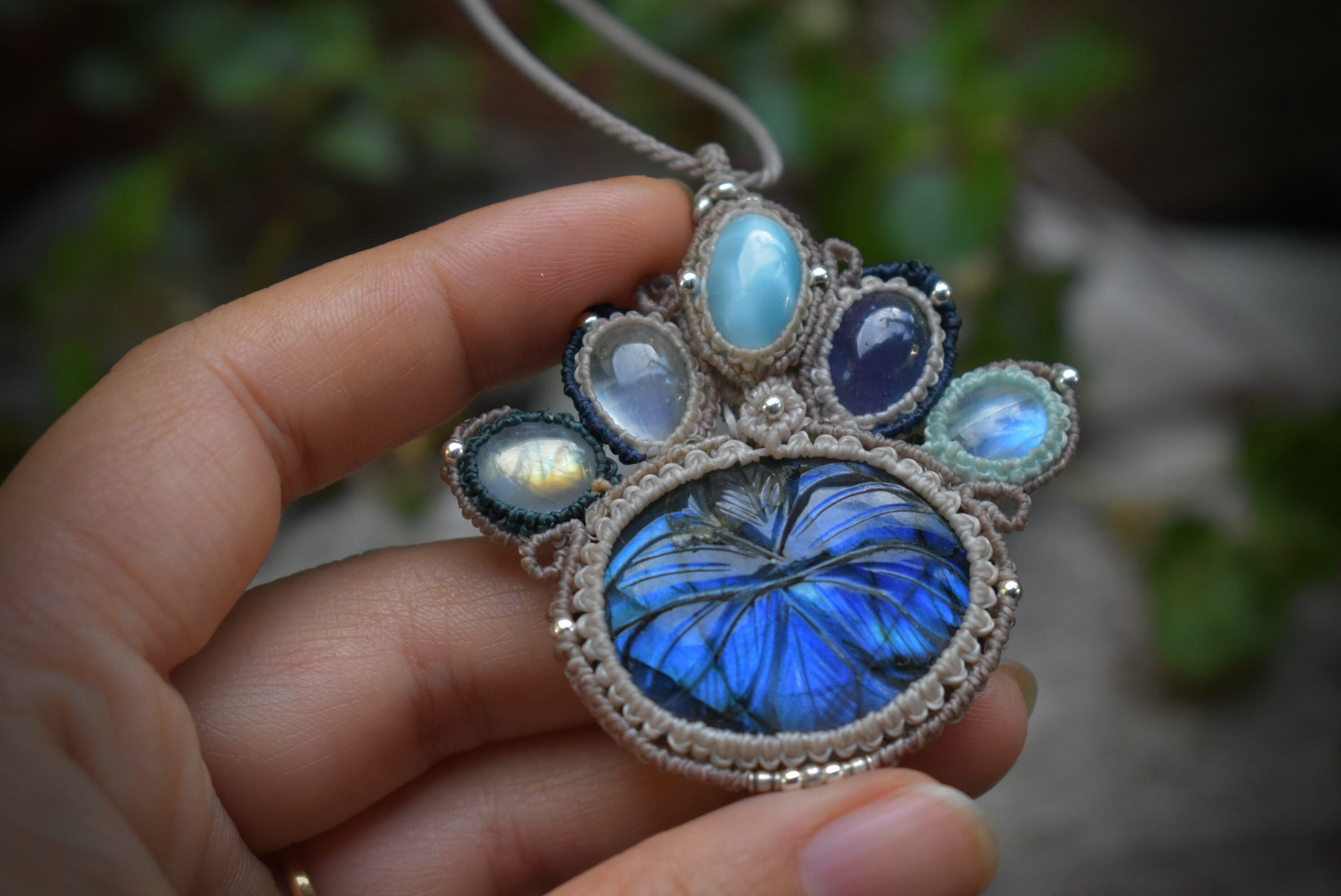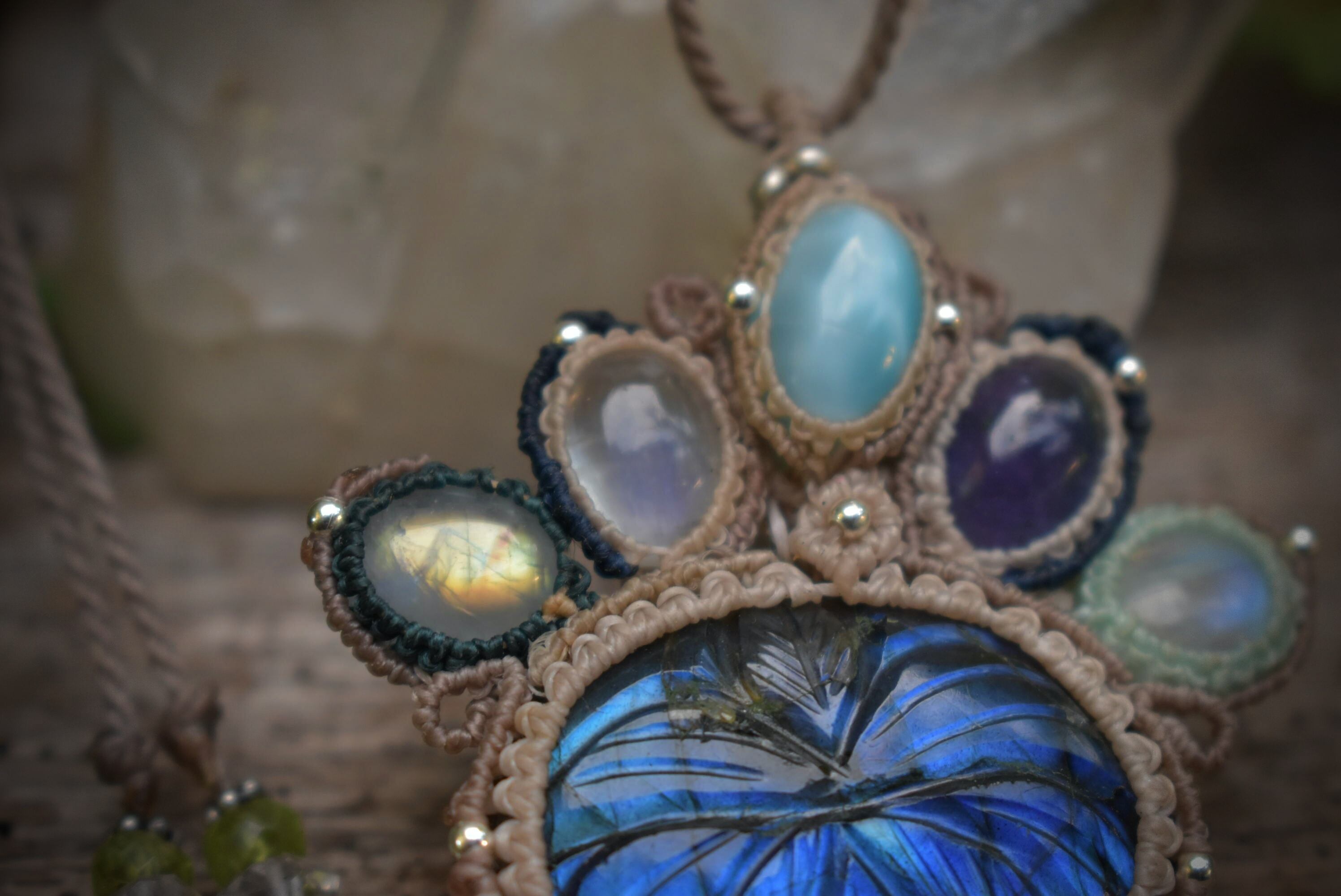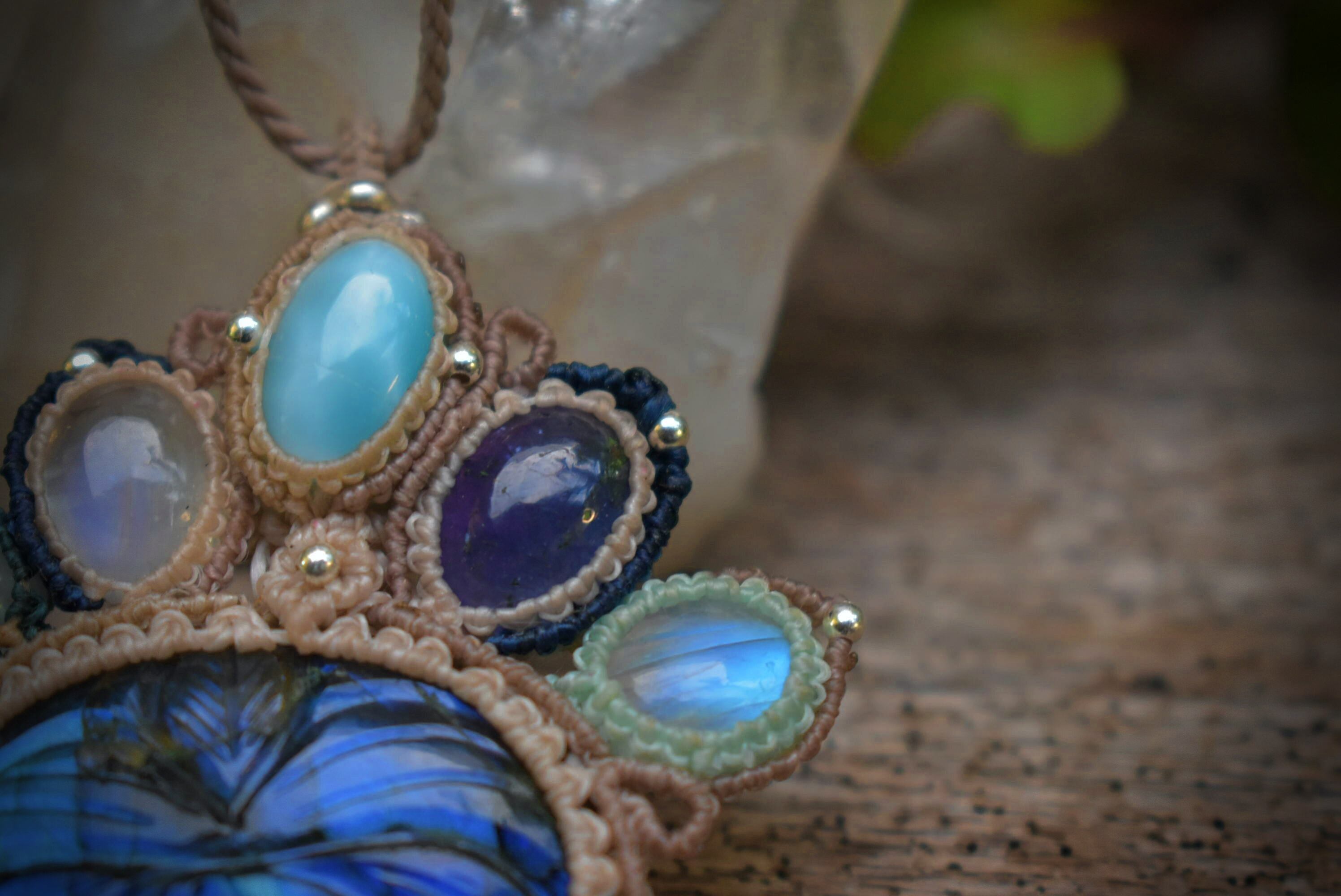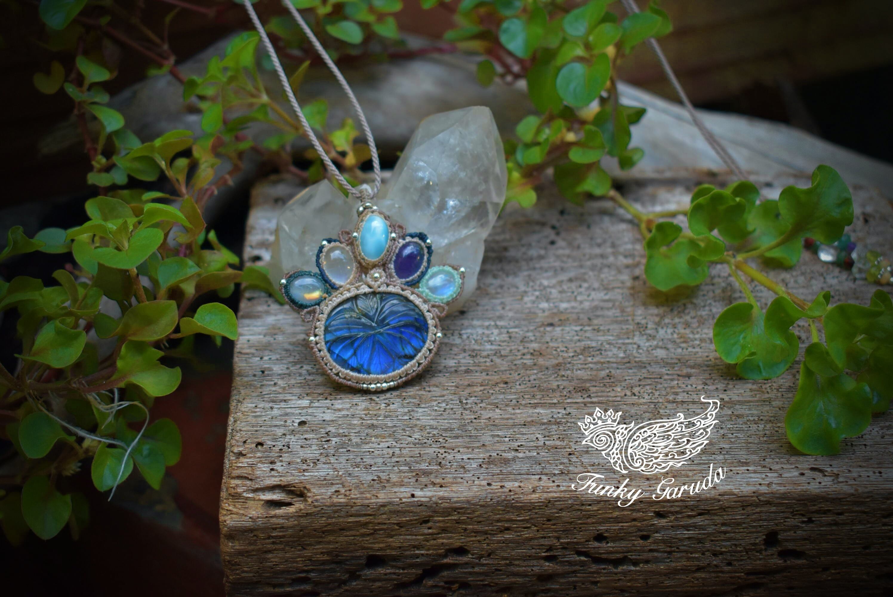 ギラギラと美しく輝くブルーカラーの中に花びらのカービングが施されたブルーラブラドライト。ギッシリとリッチに実をつけるように組み合わせた色とりどりのジェムストーンたち。