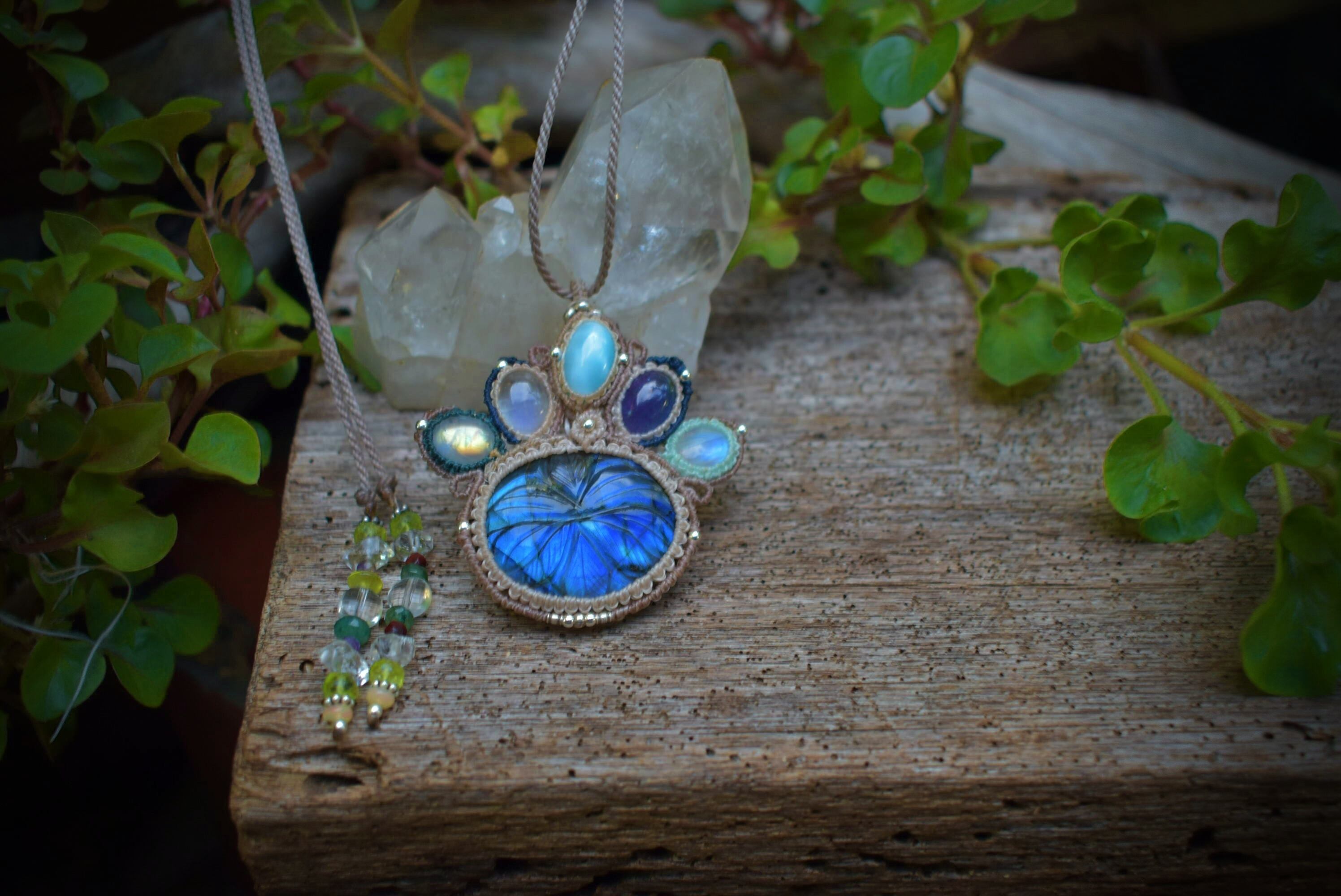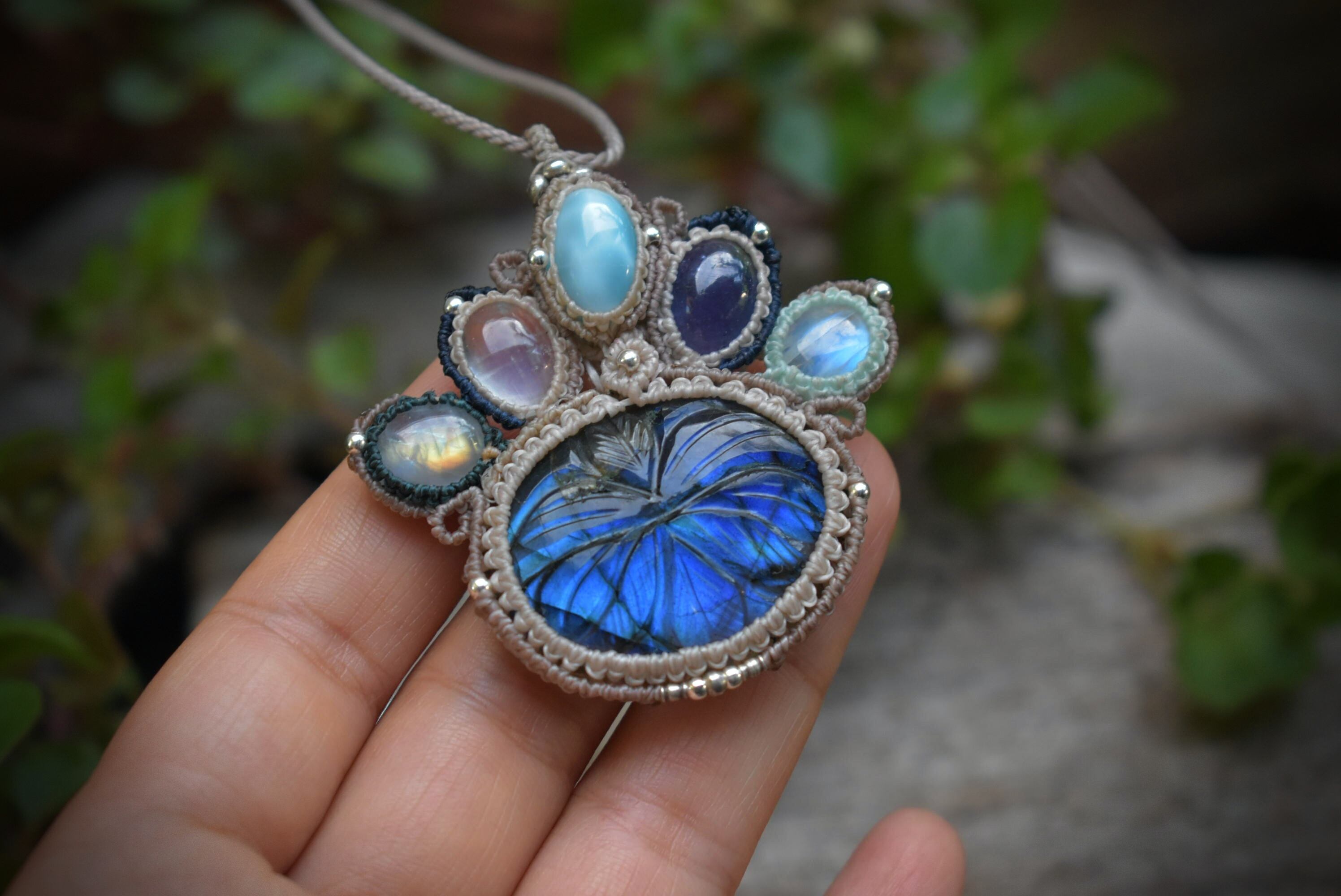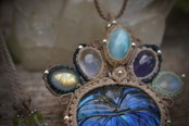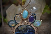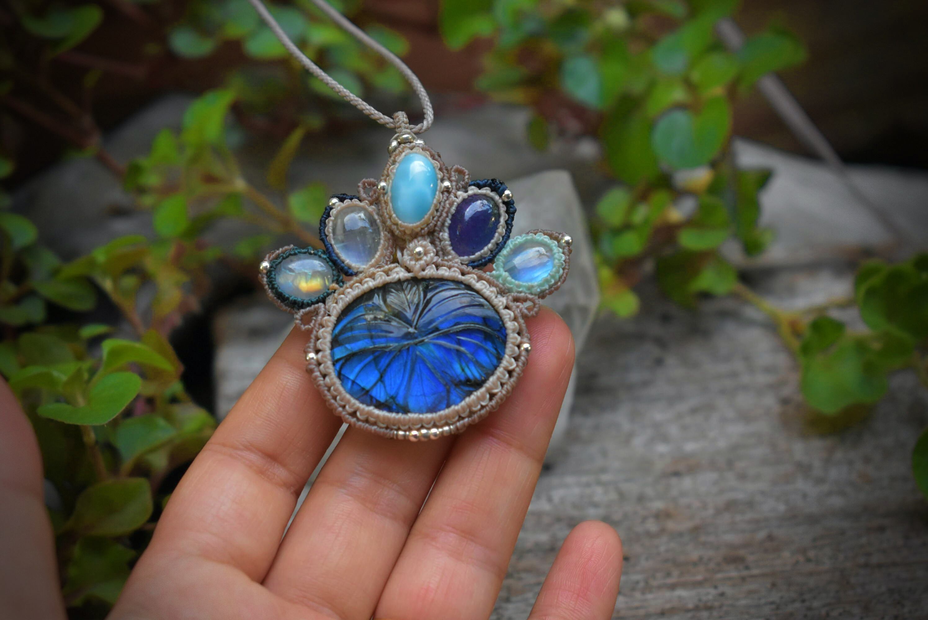 ギラギラと美しく輝くブルーカラーの中に花びらのカービングが施されたブルーラブラドライト。ギッシリとリッチに実をつけるように組み合わせた色とりどりのジェムストーンたち。