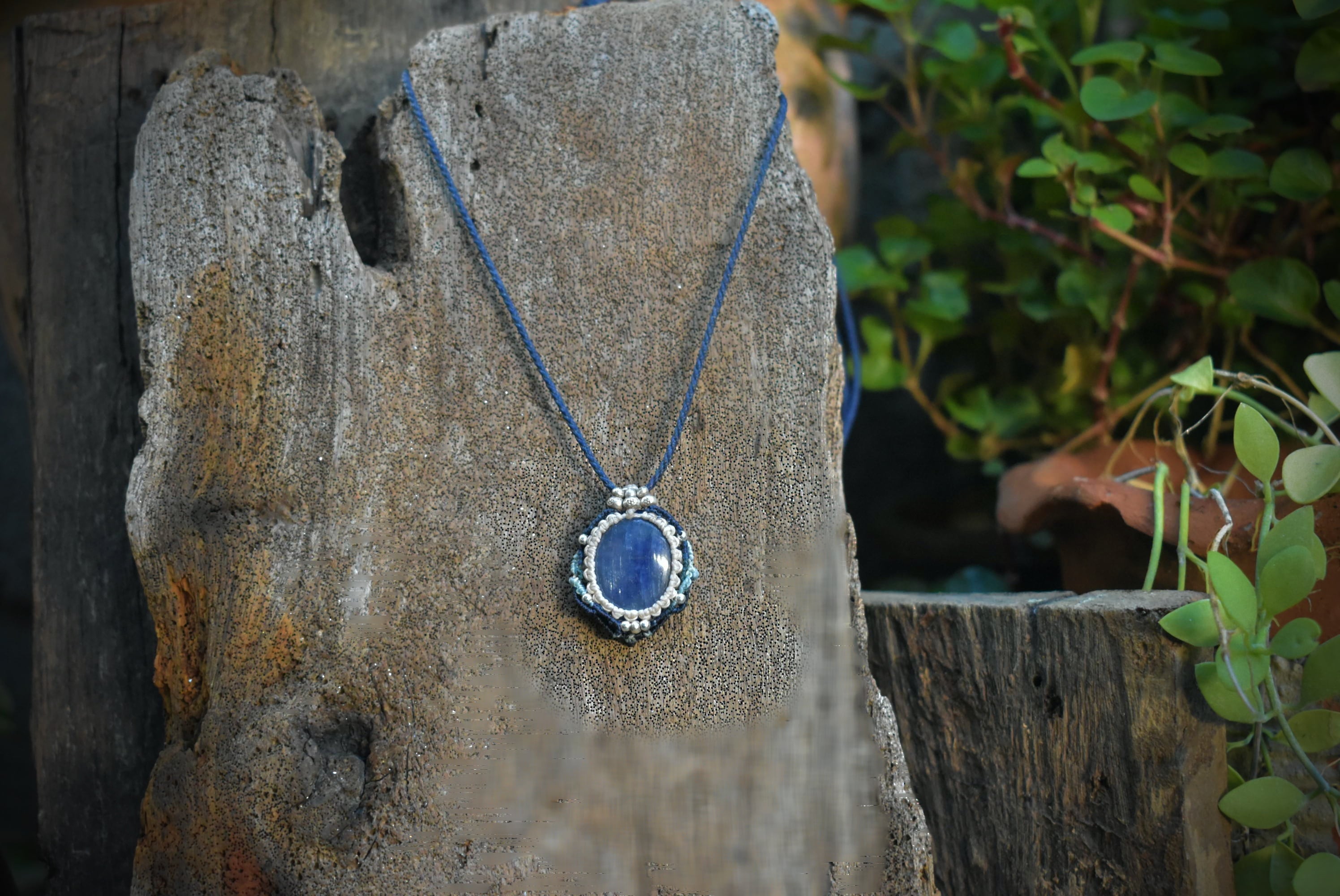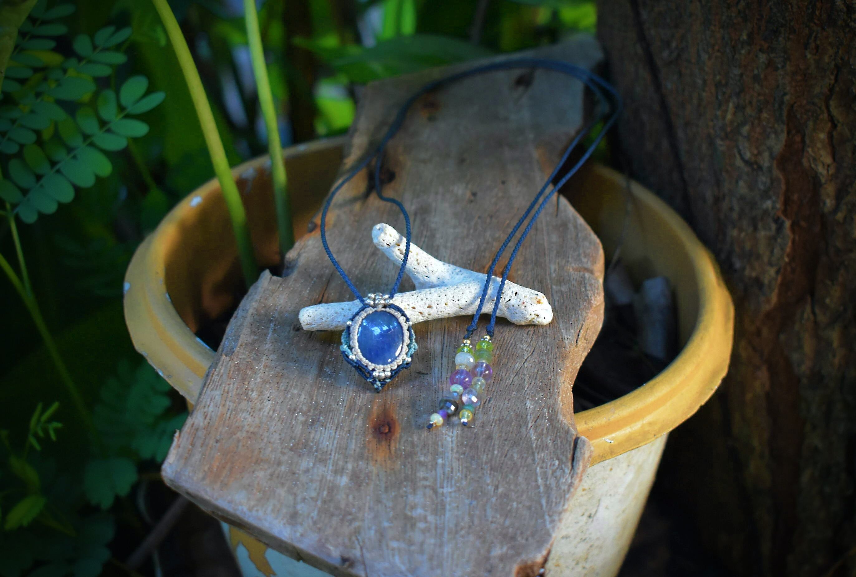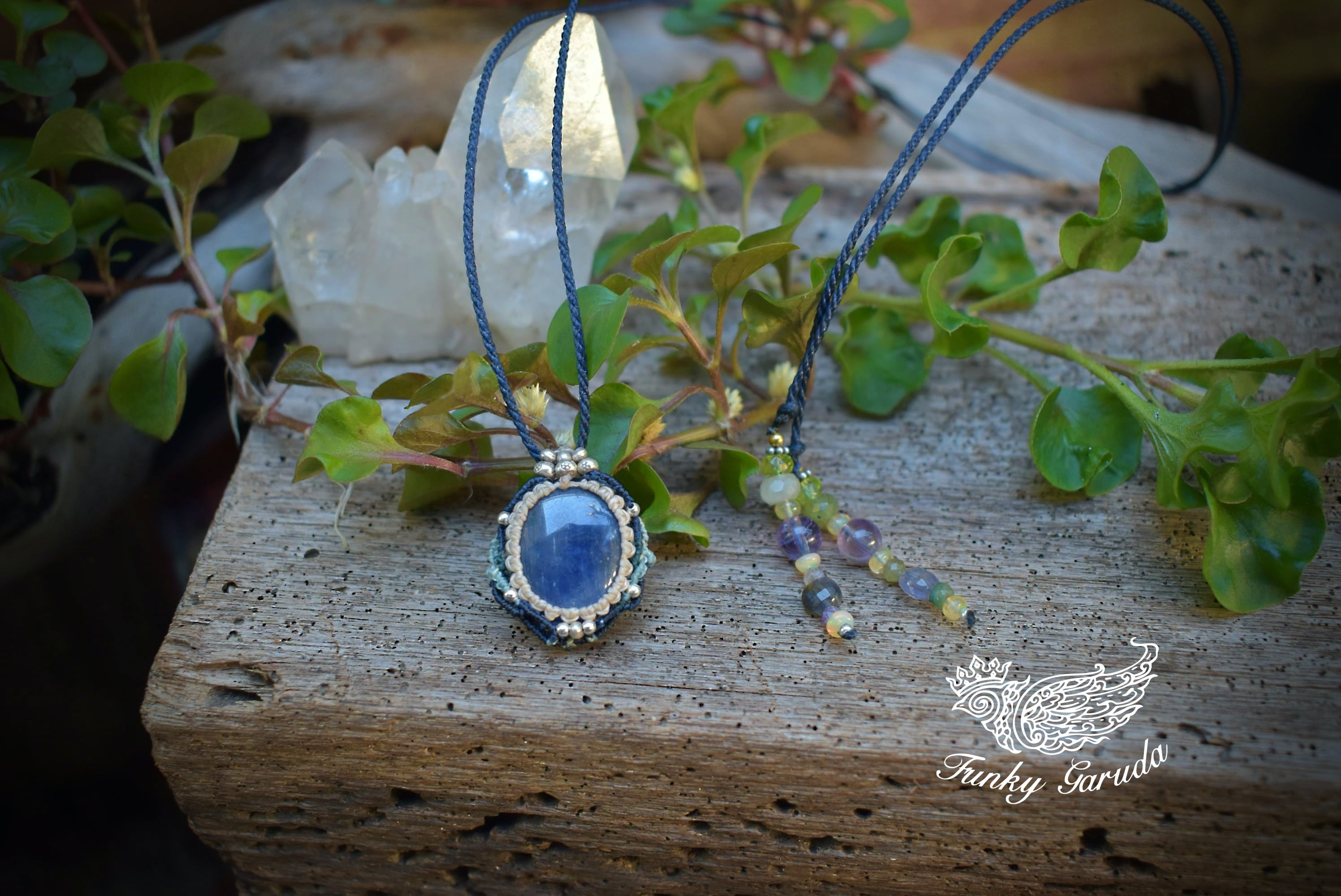 ギラリと輝くブルーの奇跡そのものです。石の周りをマクラメ編み装飾にて巻き込みました。