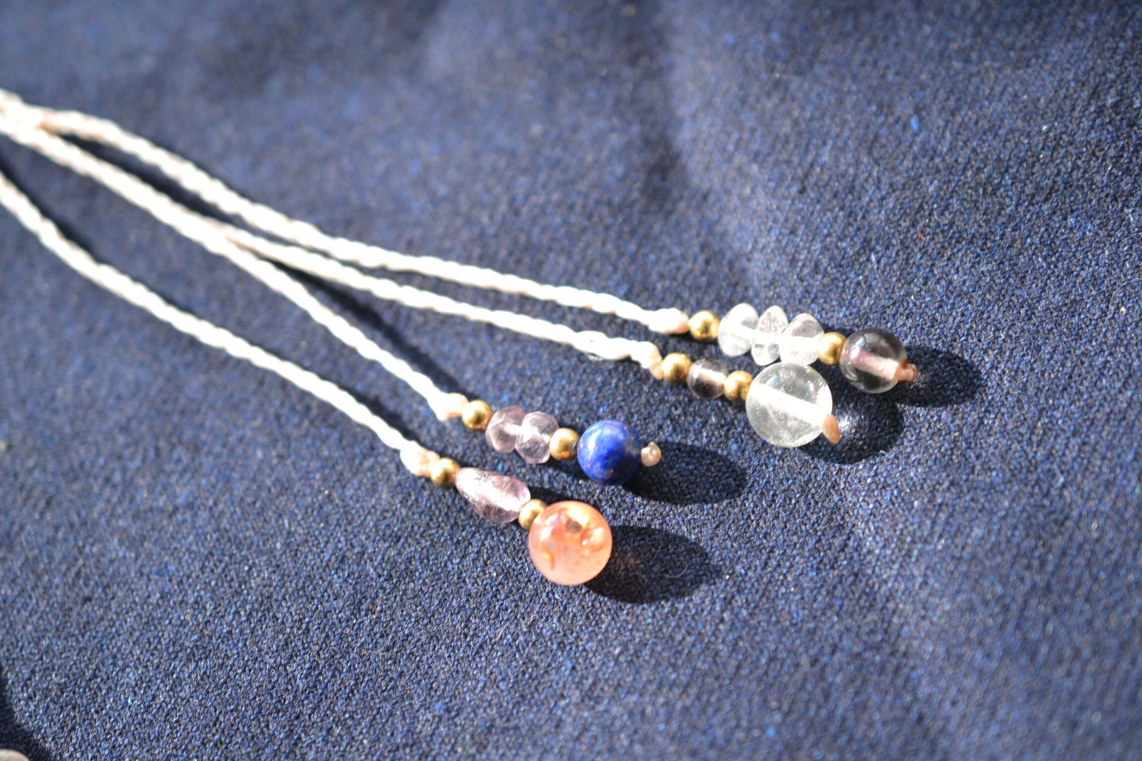 装着したときに、背守りとなる紐の先のエンド部分にはたくさんの天然石ビーズを散りばめました。