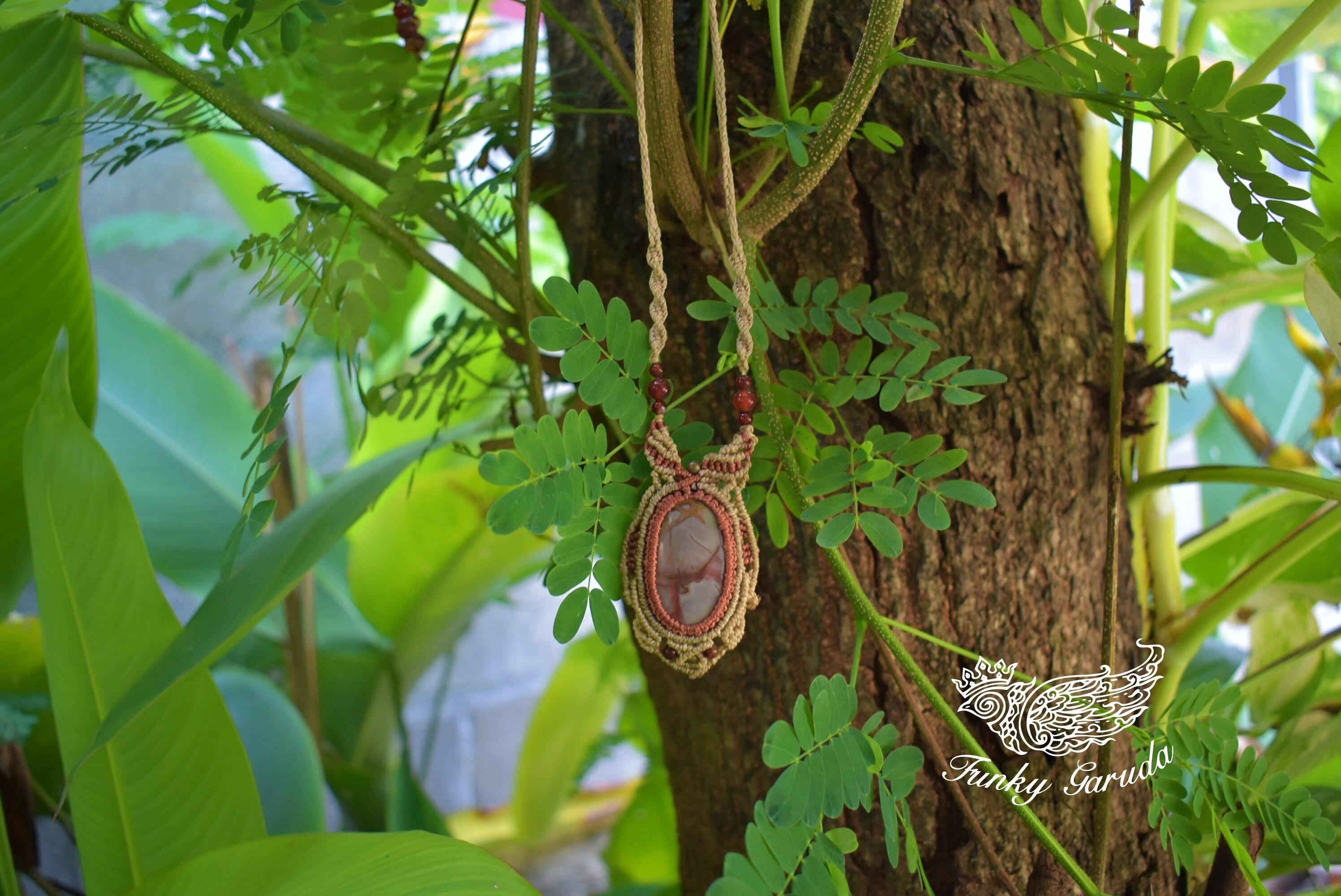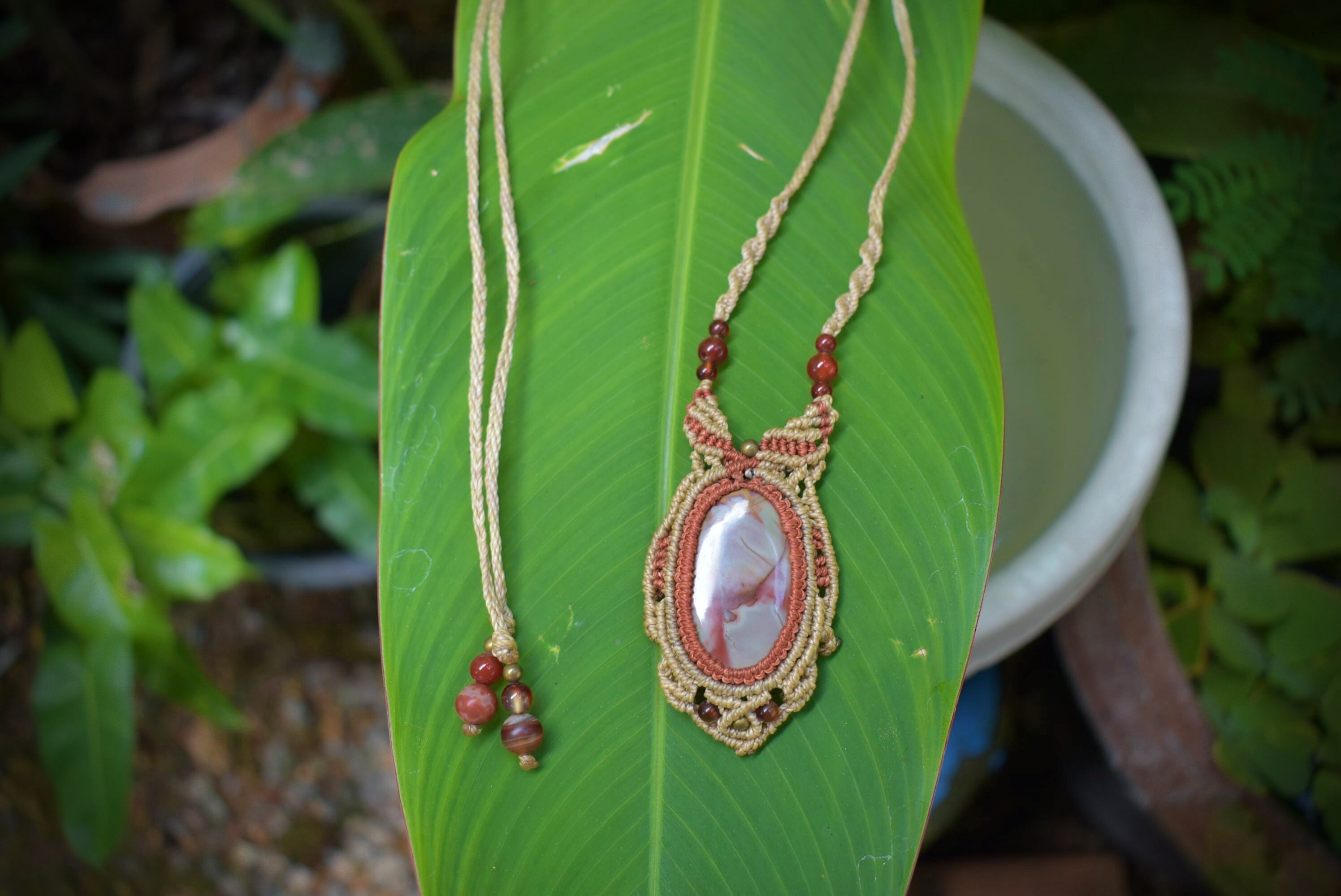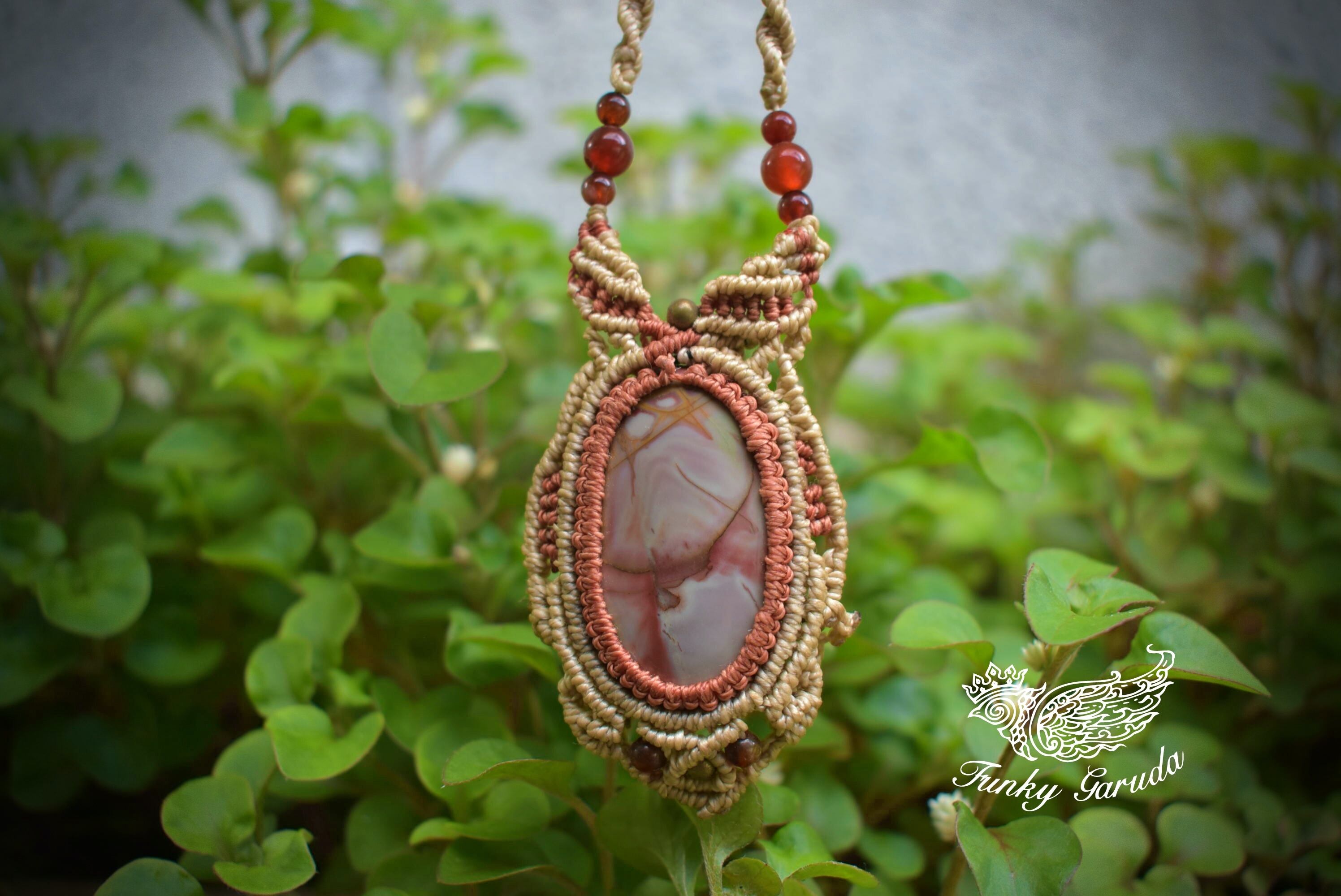 このたびのネックレスはインディアンスタイルにマクラメ編み装飾をしっかりと編み込んだもの。レッドスネークジャスパーの模様と色味をロウビキ糸と編み模様にて表現したネックレスになります。カーネリアンビーズをトッピングして胸元をオールドスクールなデザインが引き立つように編み込み、仕上げました。